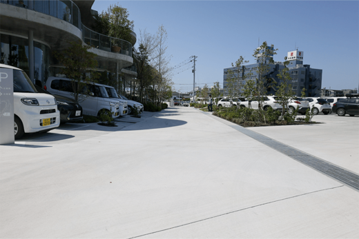 三島駅新幹線口から徒歩2分。加和太建設本社敷地をつんざくように伸びている三島市公道は加和太建設駐車場に採用されたものと同じコンクリートで舗装されています。本件は公道で公式にカーボンニュートラルコンクリートの施工見学会が開催された世界初の記念すべき場所となります