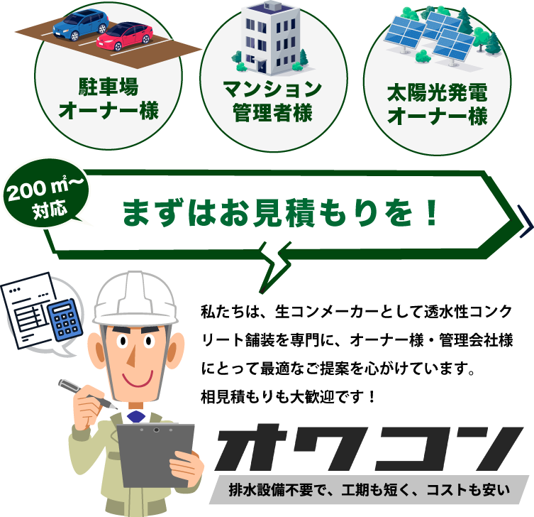特にアスファルト・一般土間コン舗装との比較では、排水工事費の有無で大きく差が出ますので、総額での比較をお勧めします。