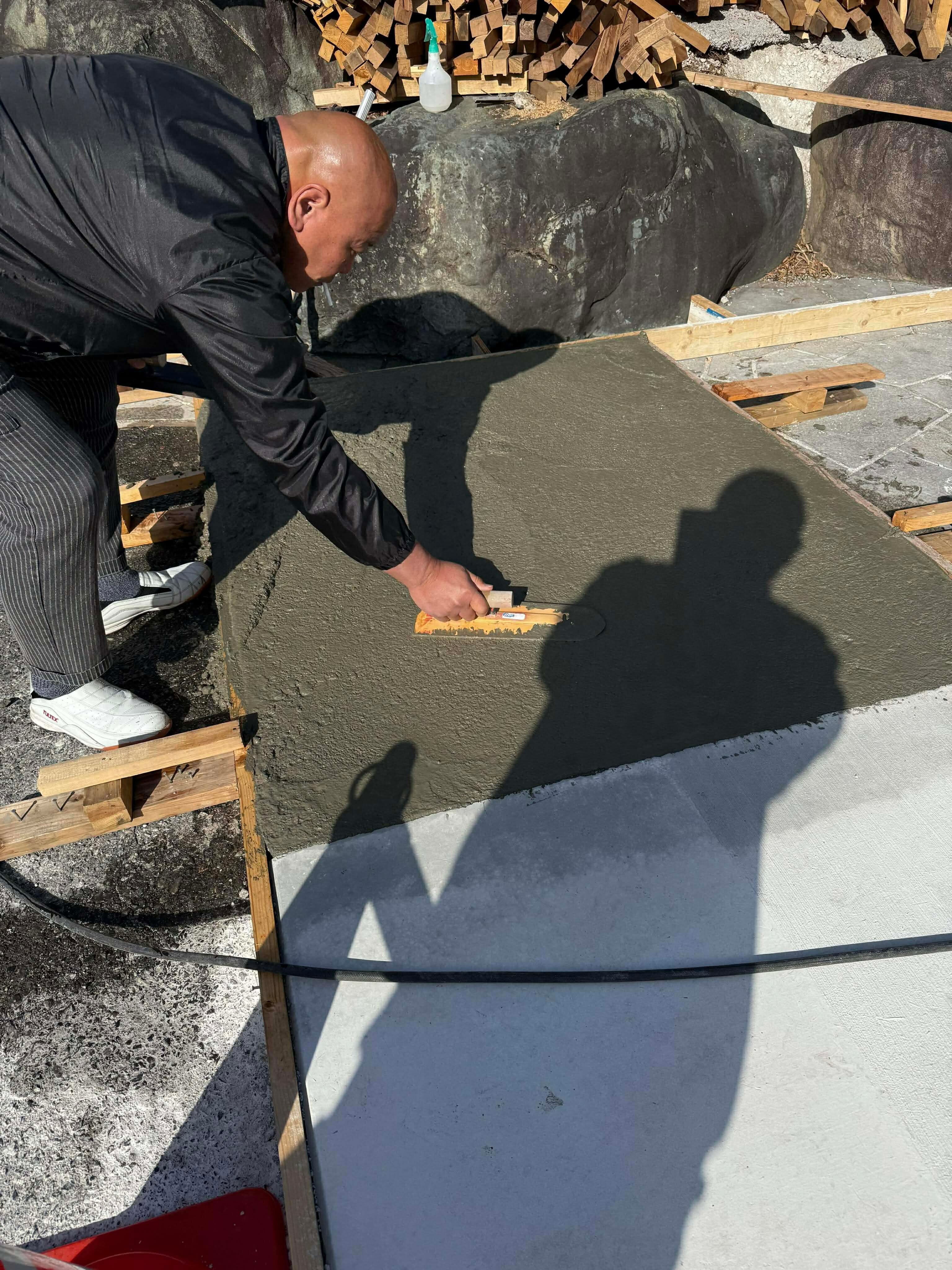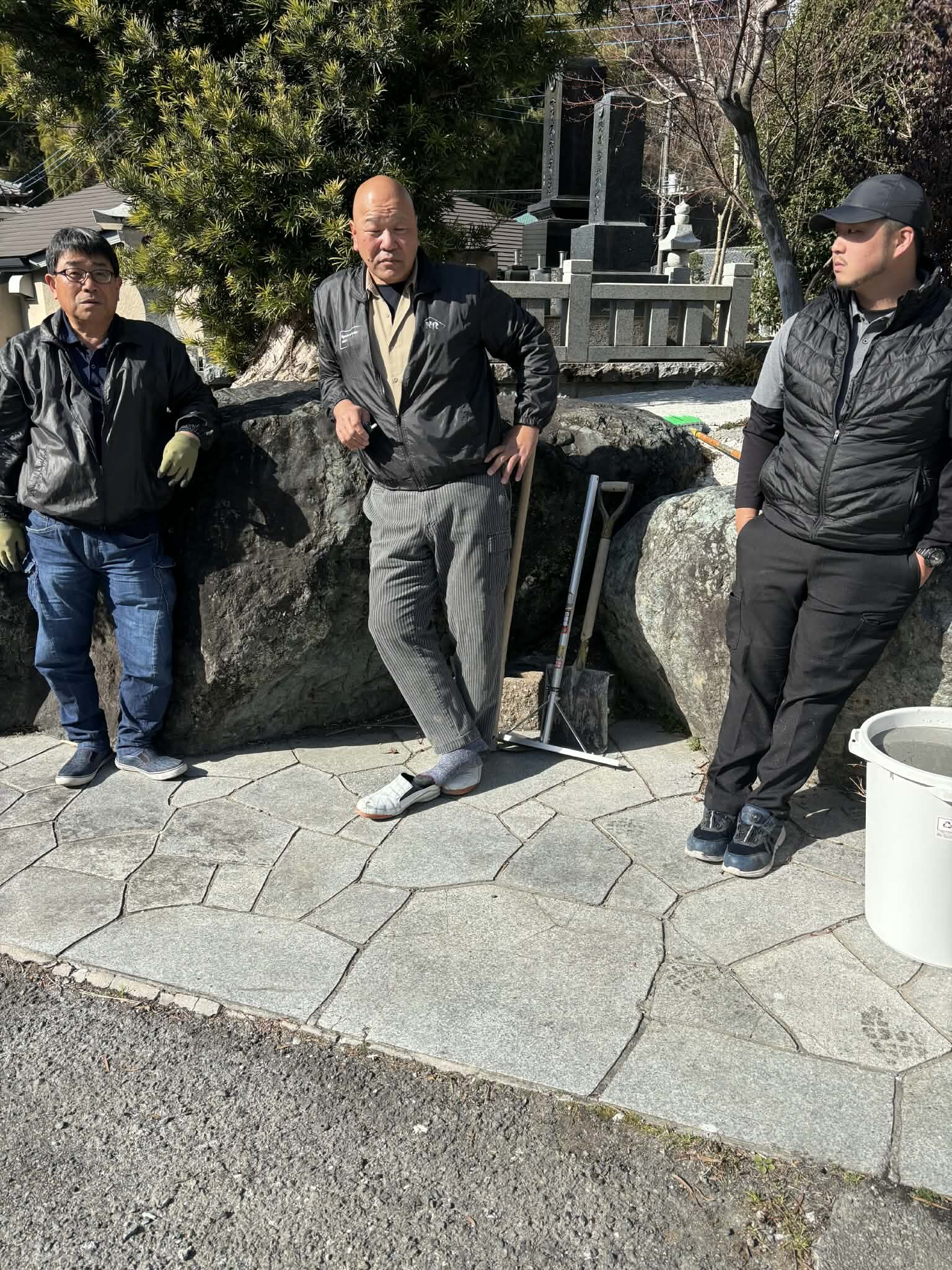 白い土間コンの普及を使命とするタスクフォース【白い直営ミツア】の構成員の皆さん、左からまさつぐ、遠藤さん、根上さん。さっきまで遠藤さんがもたれかかっている岩を三人で動かしていたのでちょっと疲れ気味の様子