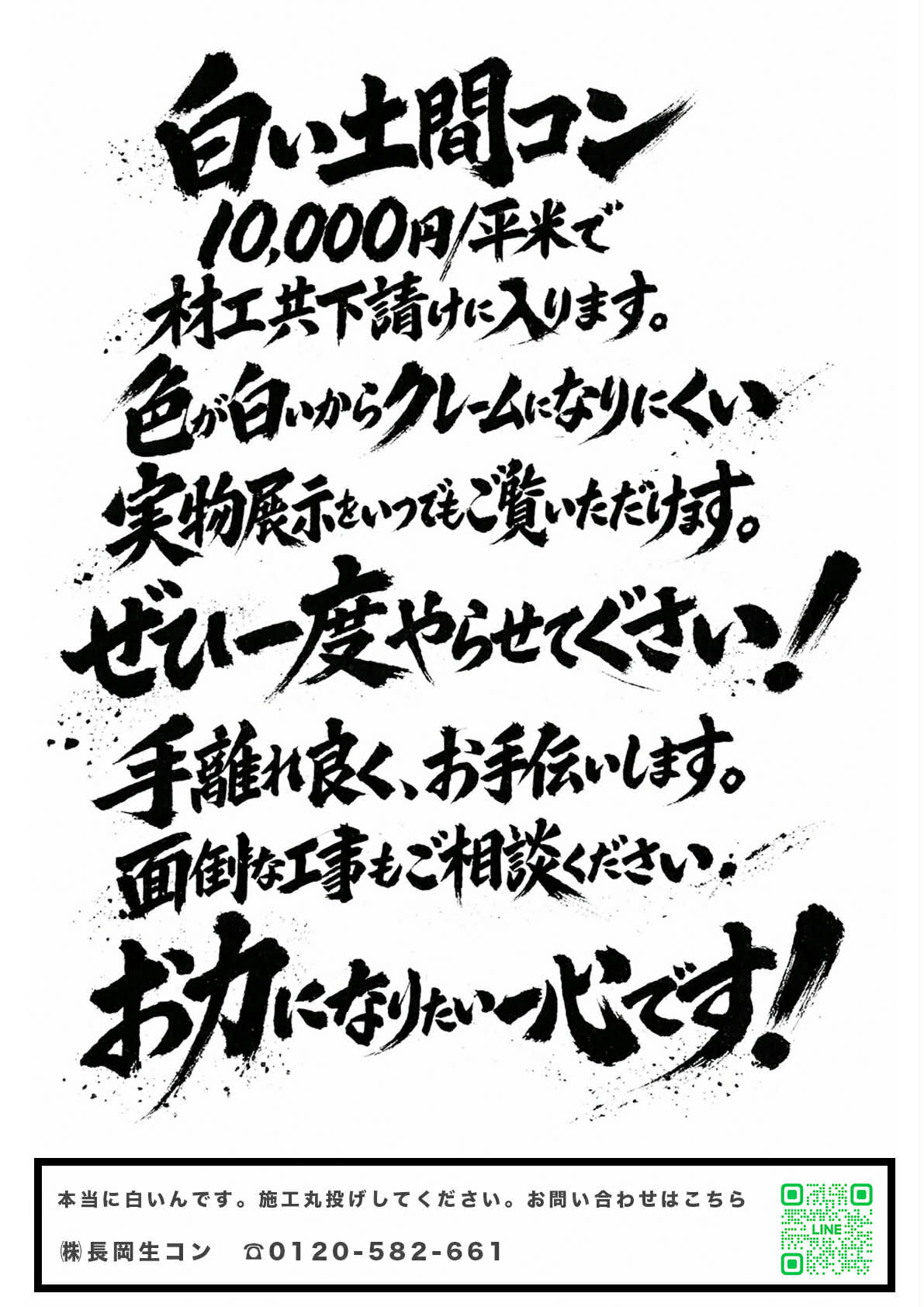 なお、本社所在地でもあるナマコンバレー(静岡県伊豆の国市長岡925)では普通の土間コンはもちろん、オワコン®︎まさ固®︎やオコシコン®︎なども展示されてありますので見比べることができます。 平米1万円材工共【白い土間コン】でも予算が厳しい? コスパ最強【オワコン®︎まさ固®︎】も選べる