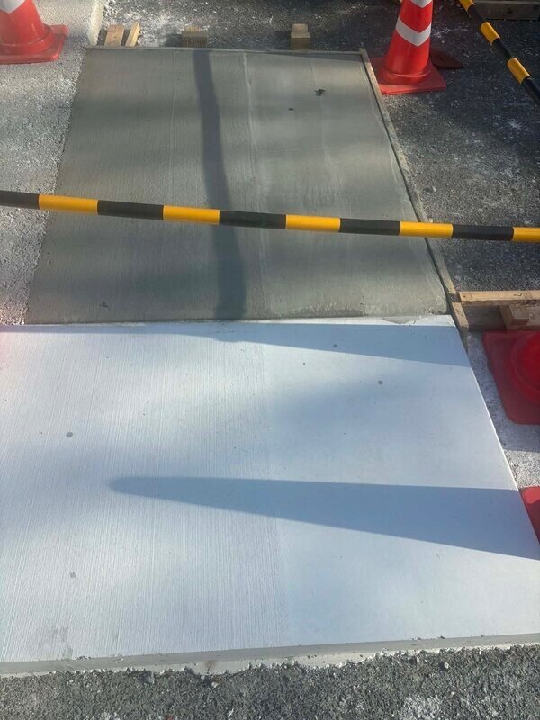 こちら、真っ白になる前の土間コン表面に現れる現象。青ければ青いほど、その後に現れる白さは純白に近くなります。 原材料が全て真っ白(高炉スラグ/炭酸カルシウム)なのに一時的に真っ青になる白い土間コン