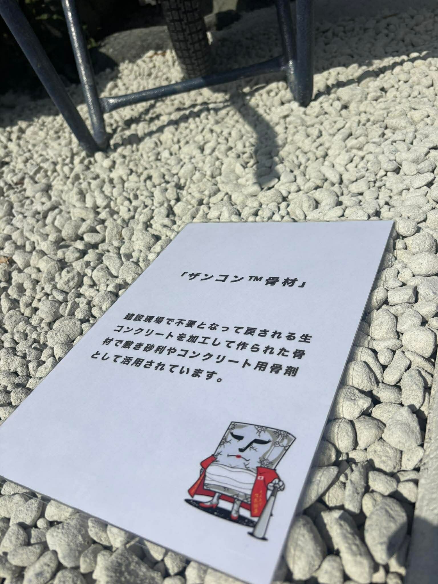 ザンコン™︎骨材は生コンの副産物残コンを由来とした骨材でイタリア風砂利道のような空間を再現しています。なお、CO2をたっぷり固定しているのでCCU材料(骨材)として白い土間コン™︎にも配合されています