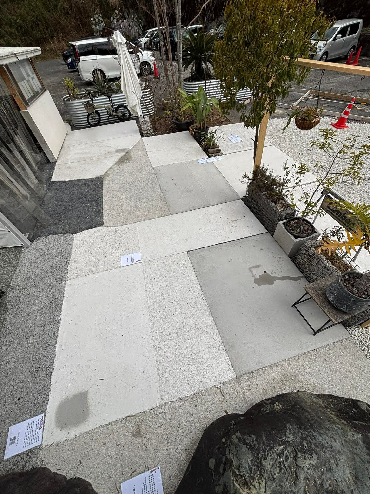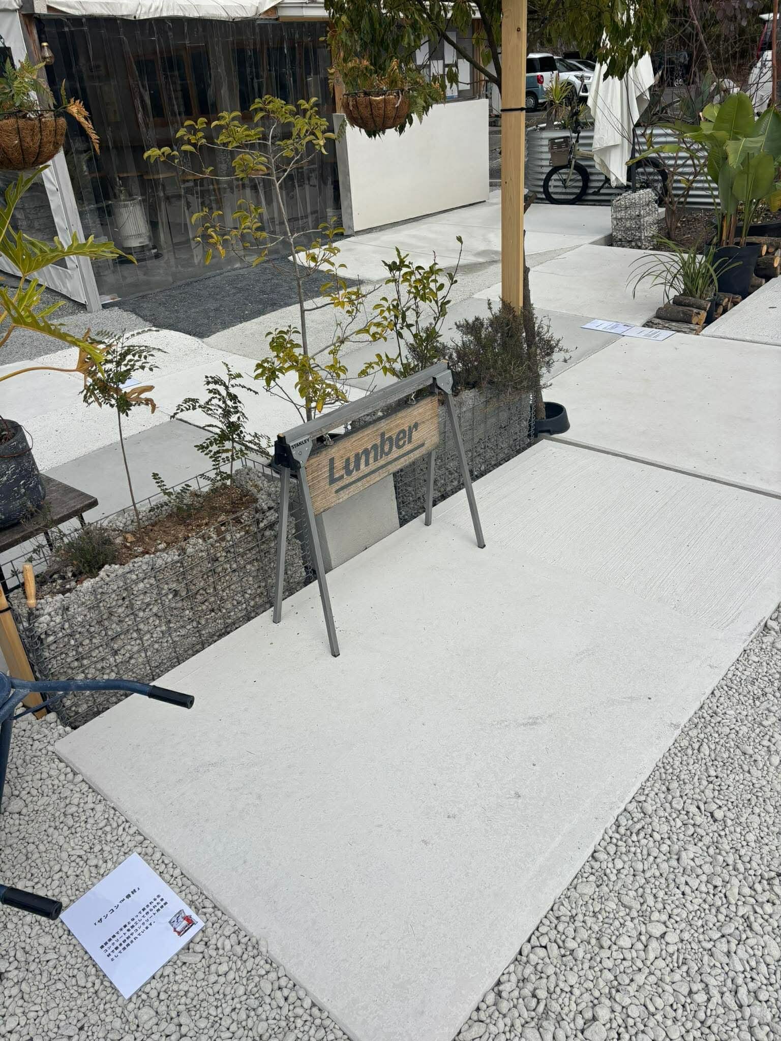 まだまだいろんなタイプの土間コン™︎の設置が予定されています。イタリアの砂利道のように敷き詰められているのはザンコン™︎骨材はたっぷり二酸化炭素を固定して炭酸カルシウムとなった敷き砂利です