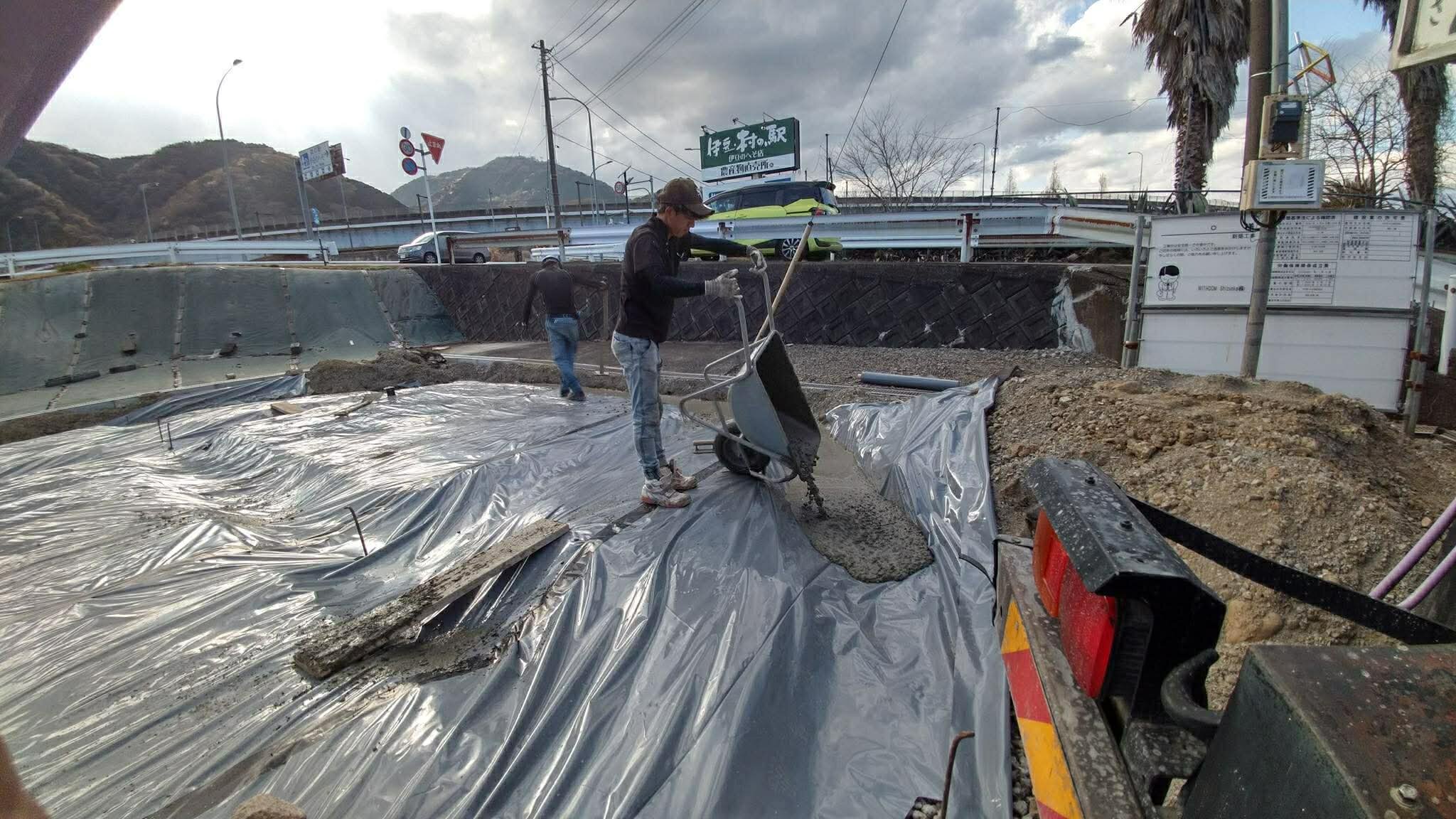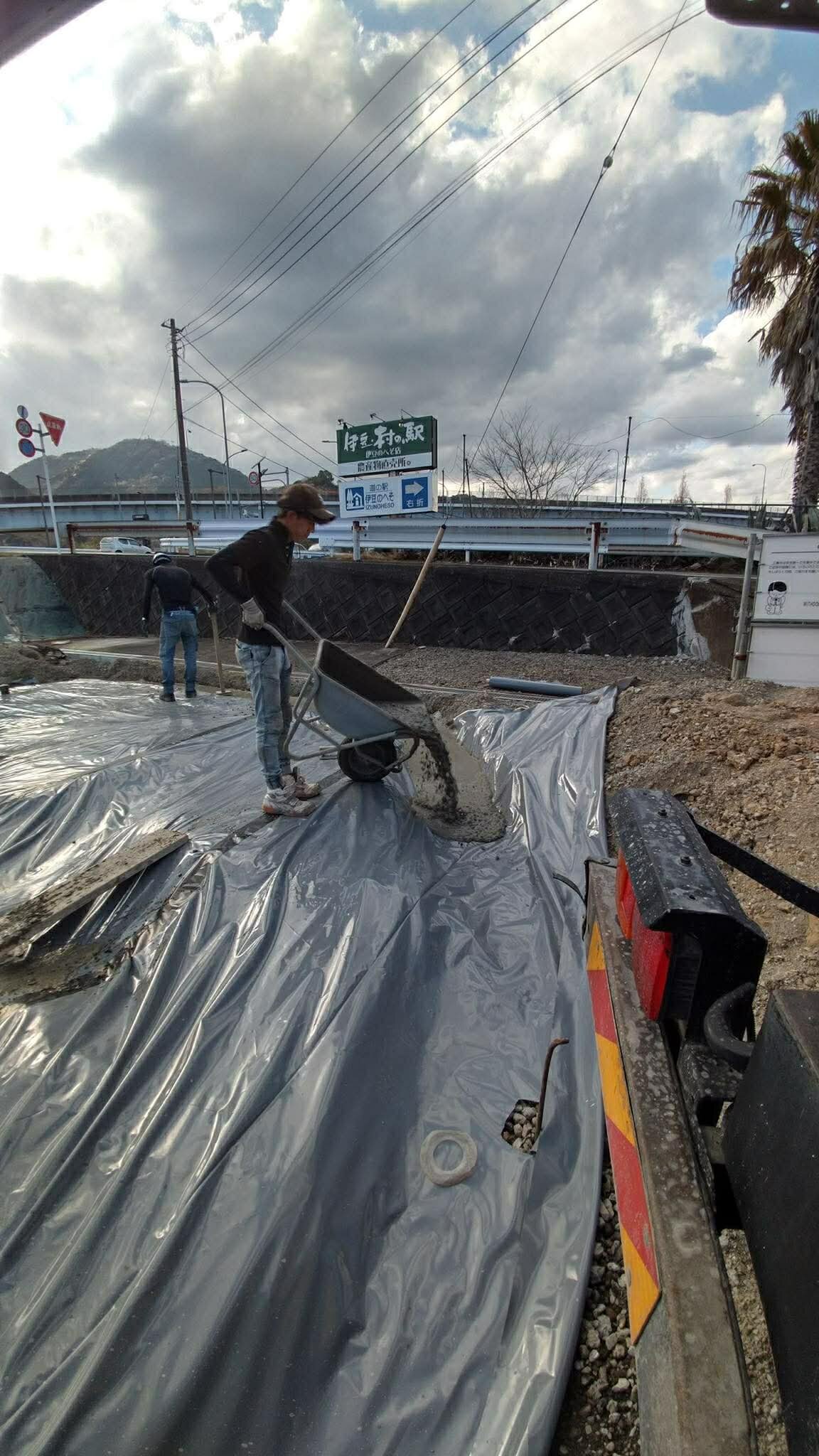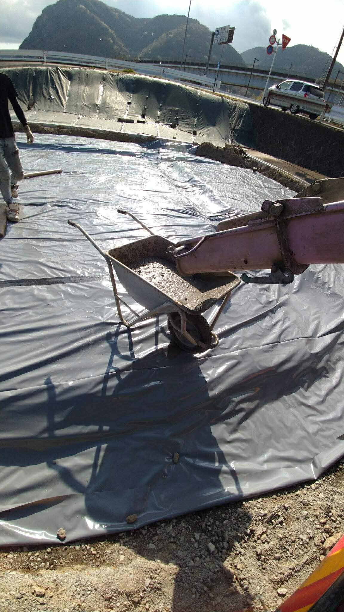 例えば写真のように構造物ではない嵩上げが目的のような場合に求められる生コンは通常貧配合の生コンが用いられる一方、余る生コンの大半は富配合の現場だったりする