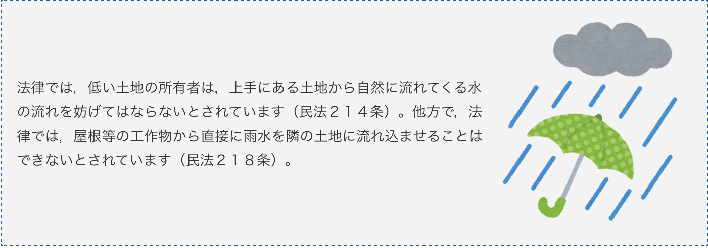 民法218条「土地の所有者は、直接に雨水を隣地に注ぐ構造の屋根その他の工作物を設けてはならない。」