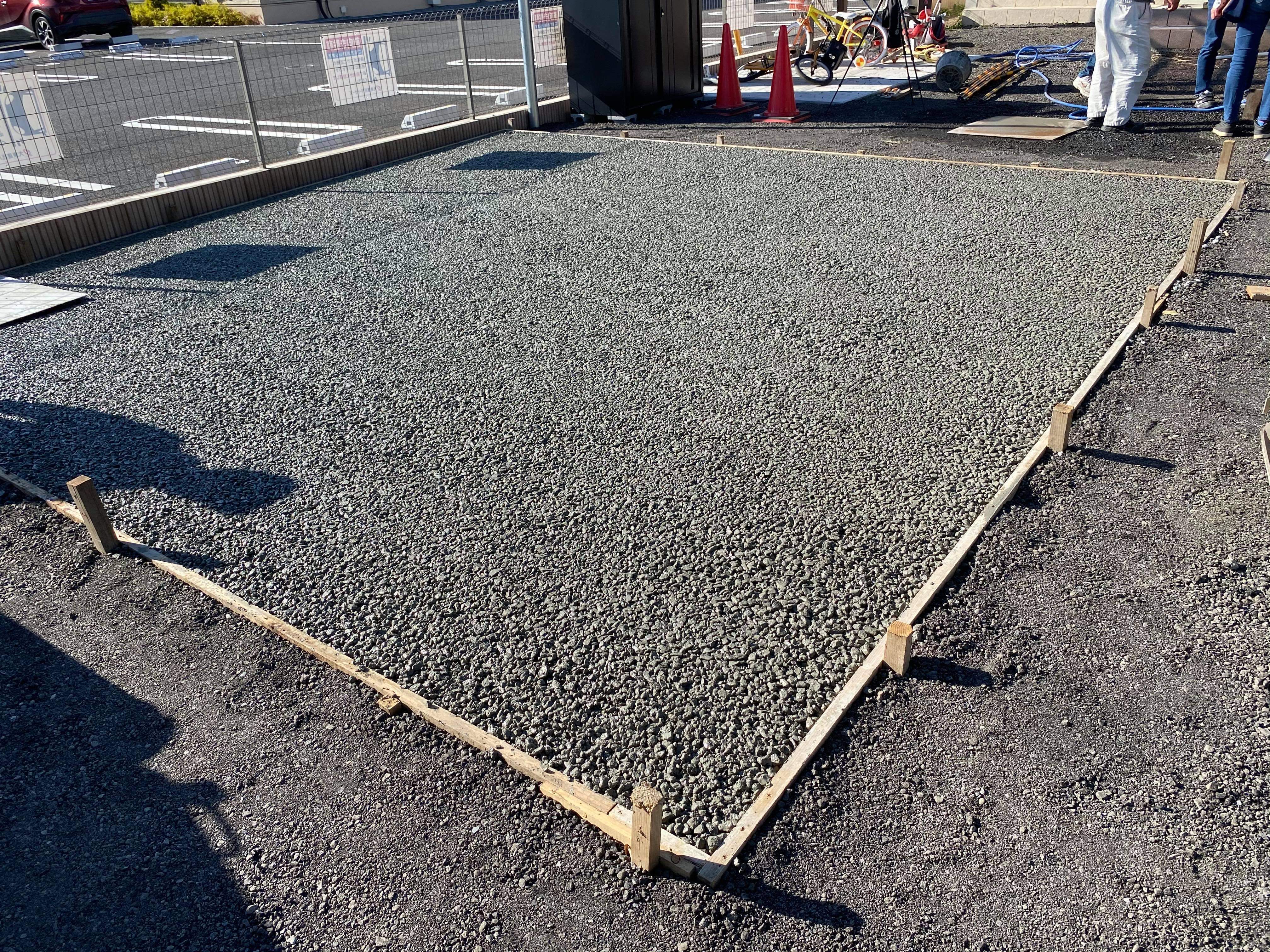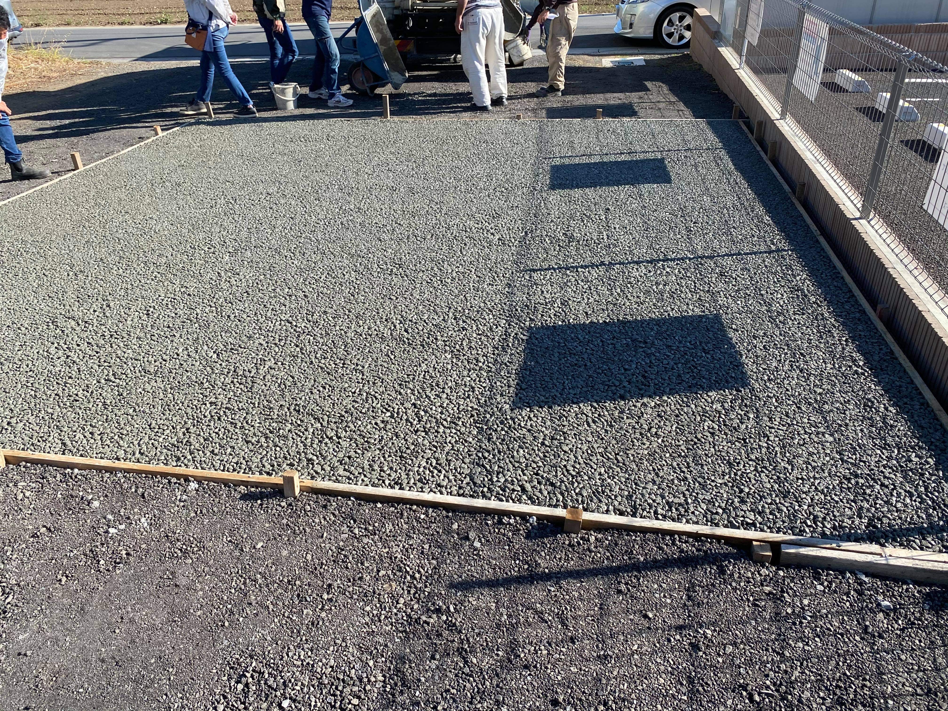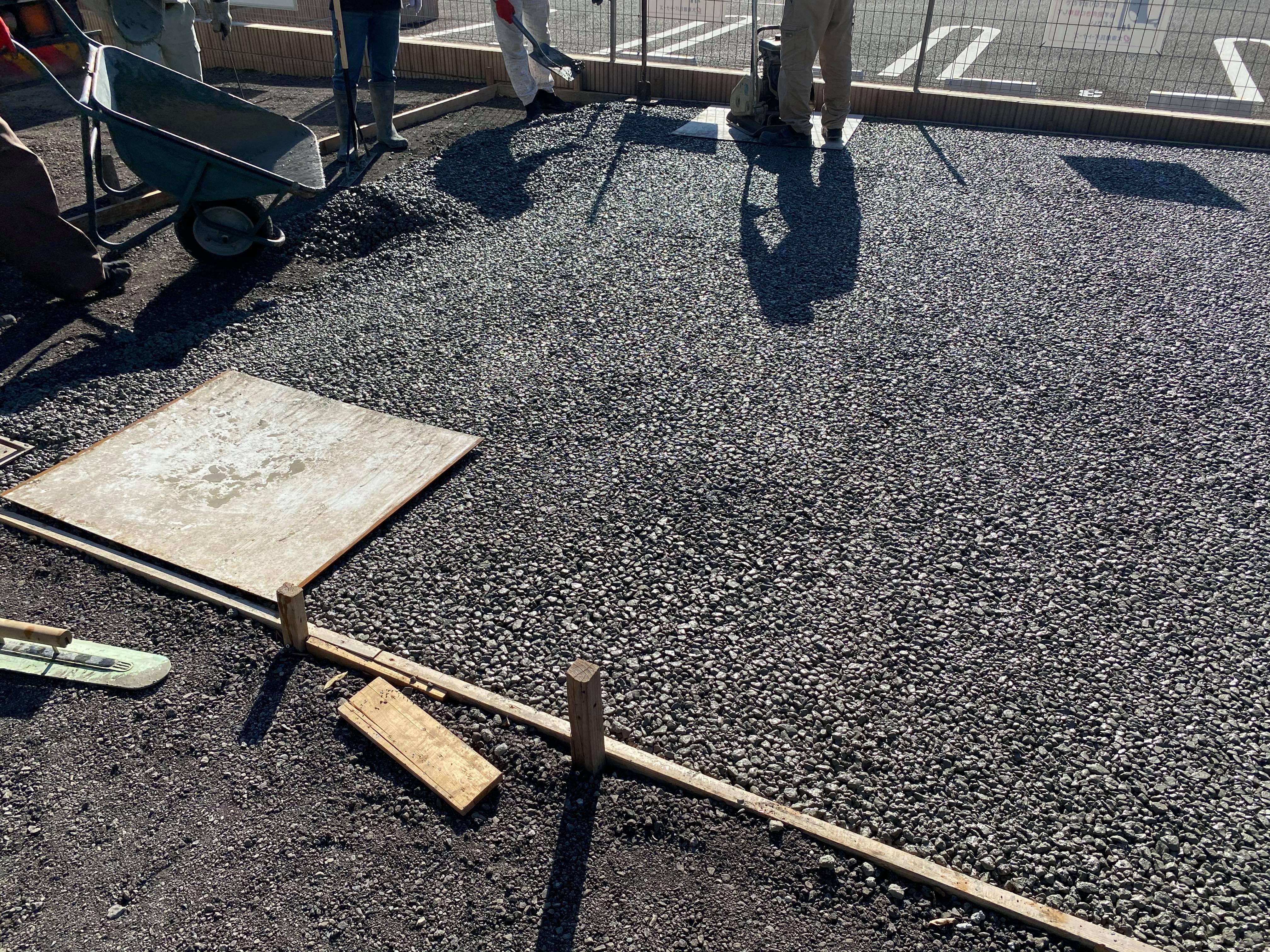 今回は大谷造園大谷さんの計らいで、「ぶっつけ本番は嫌だから自社駐車場にドライテックを施工して練習を兼ねたい」と見学会の開催とあいなった。
