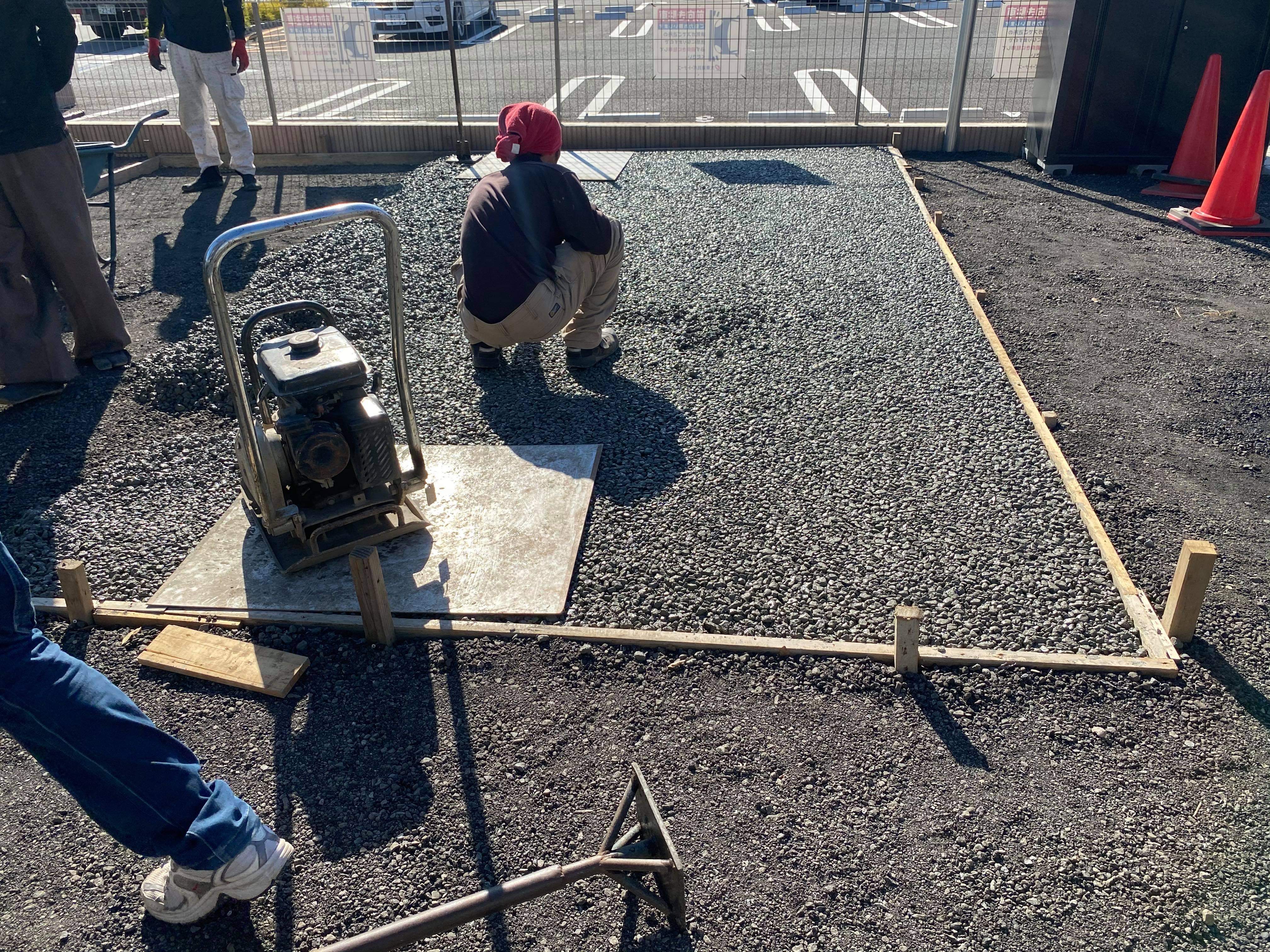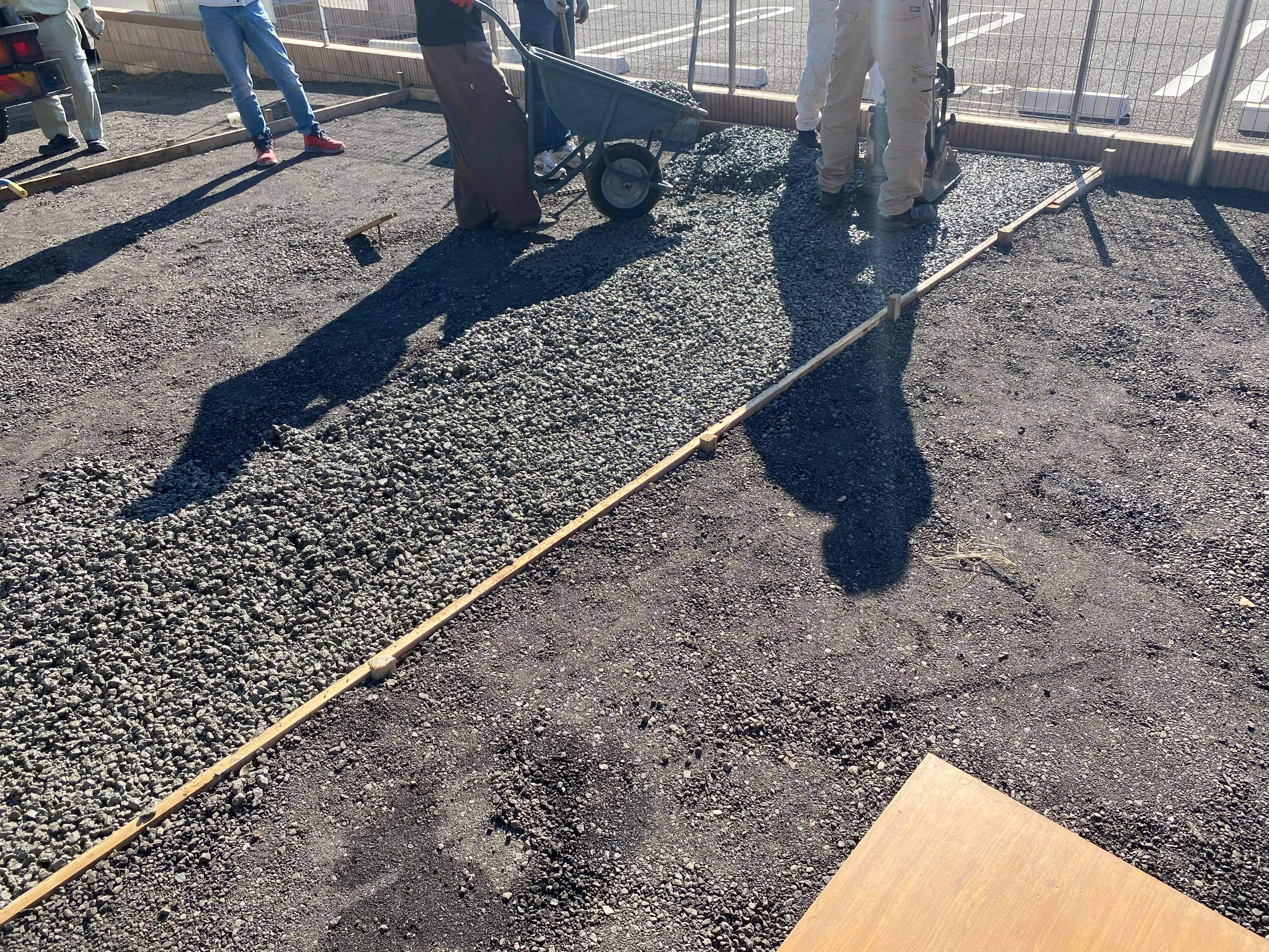 埼玉県大郷郡。本番の案件を控え大谷造園大谷さんが自社駐車場に練習を兼ねて試験施工。加えて、この現場は近隣施工者らに見学会として開放され、駆けつけた日幸産業柏木さんもその場で庭コン登録を了承。広がる施工者の輪。