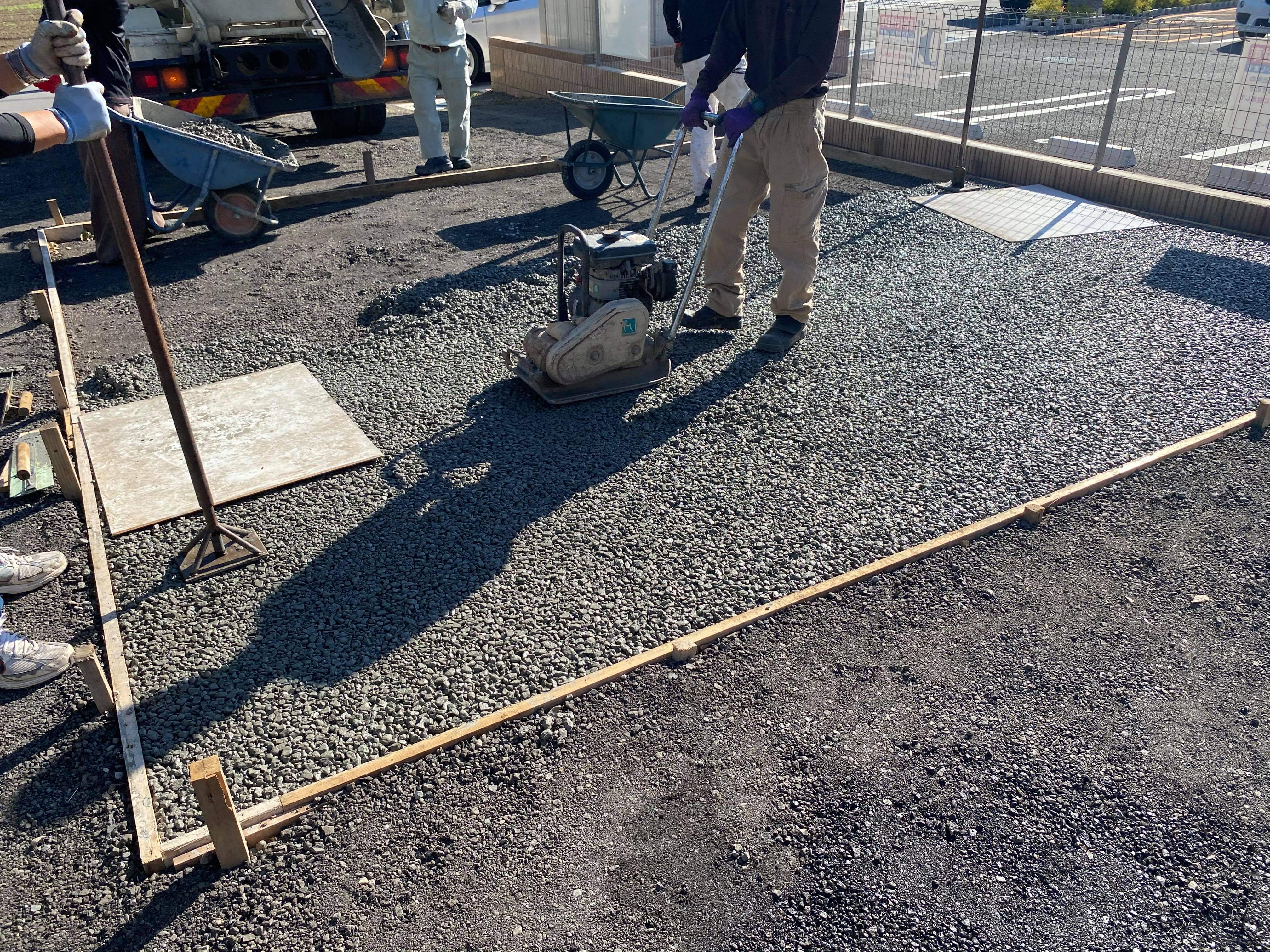 敷設された材料をトンボで平坦に均し、その上をプレートコンパクタ(30kgタイプ)で締め固めるだけ。