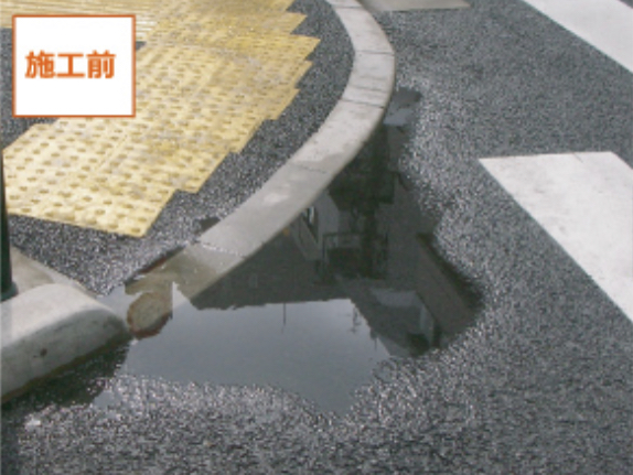 埼玉県内某交差点。市道のエプロン部。交差点内のエプロン部4箇所のうち、水たまりが特にひどい2箇所に採用された。エプロン部で透水させて、側溝に流れ込む構造になっている。設計では透水性アスコンだったが地域の方から、「コンクリートの方がいいよ」という提言があり、ドライテック採用。