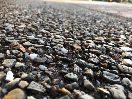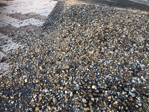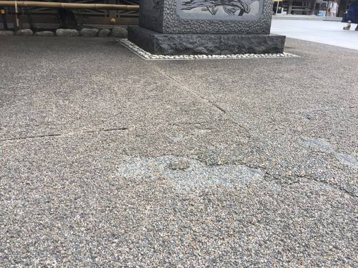 天然石舗装は数年経つと紫外線劣化などの影響で人がよく出入りする場所は特に骨材が飛散してしまうのはバインダーが無機系だからであり、ドライテックのようなセメント・無機系バインダー舗装には起きない現象