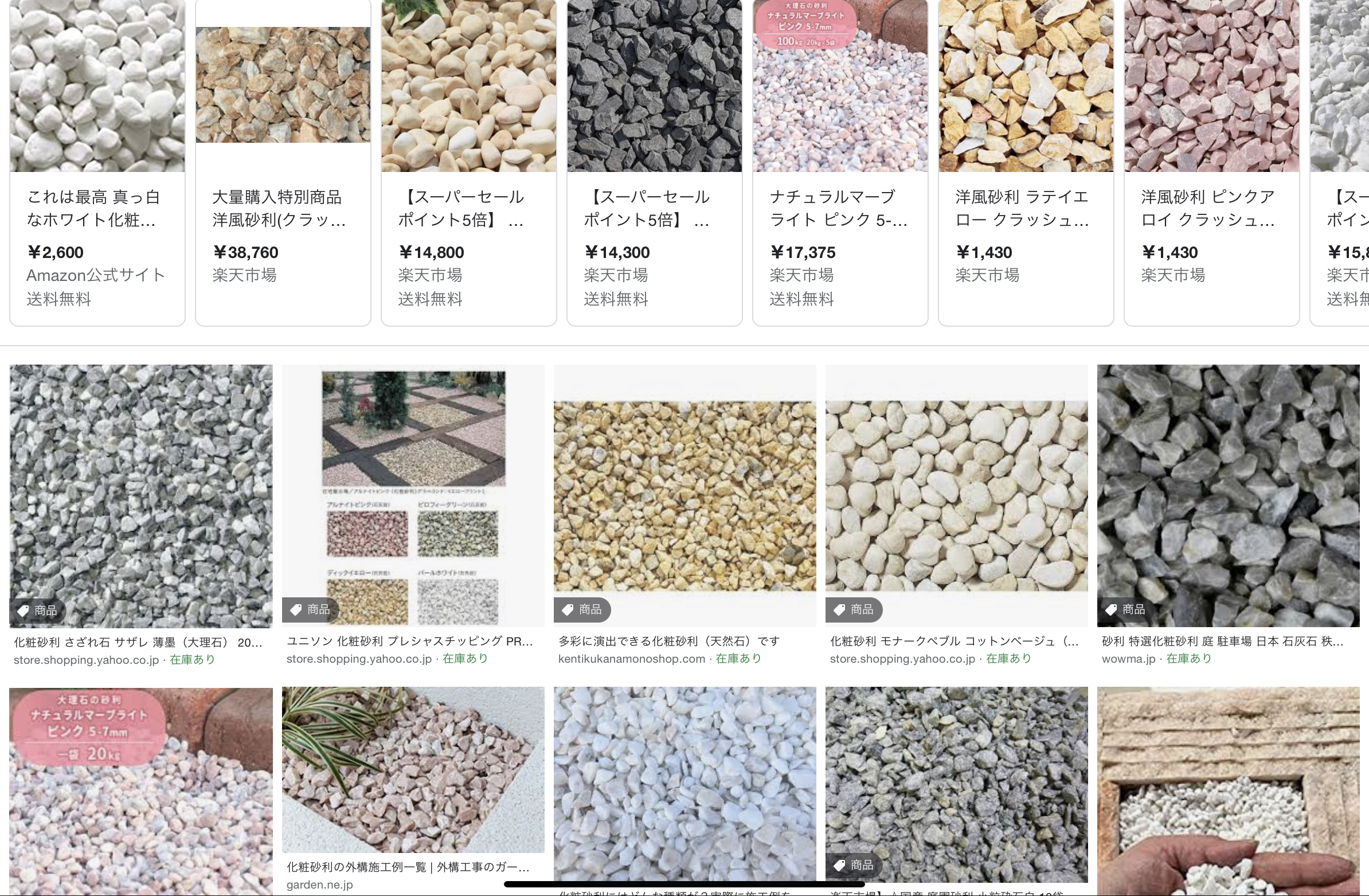Google画像検索で「化粧砂利」と調べると表示される美しく色とりどりの自然造形。