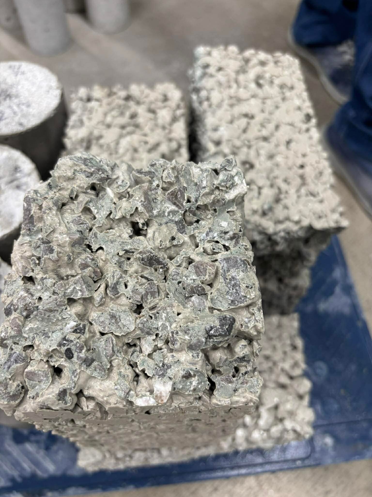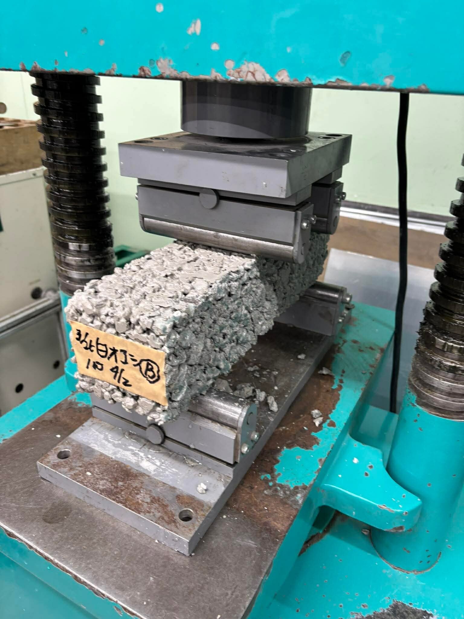ナマコンバレーに設置されてある環境負荷ゼロの排水性土間コン™︎ オコシコン®︎(結合材に普通ポルトランドセメントを用いず100%副産物高炉スラグ微粉末(エスメント)を配合しアルカリ刺激剤として改質スラッジ(ジョイスラッジ)を適用したポーラスコンクリート)の強度結果が出ました