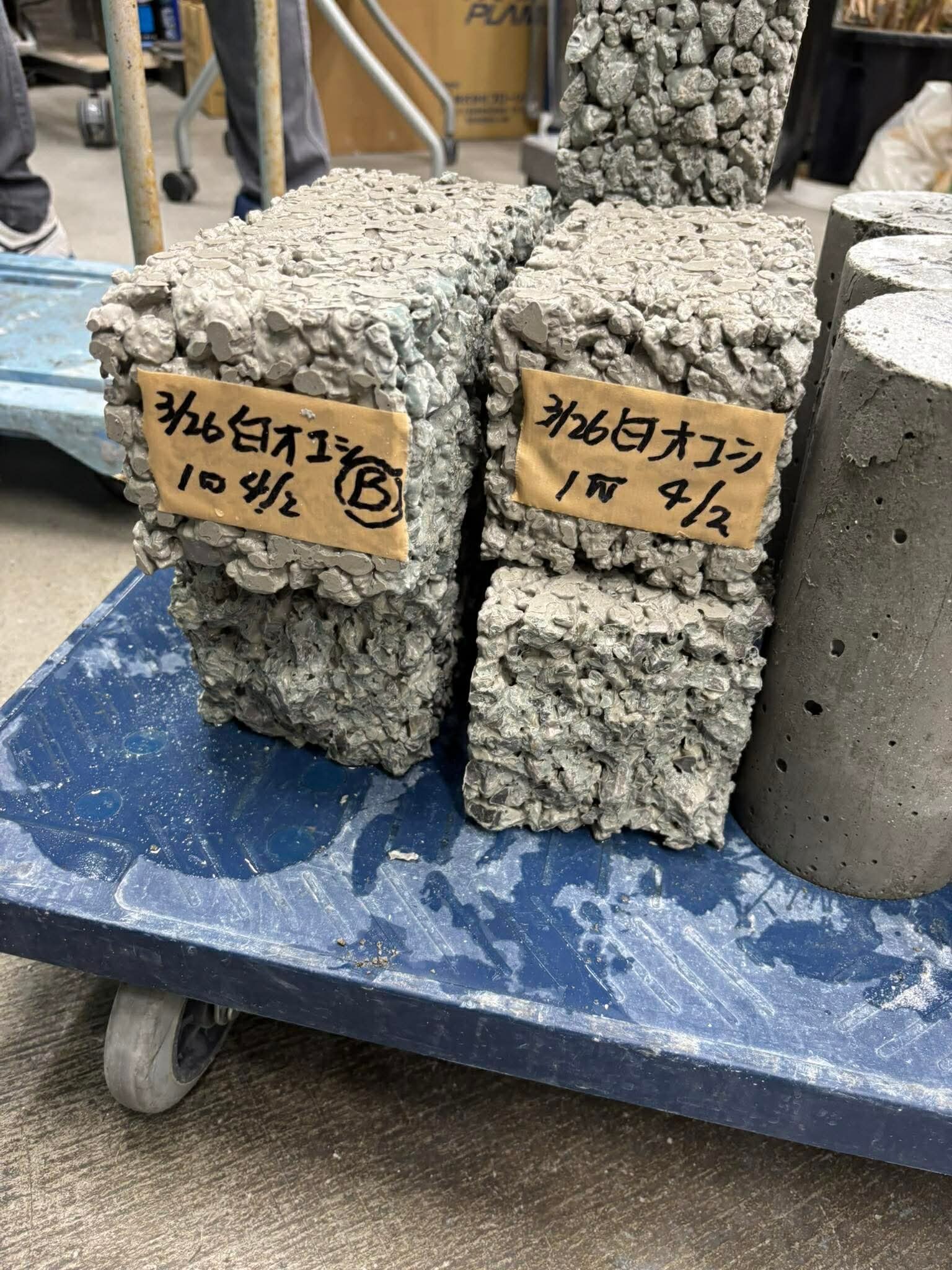 呼吸するコンクリート(透水性-ポーラス構造)でありながら環境負荷ゼロ(原材料はすべて副産物)を達成したオコシコン®︎の色は白色でした。強度も全く問題ありません