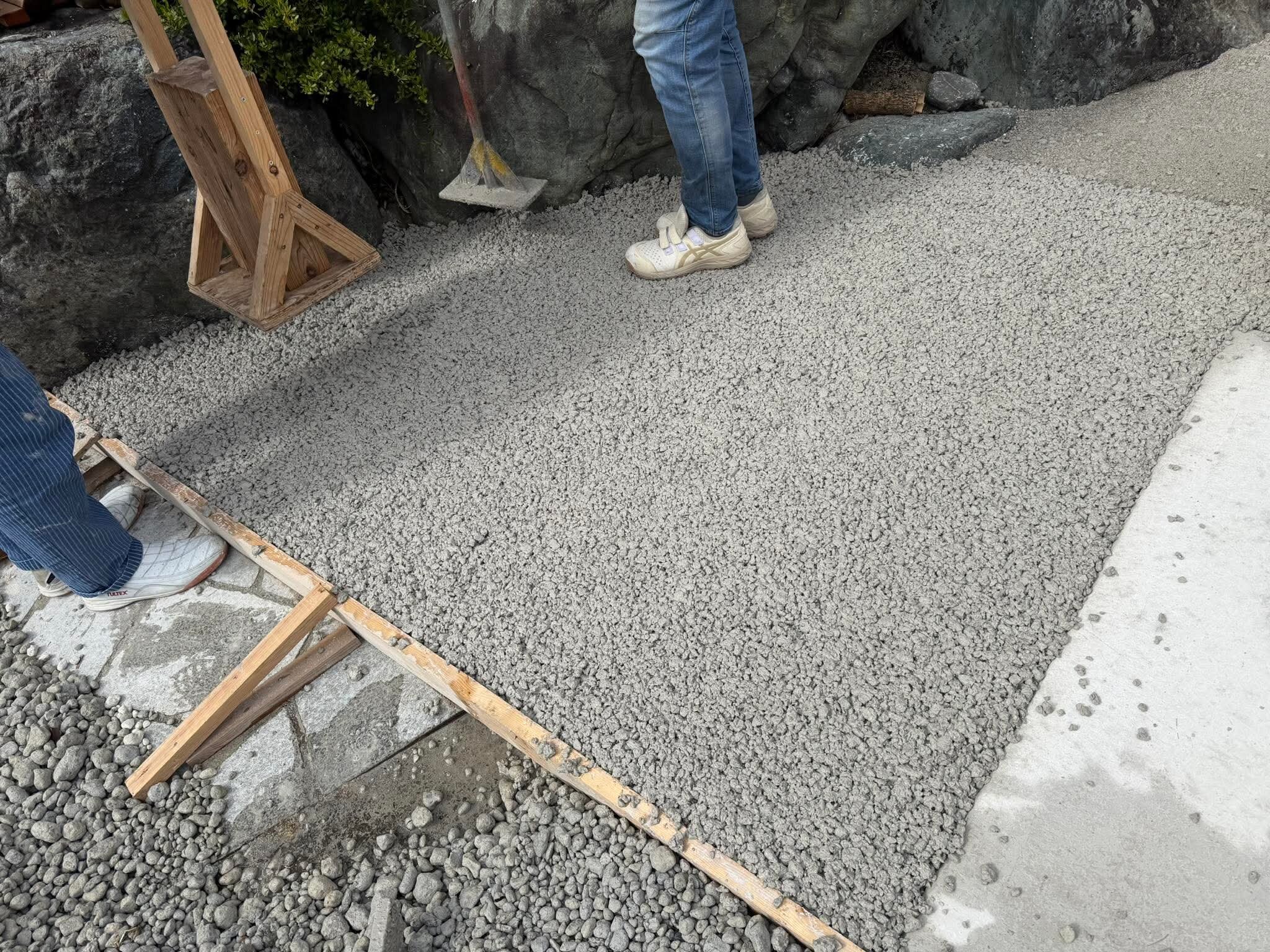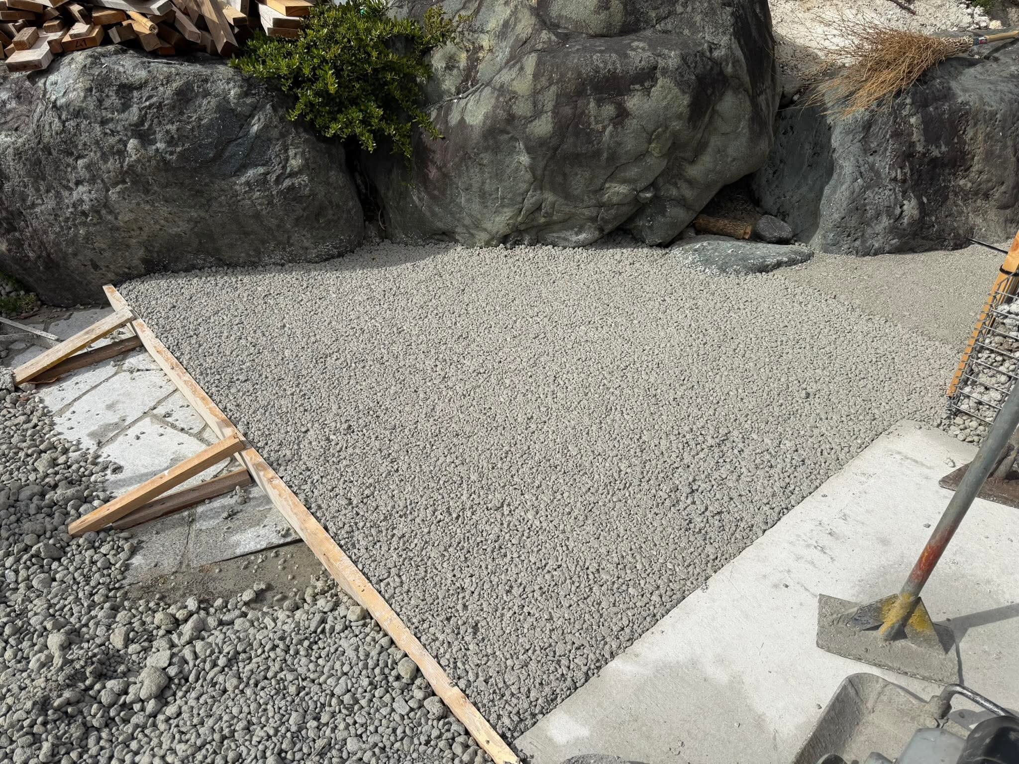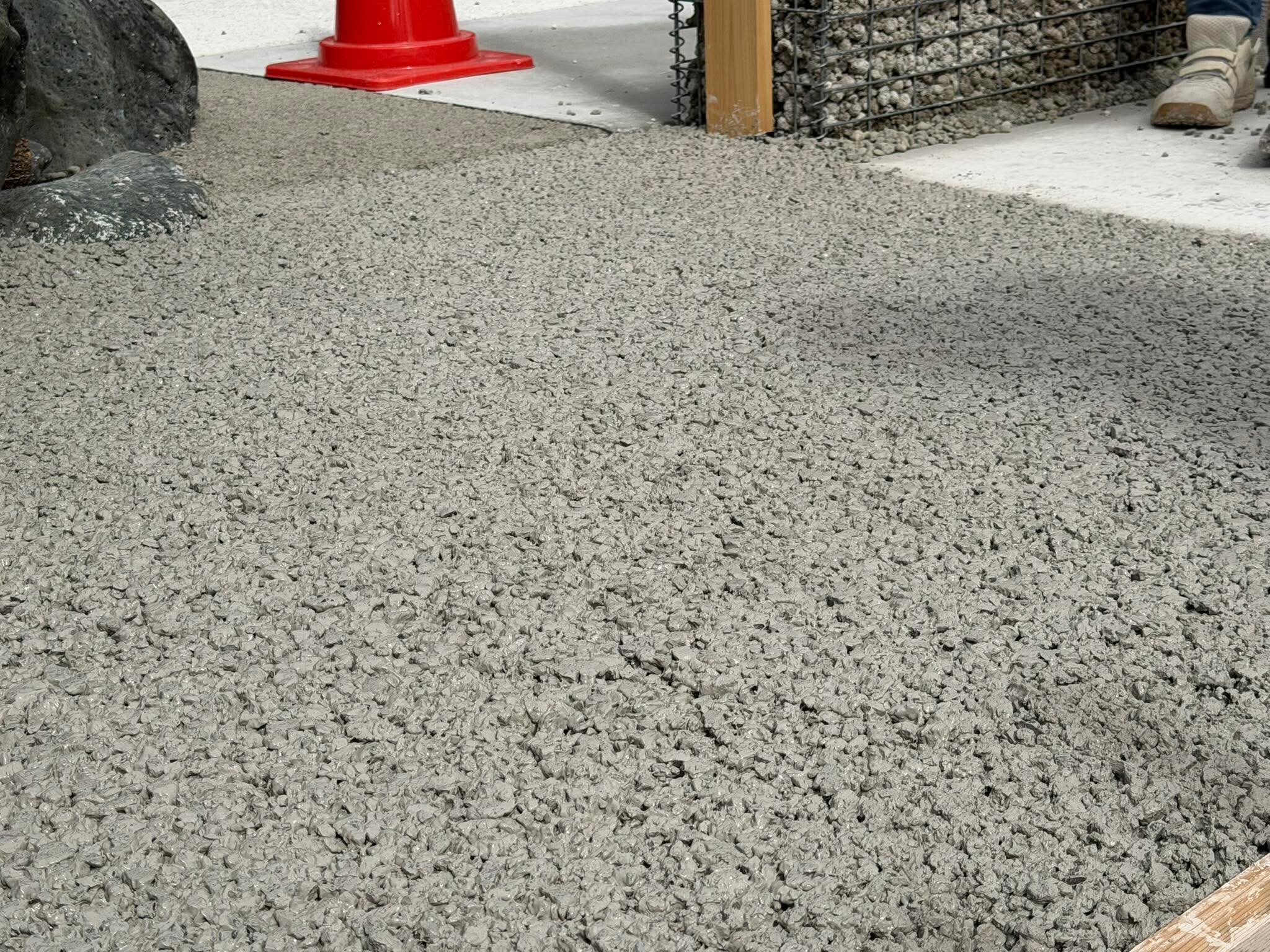 手前は白い土間コン™︎(非排水性)との違いはその仕上がり。ゴツゴツと粗野なテクスチャは水を通す為の空隙によるもの