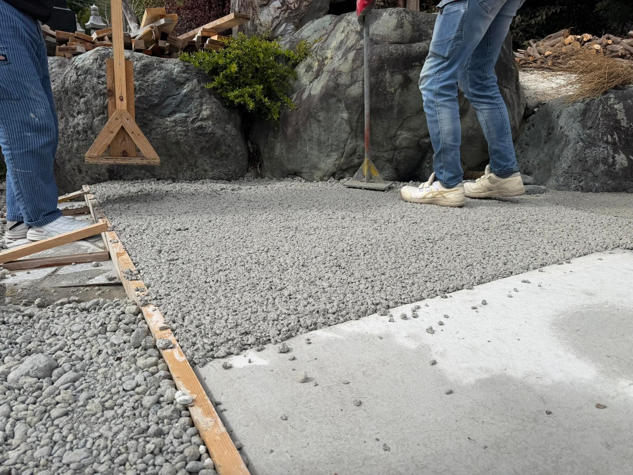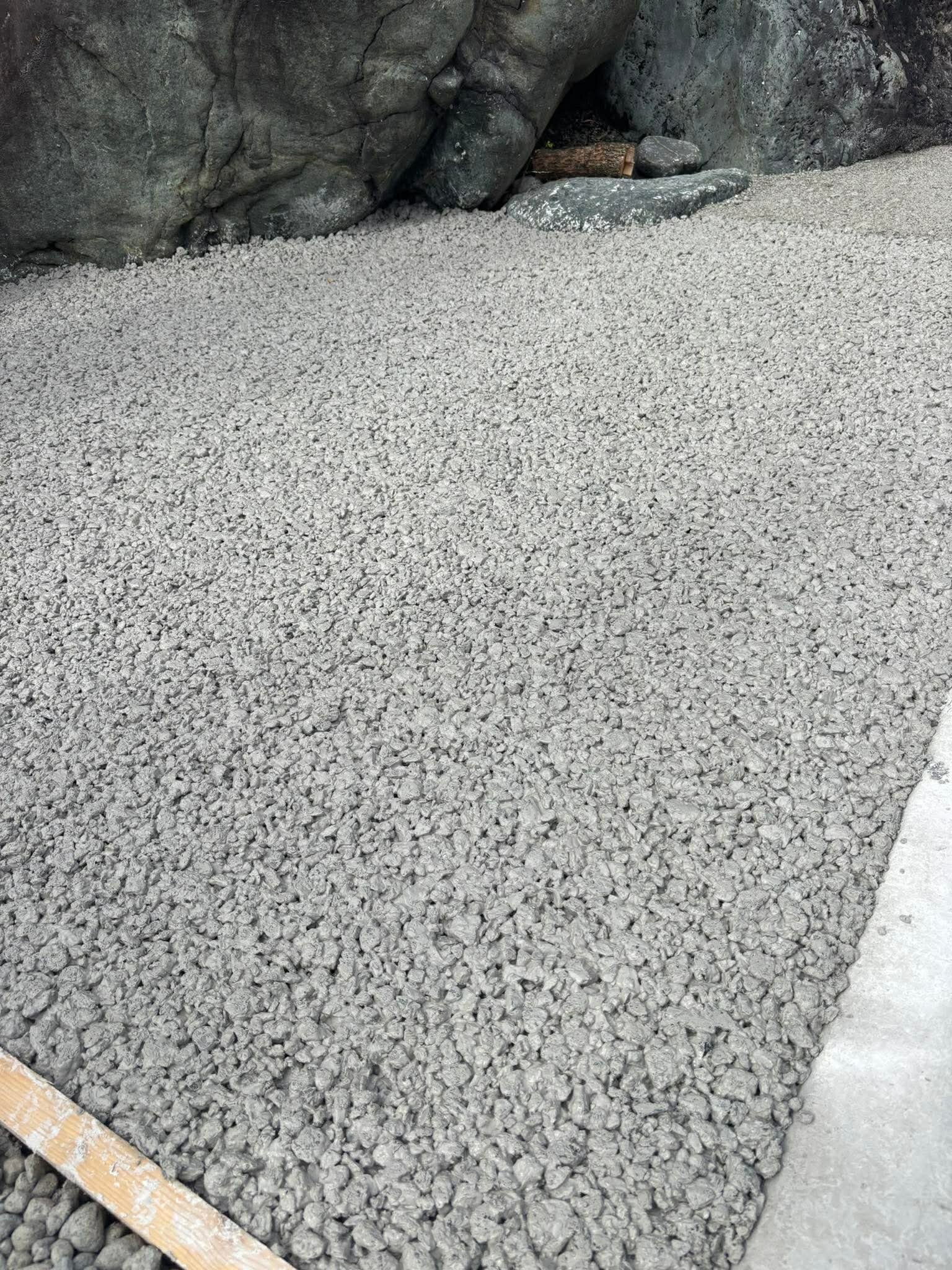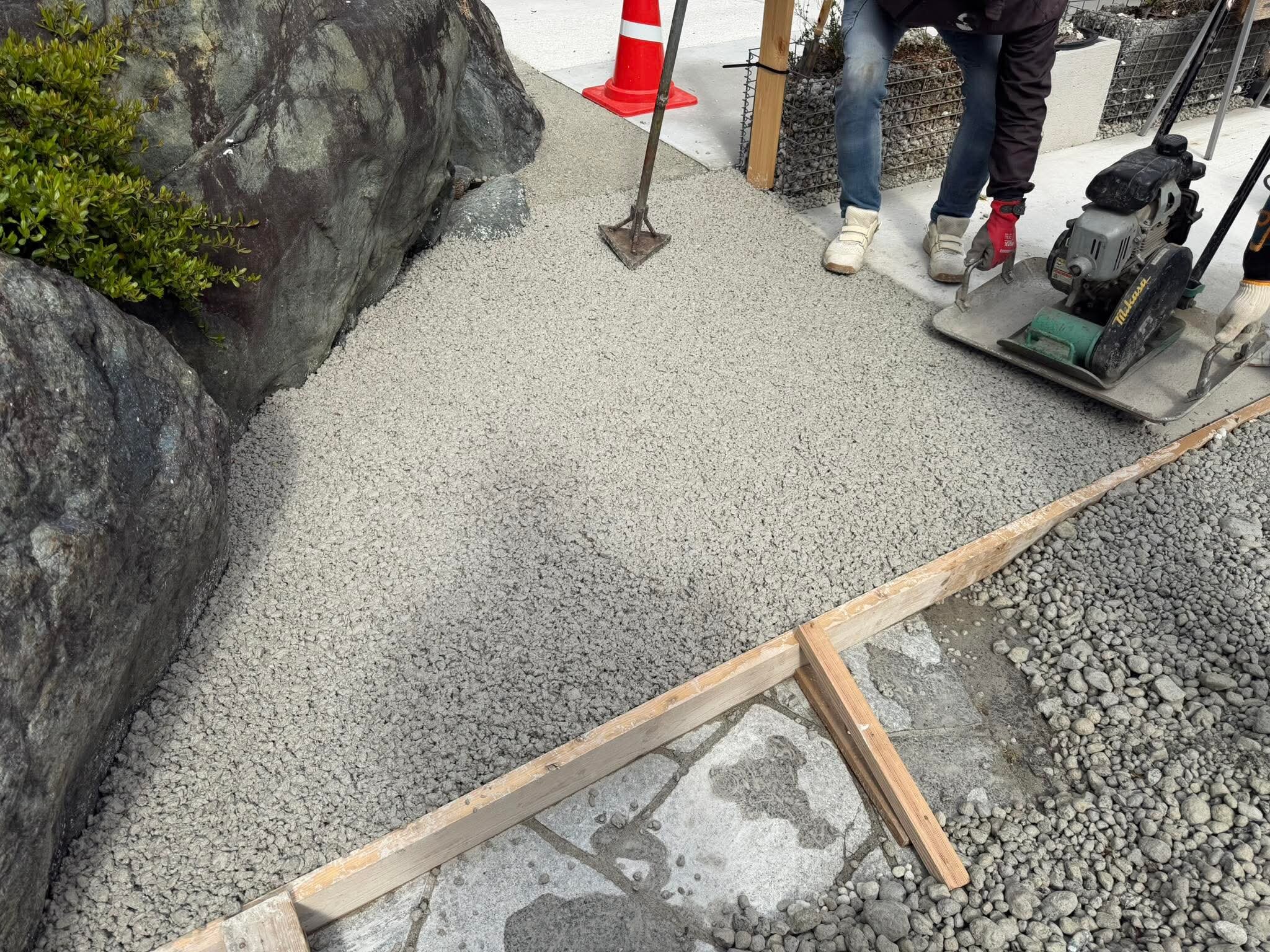 手前は白い土間コン™︎(非排水性)との違いはその仕上がり。ゴツゴツと粗野なテクスチャは水を通す為の空隙によるもの