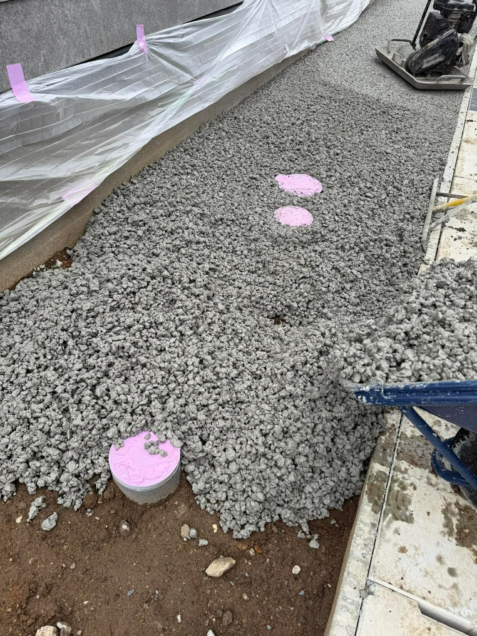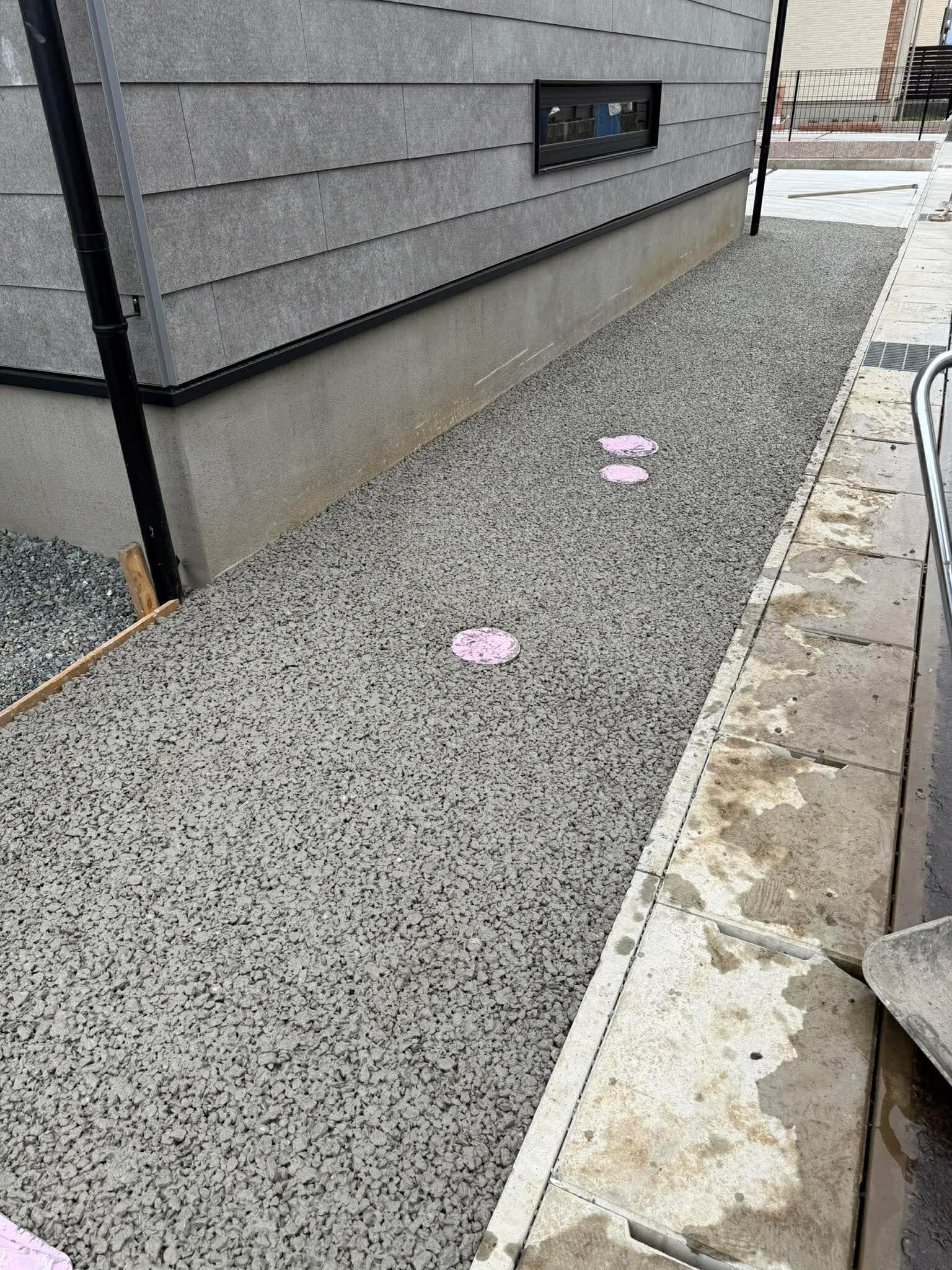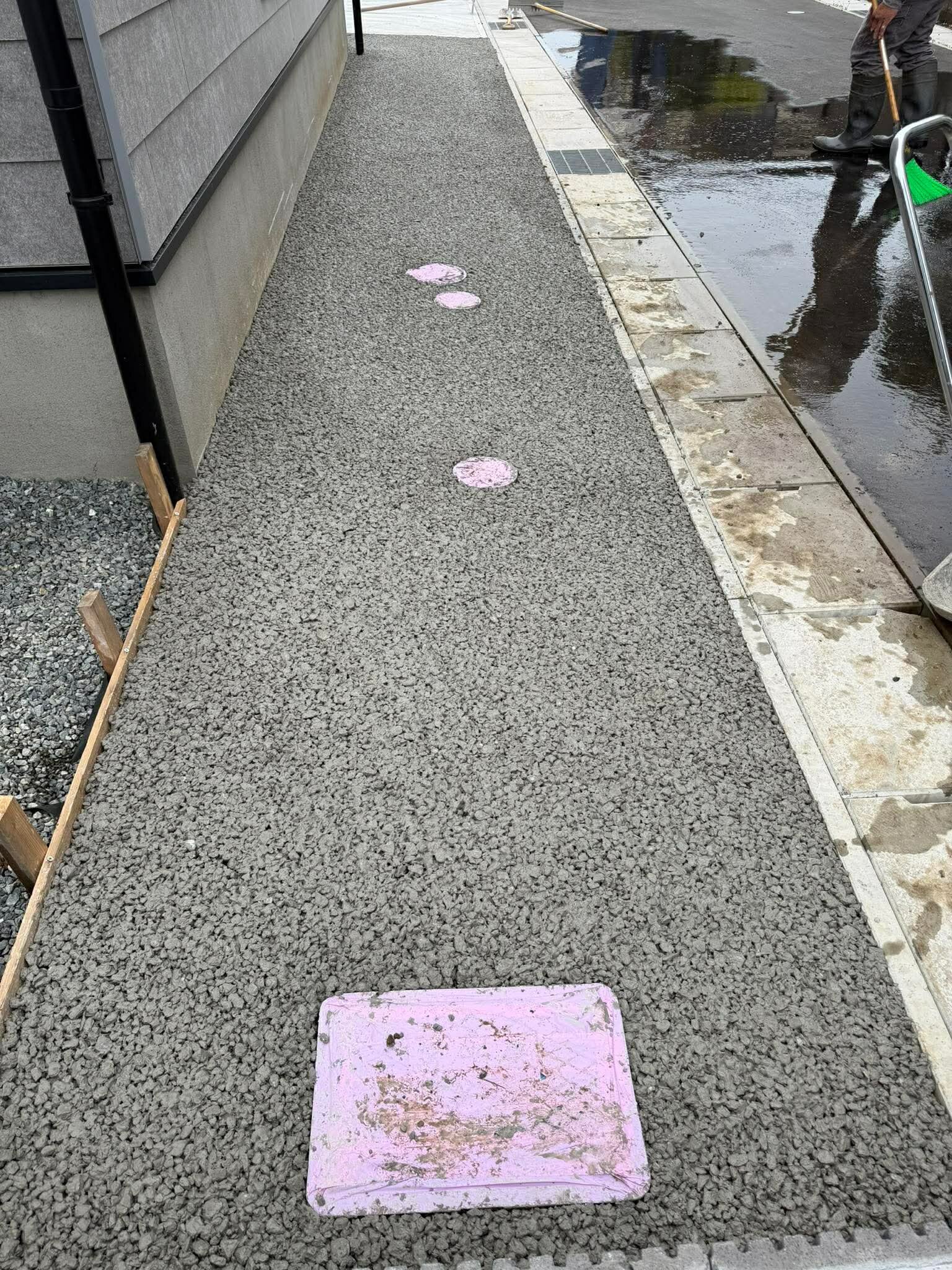 こちら、白い土間コン™︎シリーズ 排水性オコシコン®︎の施工状況。 生コンポータルの土間コン™︎には通常の土間コンに加えて、排水性オコシコン®︎ 保水性オワコン®︎まさ固®︎ がラインナップされ、色はスタンダードに加えてホワイトとオフホワイト、オーダーメイド(特注)が選べます。こちらは、オコシコン®︎ ホワイトの施工現場