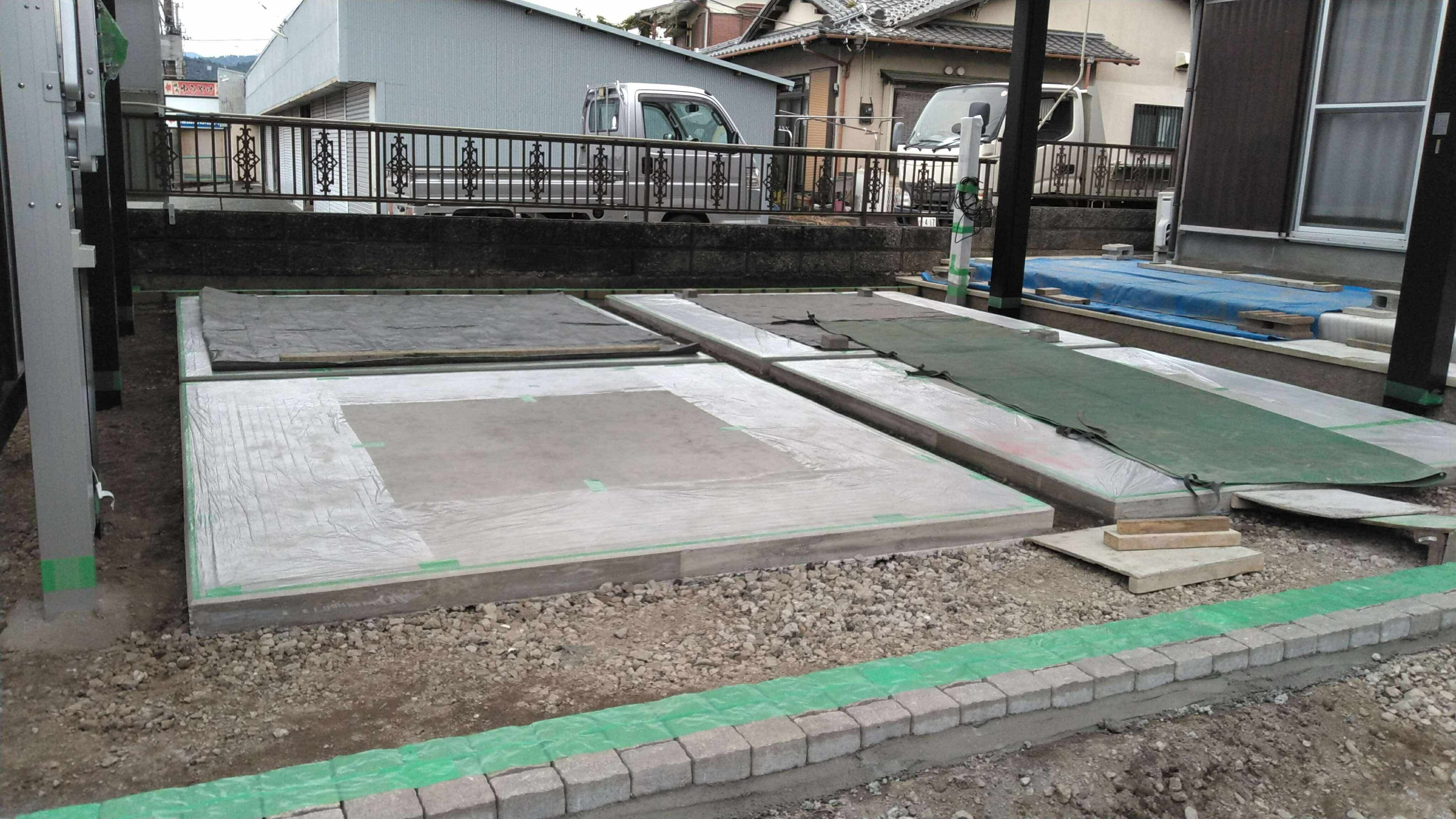 土間コンは水が抜けていかないから排水スリット(裸の地面の箇所)を設置するものだがそこに塵芥が溜まったり草が生えてきたりするものだからオコシコン®︎が採用されるケースがあります。