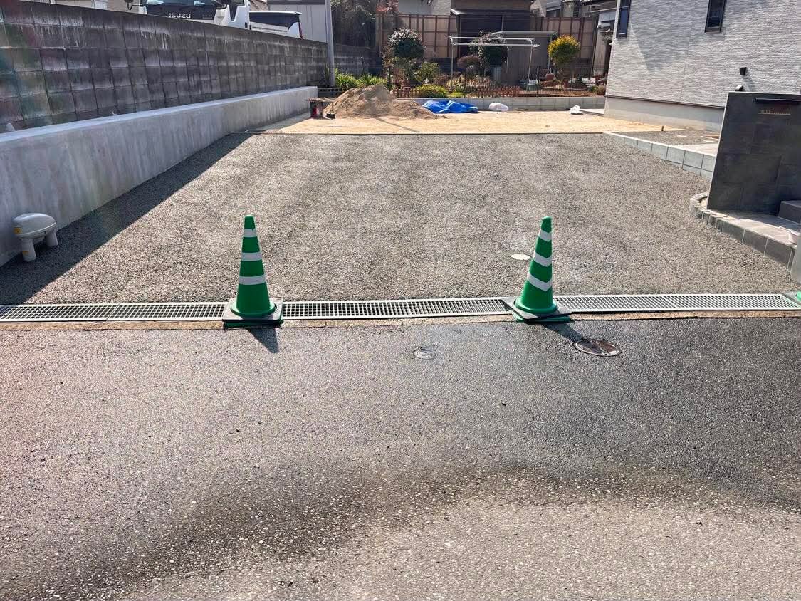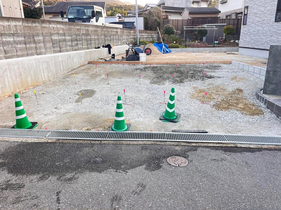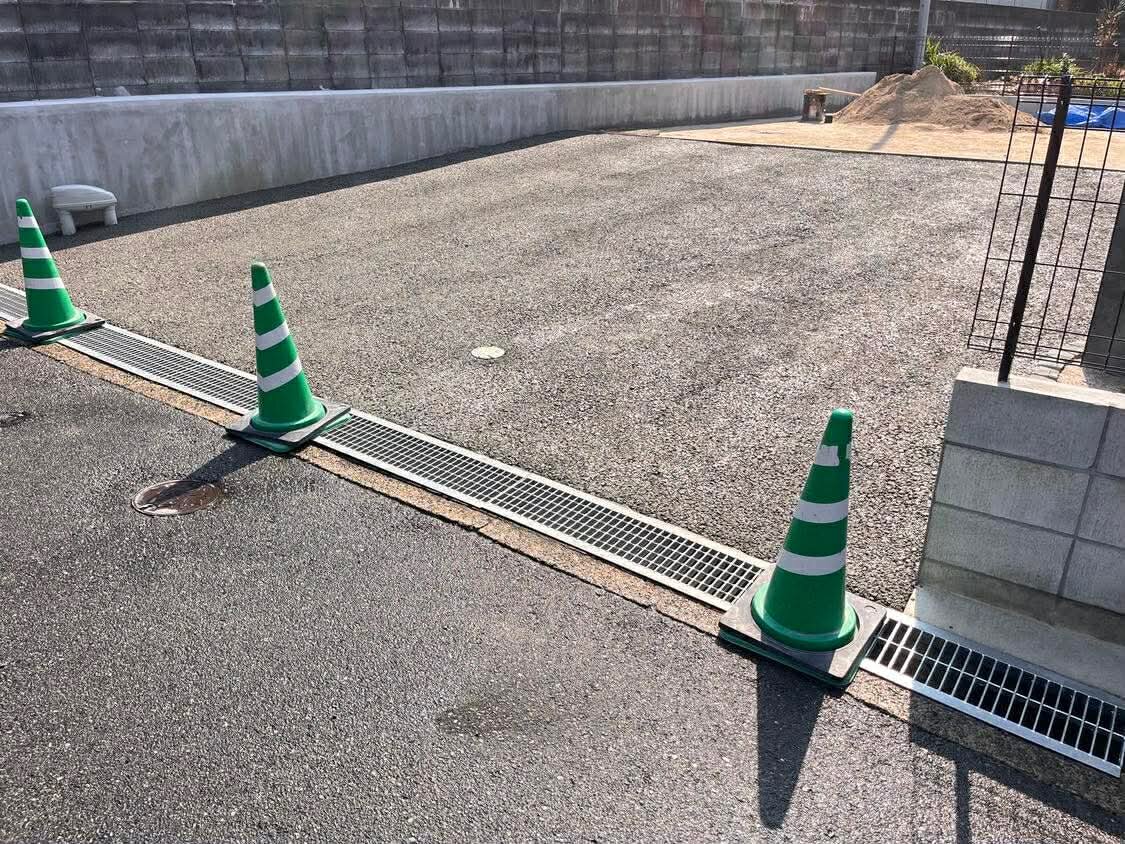 こちら、土間コン™︎ Before は下地路盤まで完成している。通常であればワイヤーメッシュの敷設へと続くが排水性土間コン™︎ オコシコン®︎ の場合はこのまま施工できます。作業は all round 新井さんによる