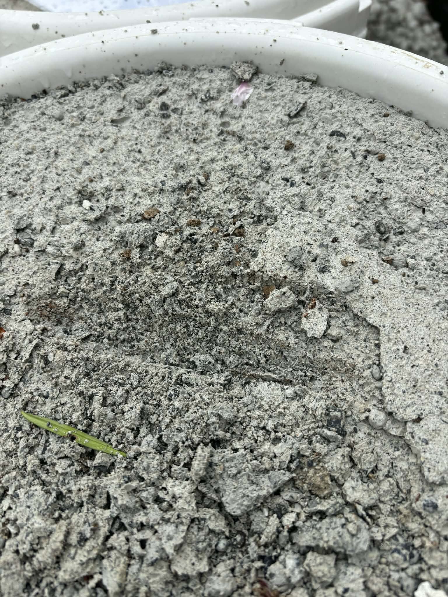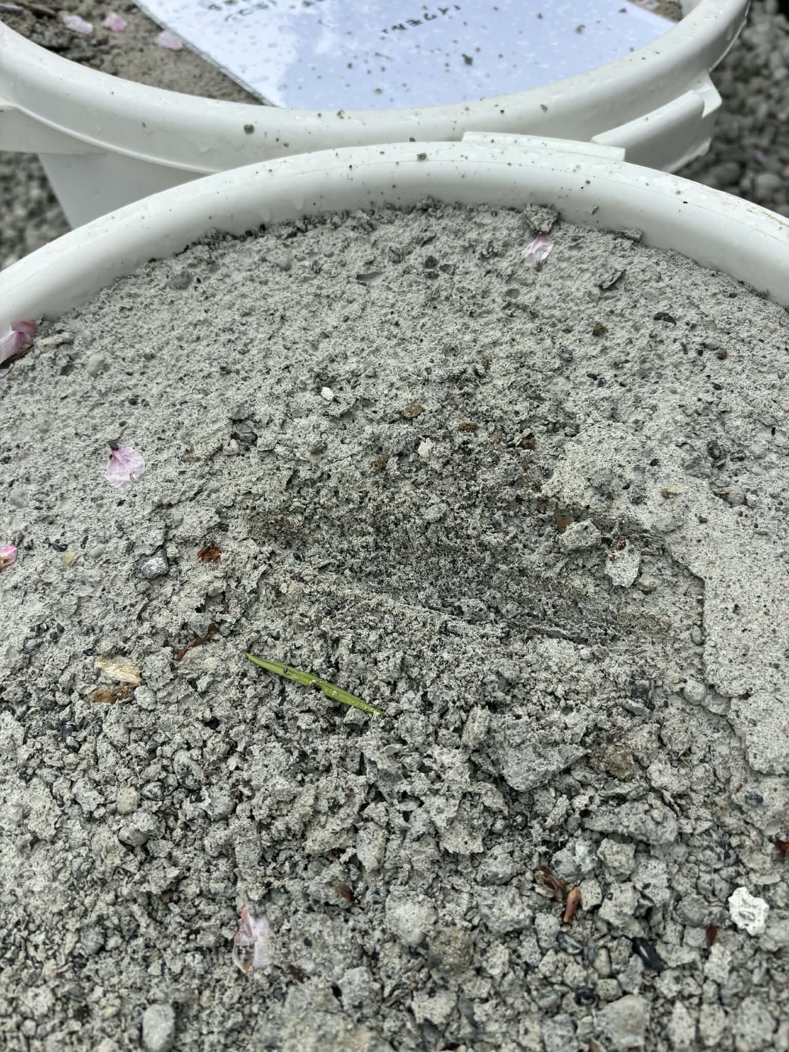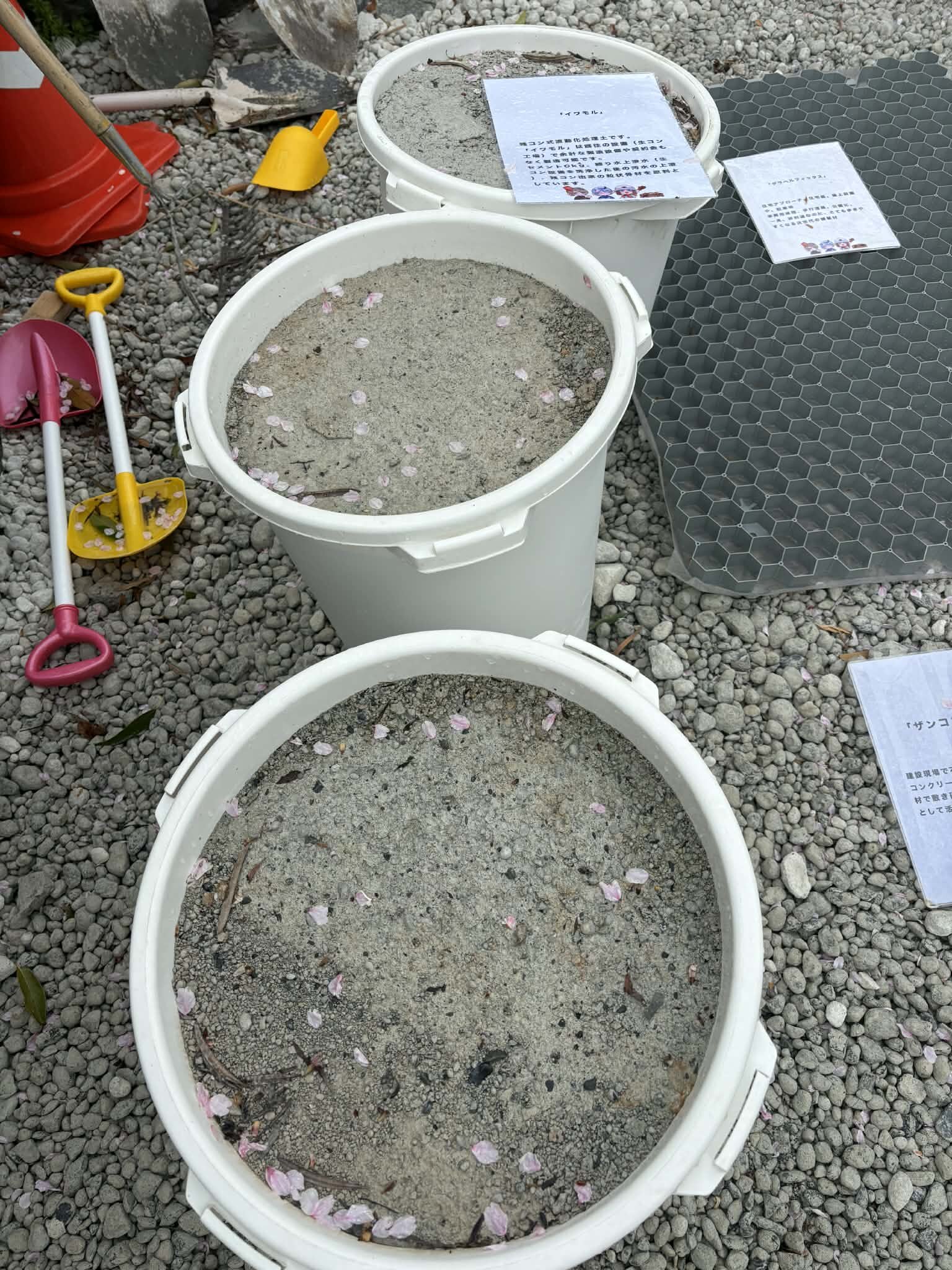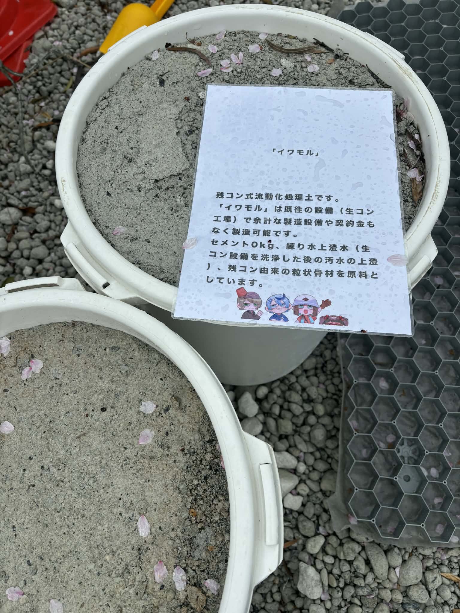 ゴミバケツに打設してあるCLSM(イワモル®︎)はその重さや硬さを直接体験していただけます