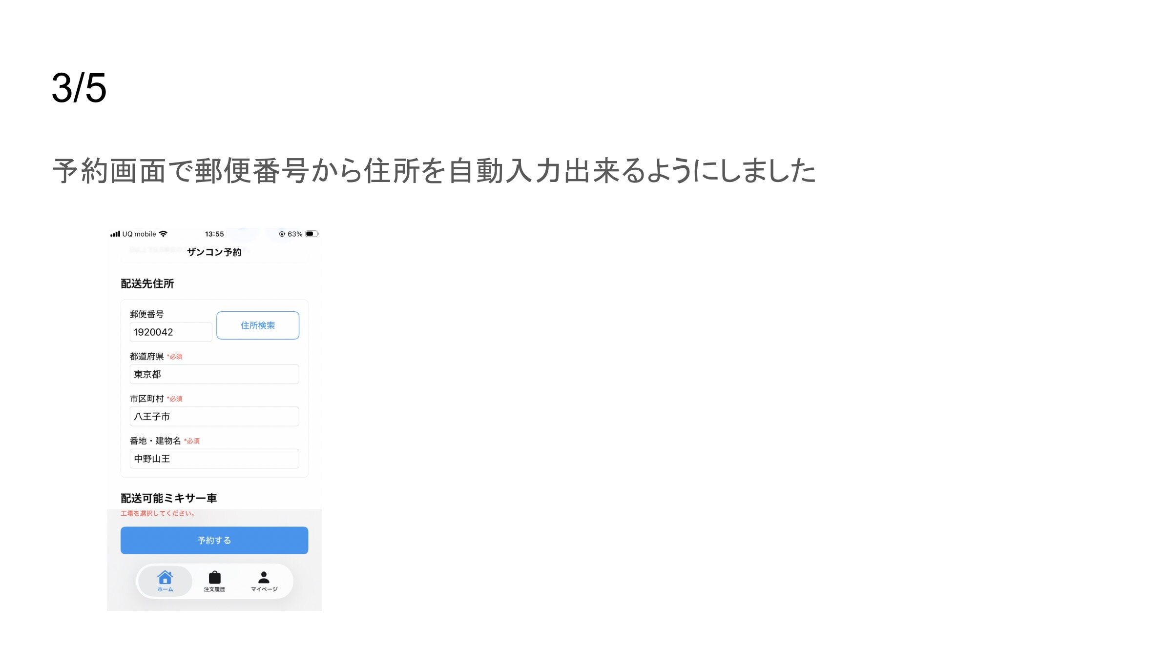 現場住所の入力を早くするために郵便番号から住所のマトを絞れるようになってます