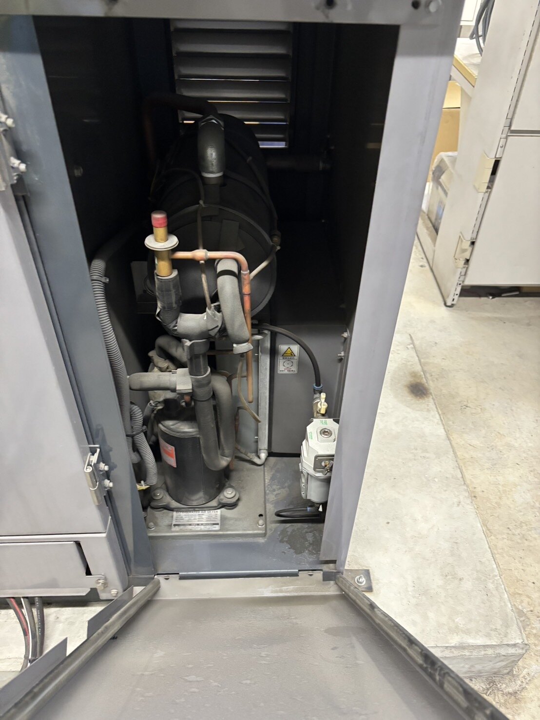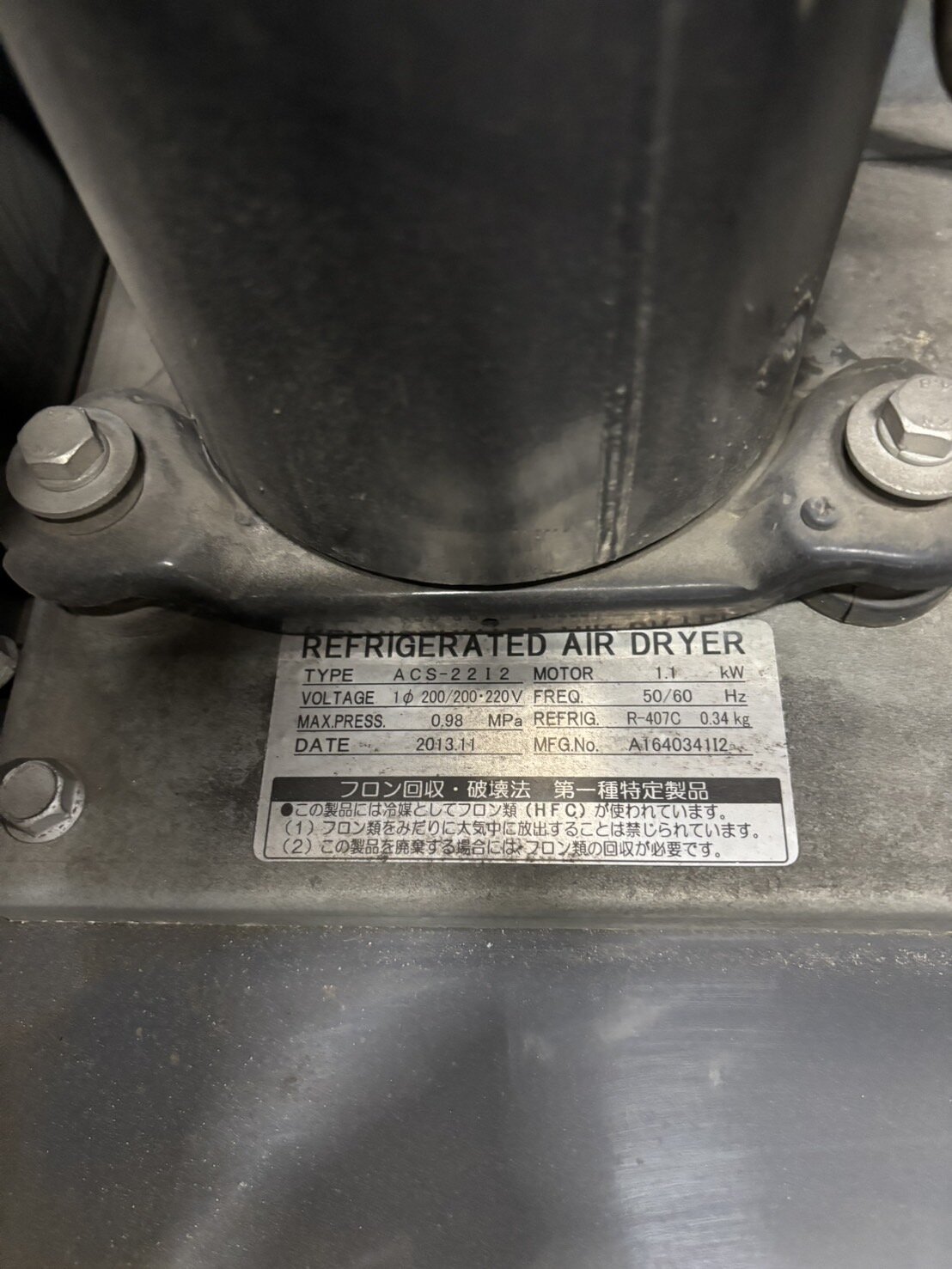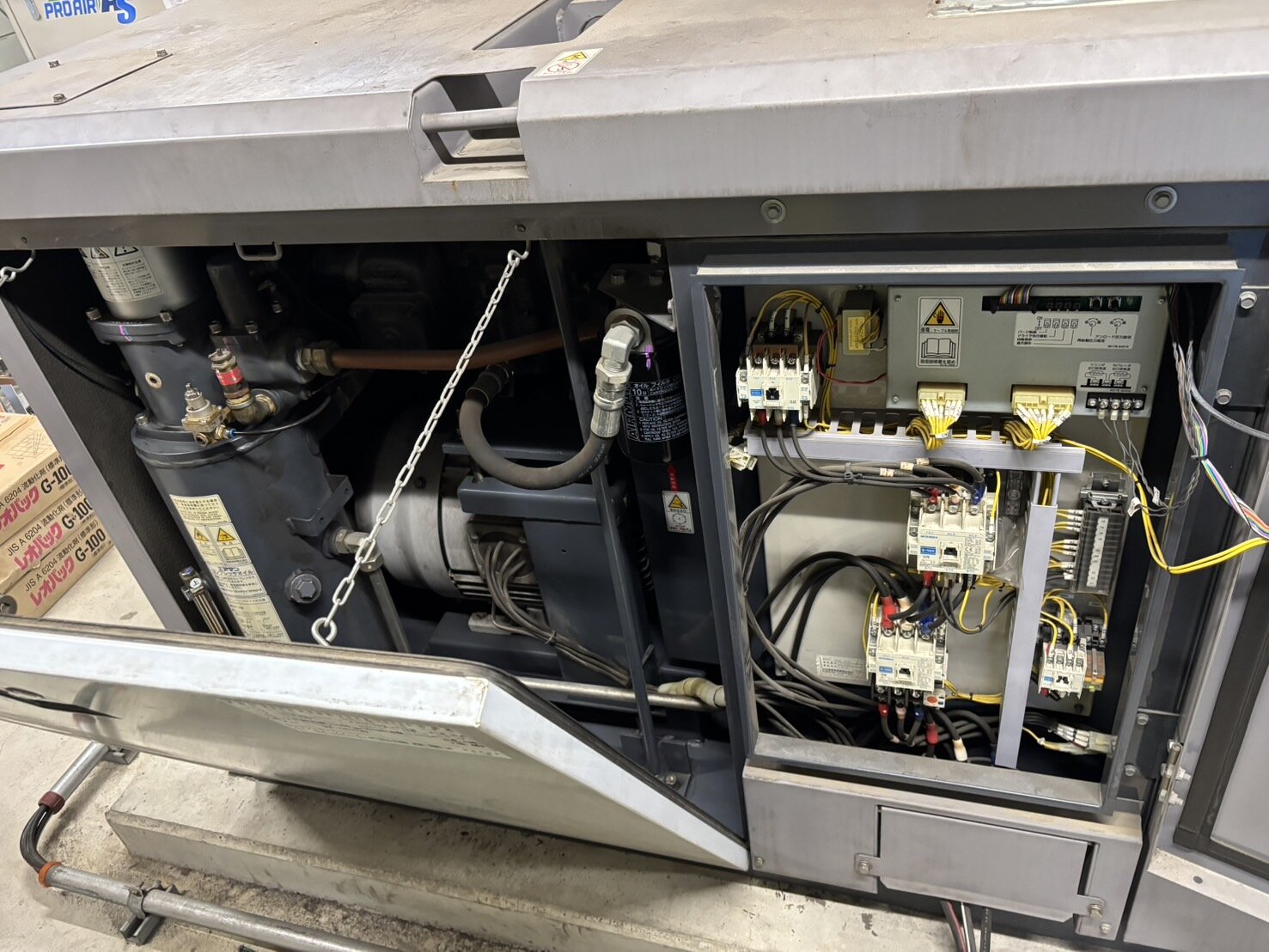 写真は定速式(ICC)のコンプレッサー。CUCO製造設備分科会の研究成果によれば明らかに型式と設定(制御方式)を変えるだけで電気代がお得になるということなので、現在研究に並行してインバーター式への更新作業を進めているところ