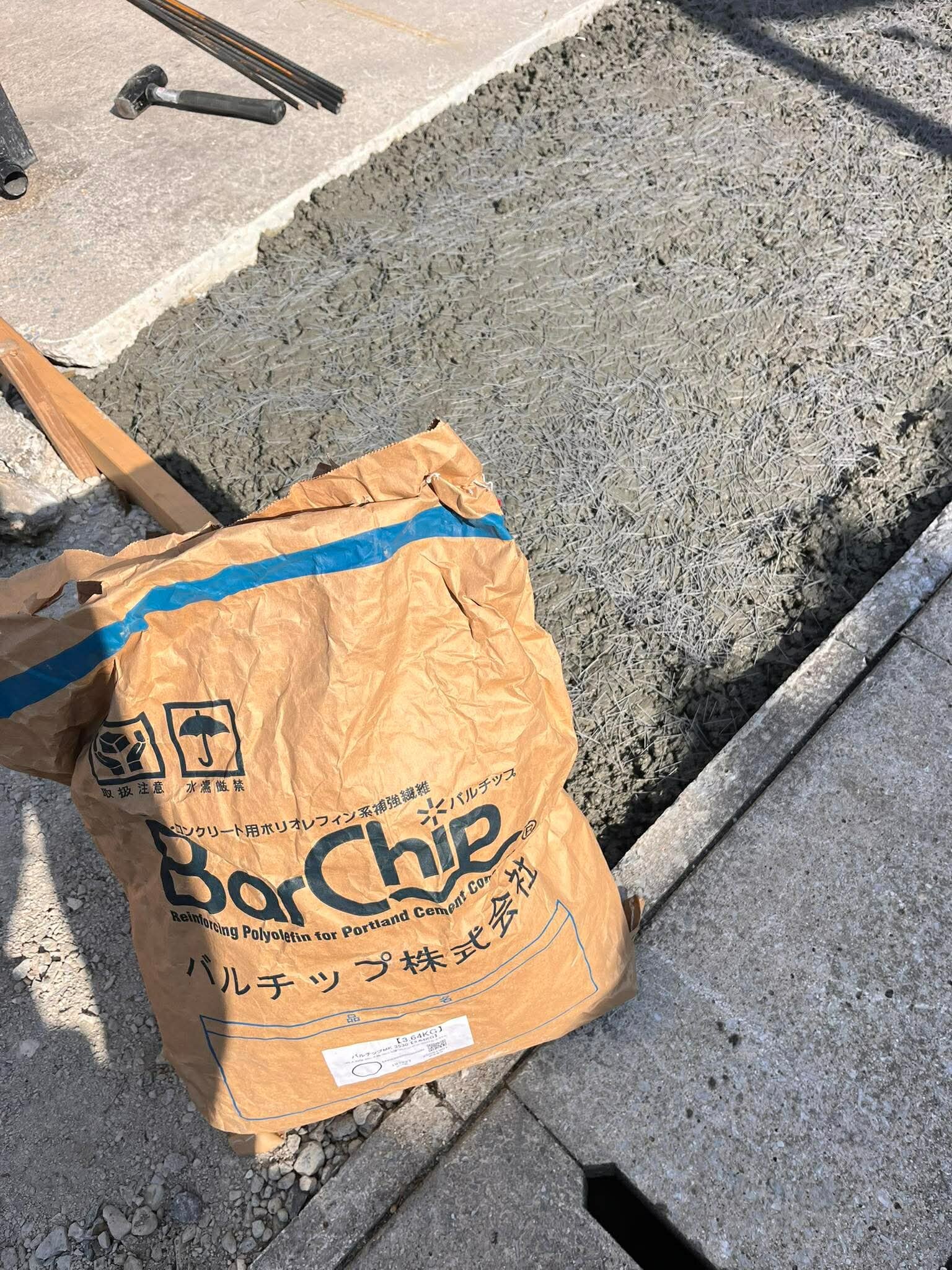 Barchipはポリプロピレン繊維の架橋効果によるひび割れ抑制ソリューション。標準は生コンの中に混和材として配合するものだが、所定量を表面に散布したらあとは普通の作業フロー(タンピングでポリプロピレン繊維は生コン中に沈み込みひび割れ抑制ネットワークが形成される)という方法も提案されている