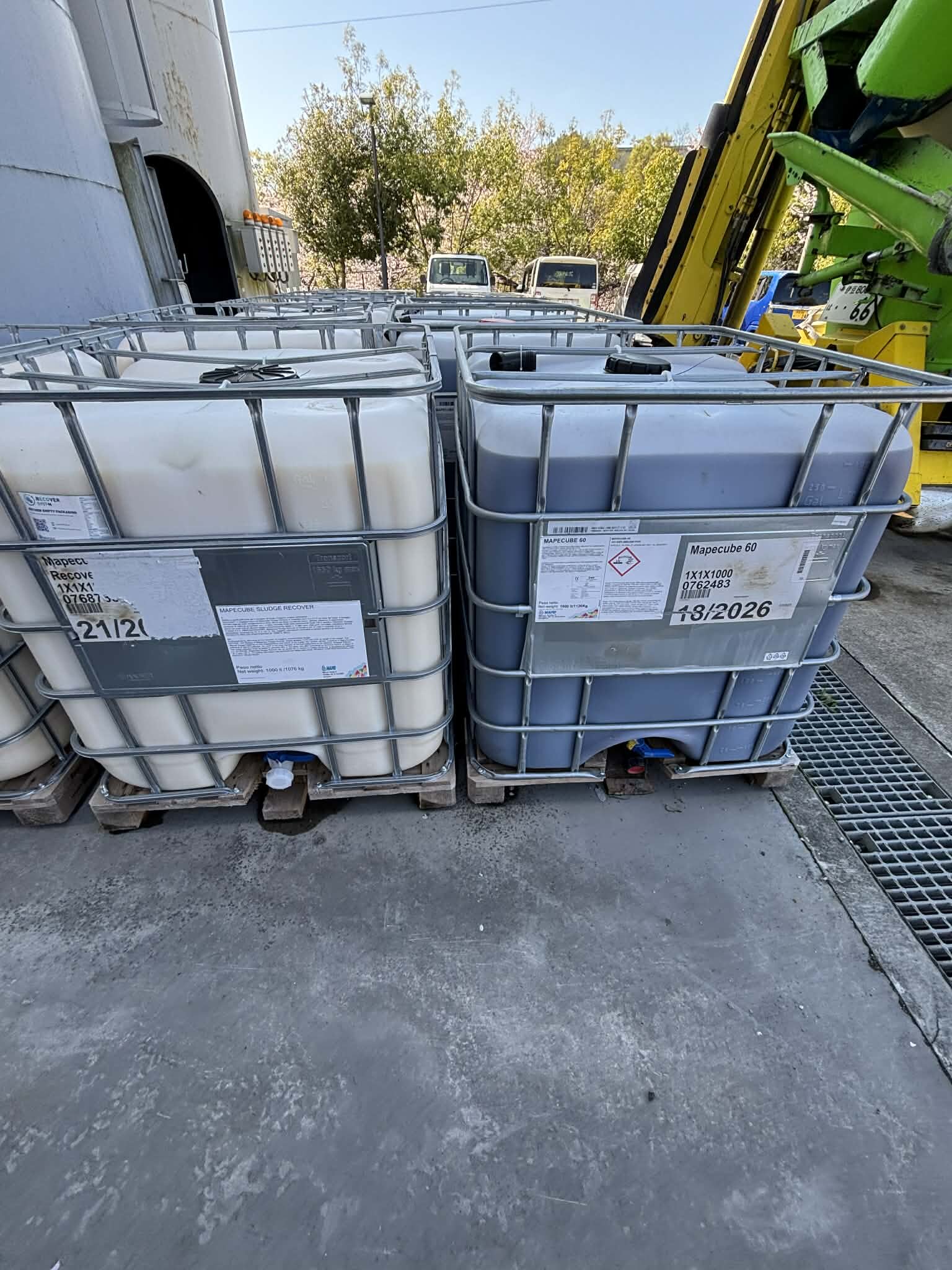 特殊混和剤Mapecubeストック。こちらで、厄介者生コンスラッジは有益なアルカリ刺激剤ジョイスラッジに加工されます