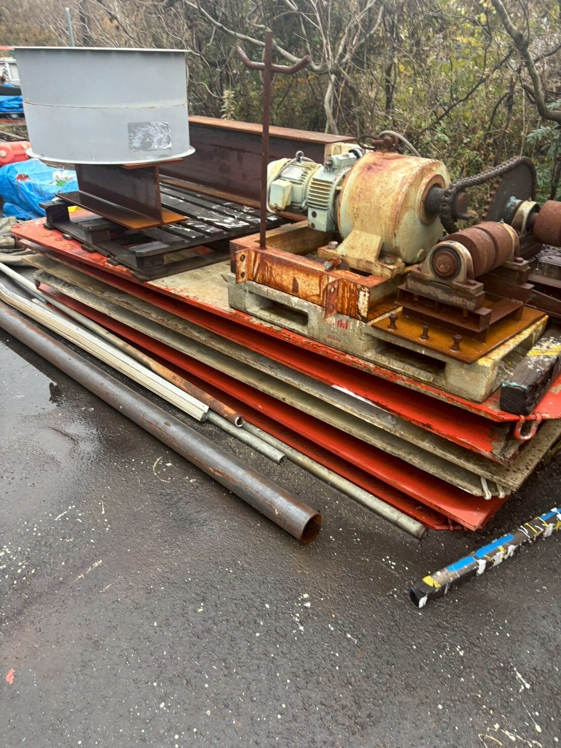 高瀬さんによれば移動式サイロは地面がコンクリートやアスファルトで舗装されてあり水平が取れていればほぼほぼ「ポンとおくだけ」でOKだそうだ。構造計算もいらない設備なので中に3分の1程度材料が入っていればそのまま錘の役割も果たすという。なお、写真は舗装されていない地面に設置する場合に利用する敷き鉄板。この程度の治具でOKという簡便さは目から鱗でした