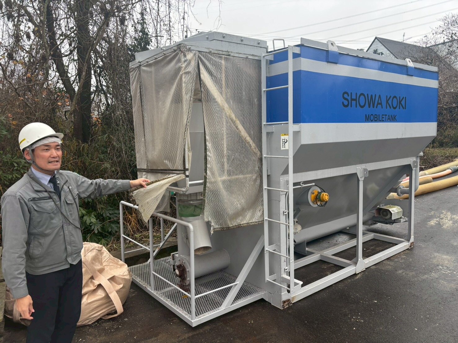 なお、こちらは横置き型13トンサイロはコンパクトで10トンユニックで持ち運びができるそうです(縦型は25トンラフタークレーンが必要)。ちょいとCCU材を供給する際にはとっても便利だと思いました