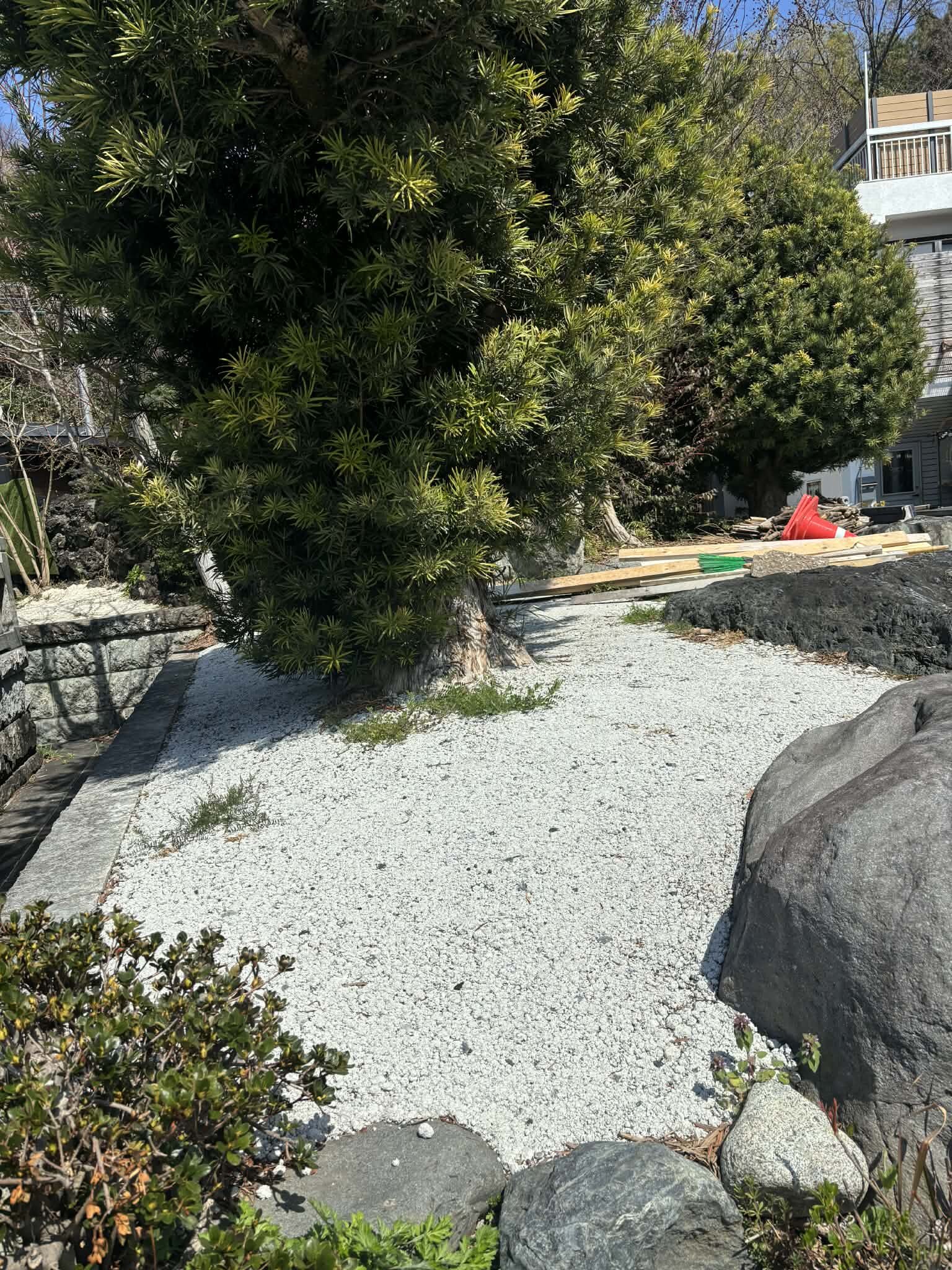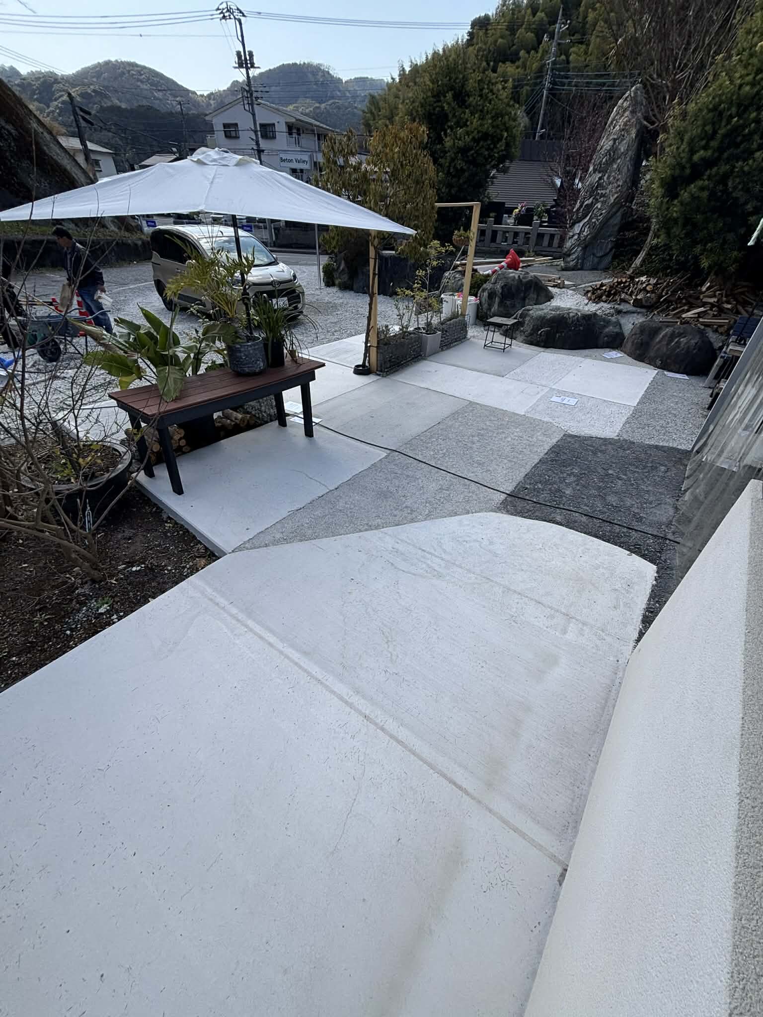 植栽の周りをコンクリで埋めてしまってます(土間コン™︎)が大丈夫。保水も透水もするから植栽には優しく雑草は抑え込む