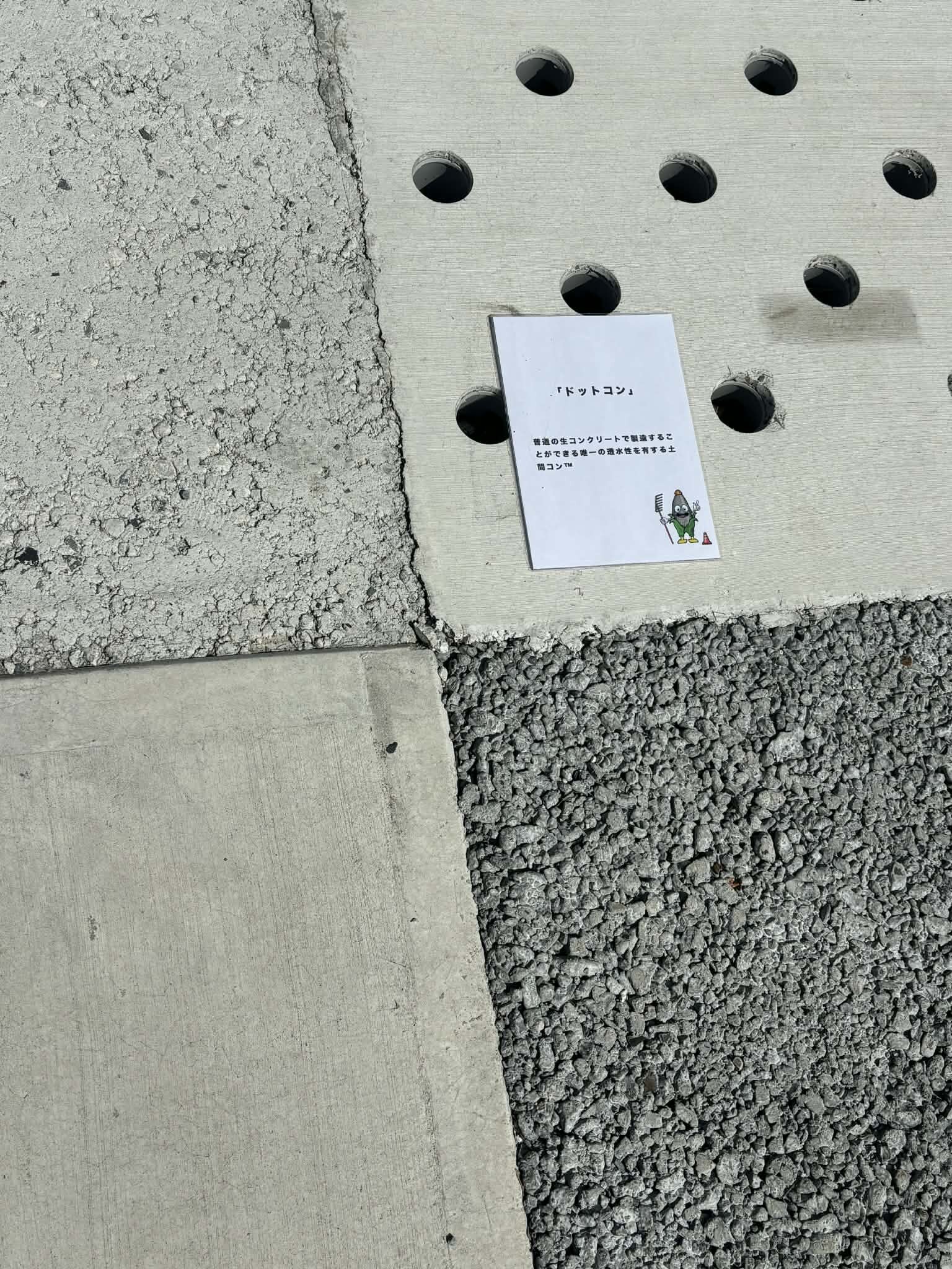 いろんなタイプの土間コン™︎がカフェや露天風呂やオフィスの間を縫うようにして展示されています。彗星の如く登場した小澤辰矢が広告塔のドットコンやポーラスコンクリートオコシコン®︎が並べて展示されています