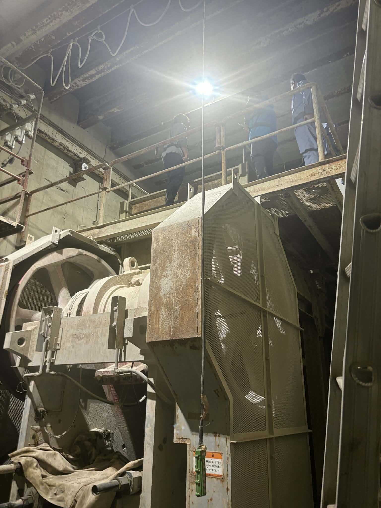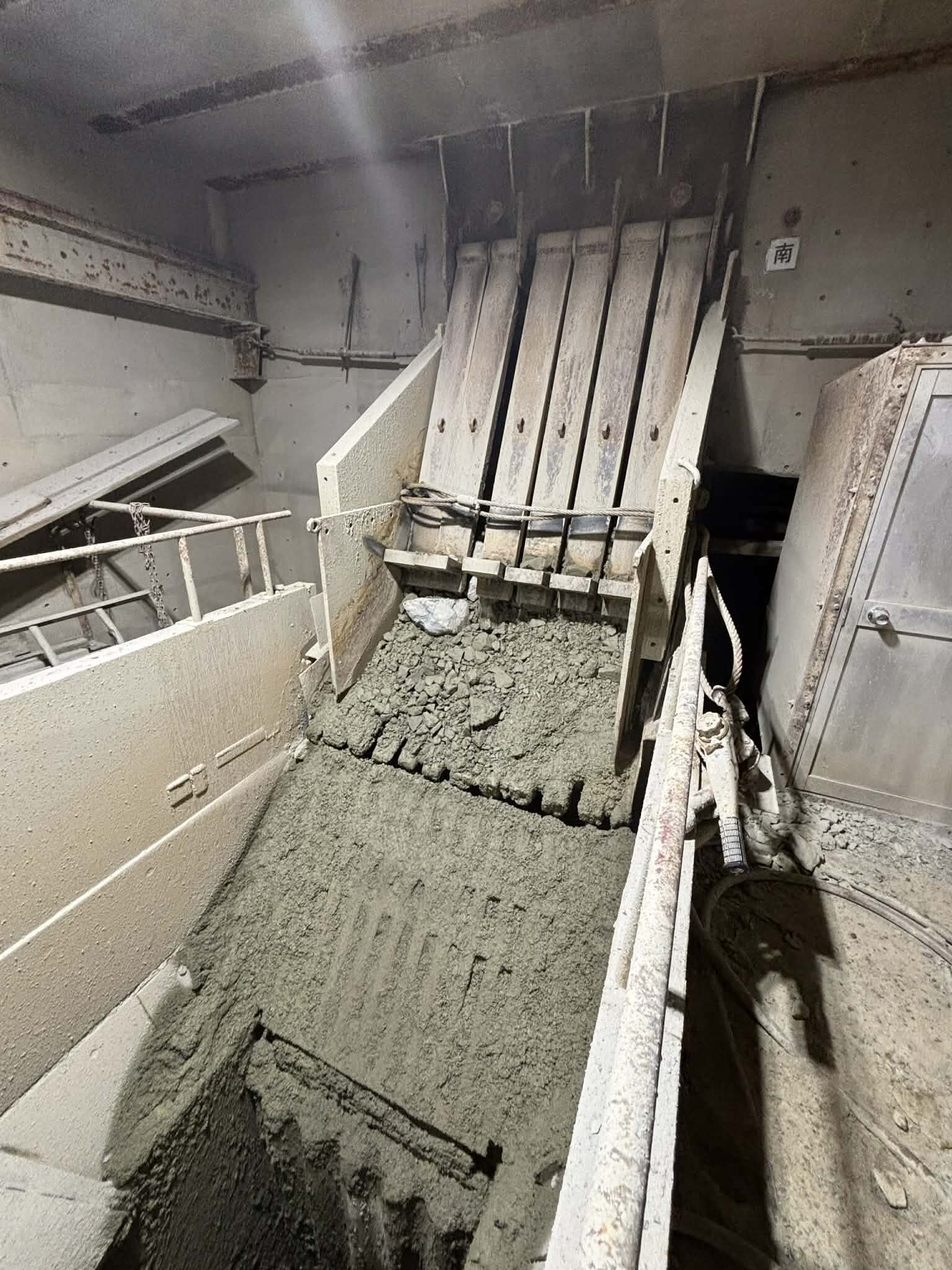 砕石製造の要点、破砕機。こちらで破砕された原石は次の工程に。まるで、生コンプラントのよう。落差(重力)を利用しているとても効率的でシンプルな形。ベルコンや電気など動力をなるべく使わないのがより良い