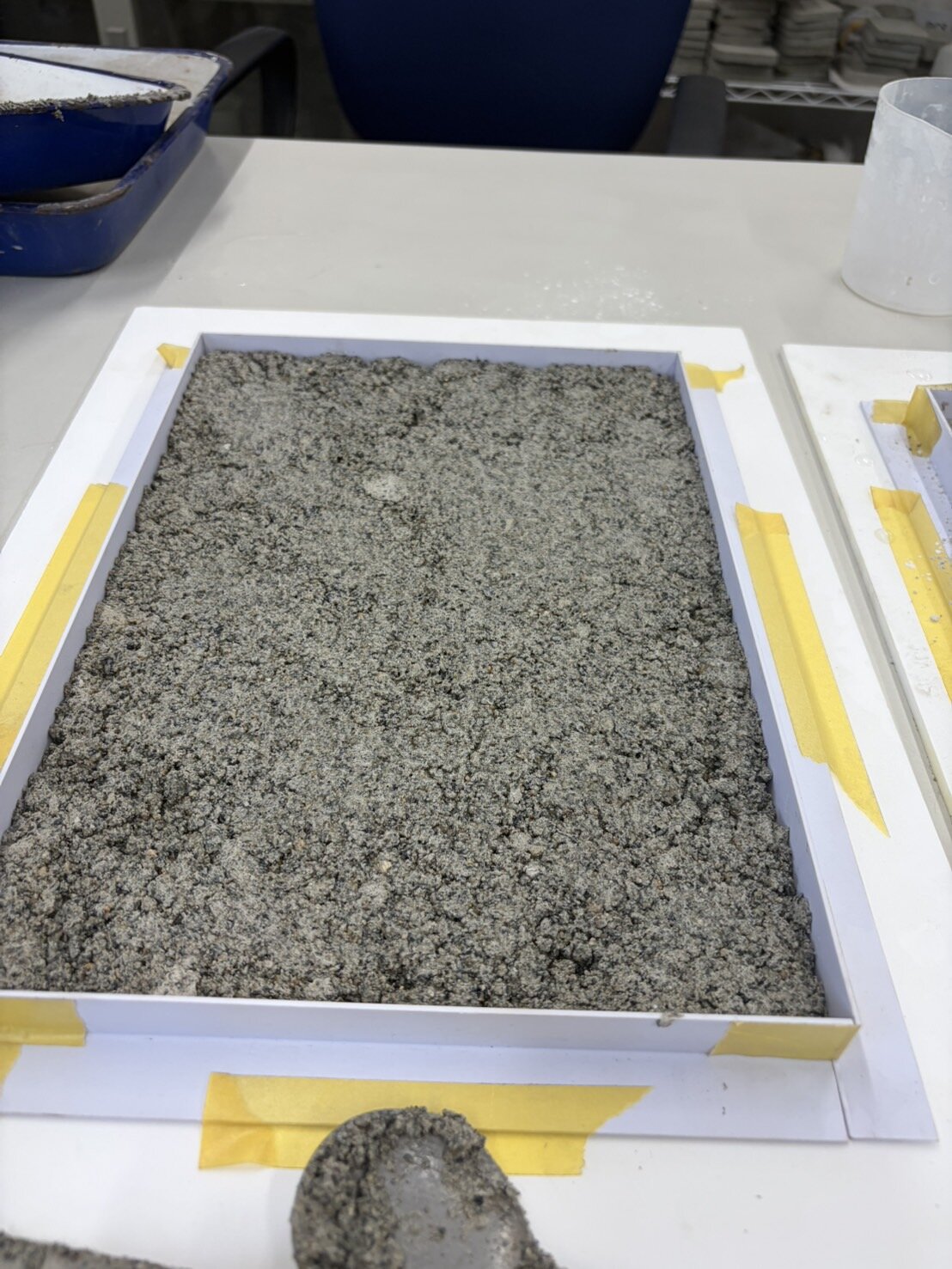 翌日(2025/11/21)朝のサンプルはコンクリート並みに固まっています。そして、見事想定していたように水も通しています。これ、恐ろしくお値段が安いため、透水性コンクリート界隈を騒然とさせると思います。オワコンよりも安い。なお、まさ固(「生コンビニ」取り扱い)では回収細骨材と残コナではなく粒状化再生細骨材一本(残コナが微粒分として格納されているとして)と高炉スラグ微粉末、表面水見合いの上澄水の組み合わせで行きます。今日、遅ればせながら製造/施工の実験を行います