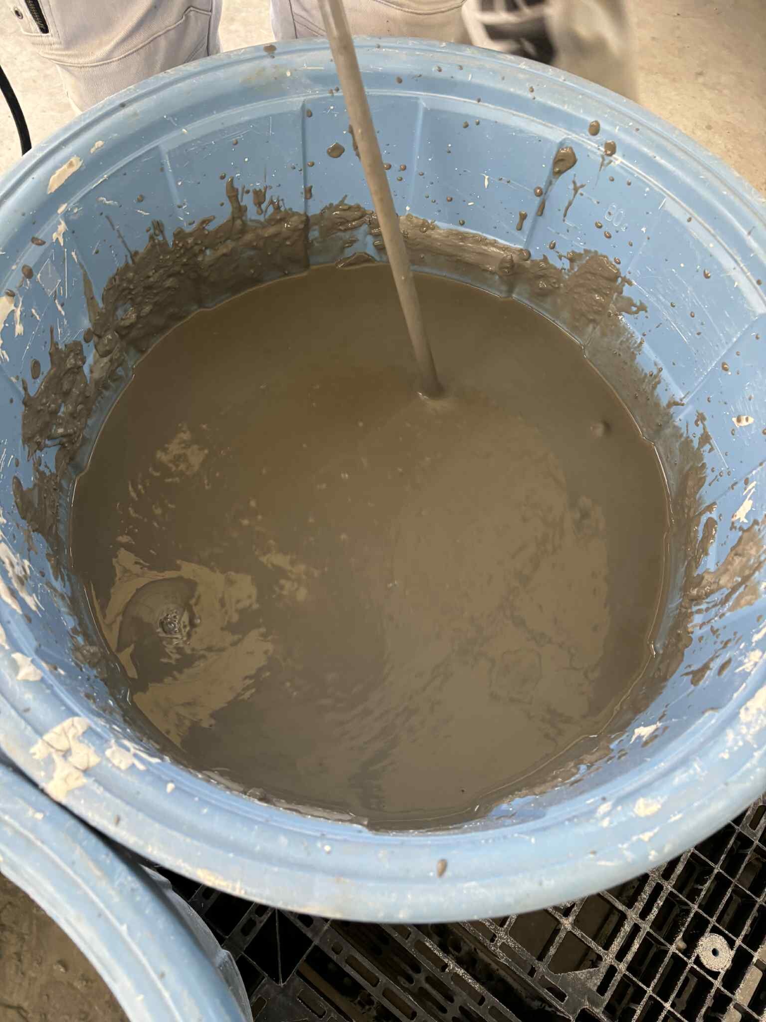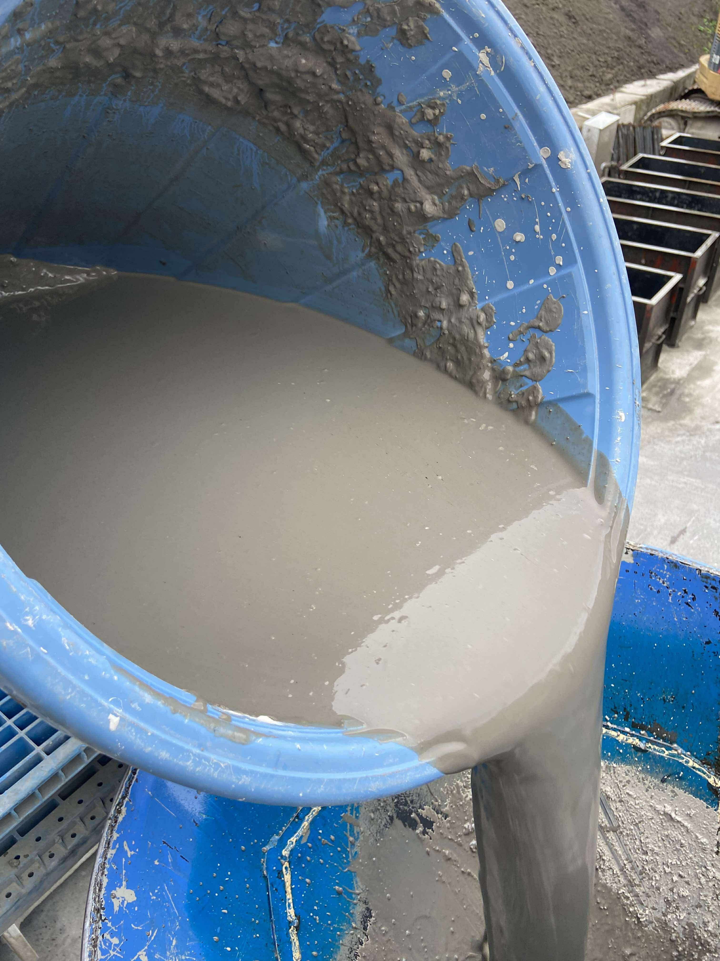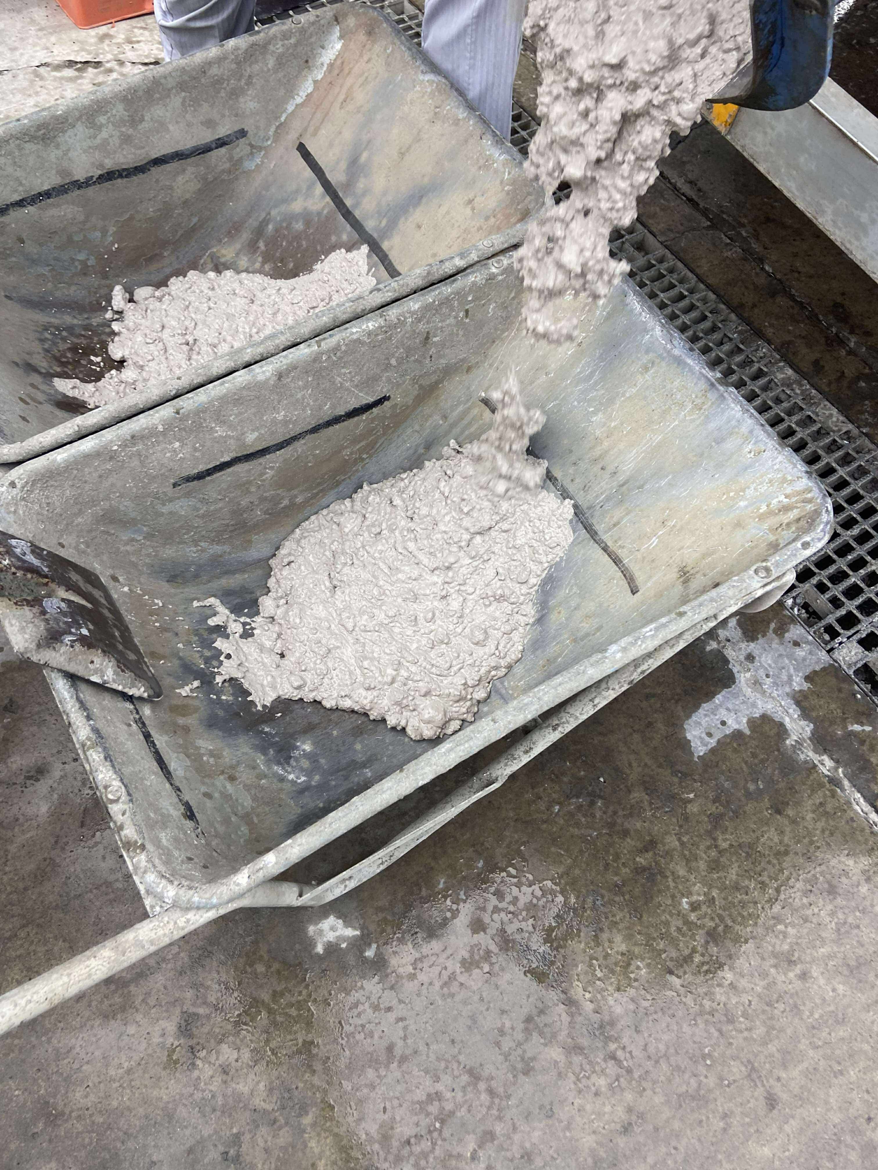 各地の生コン工場にとってザンコン™︎最後の問題と言って良い生コンスラッジの改質と混和材料としての運用、あるいはスラッジ固形分率6%(あるいは3%)としてのJIS生コンへの適用検討が始まっています。こちらは、手作業で生コンスラッジを流動化処理(改質)している様子。年内には自動化を目標としています