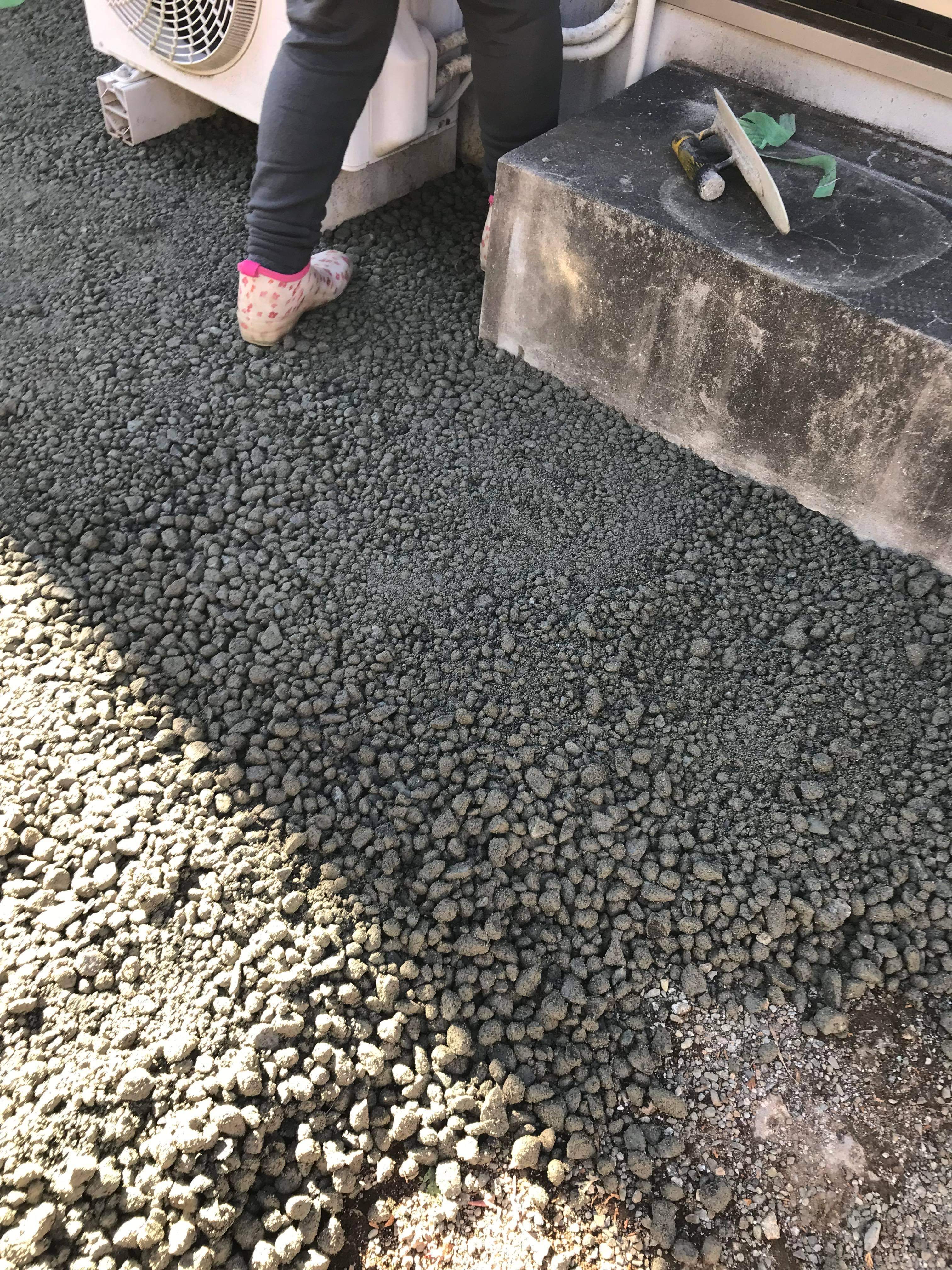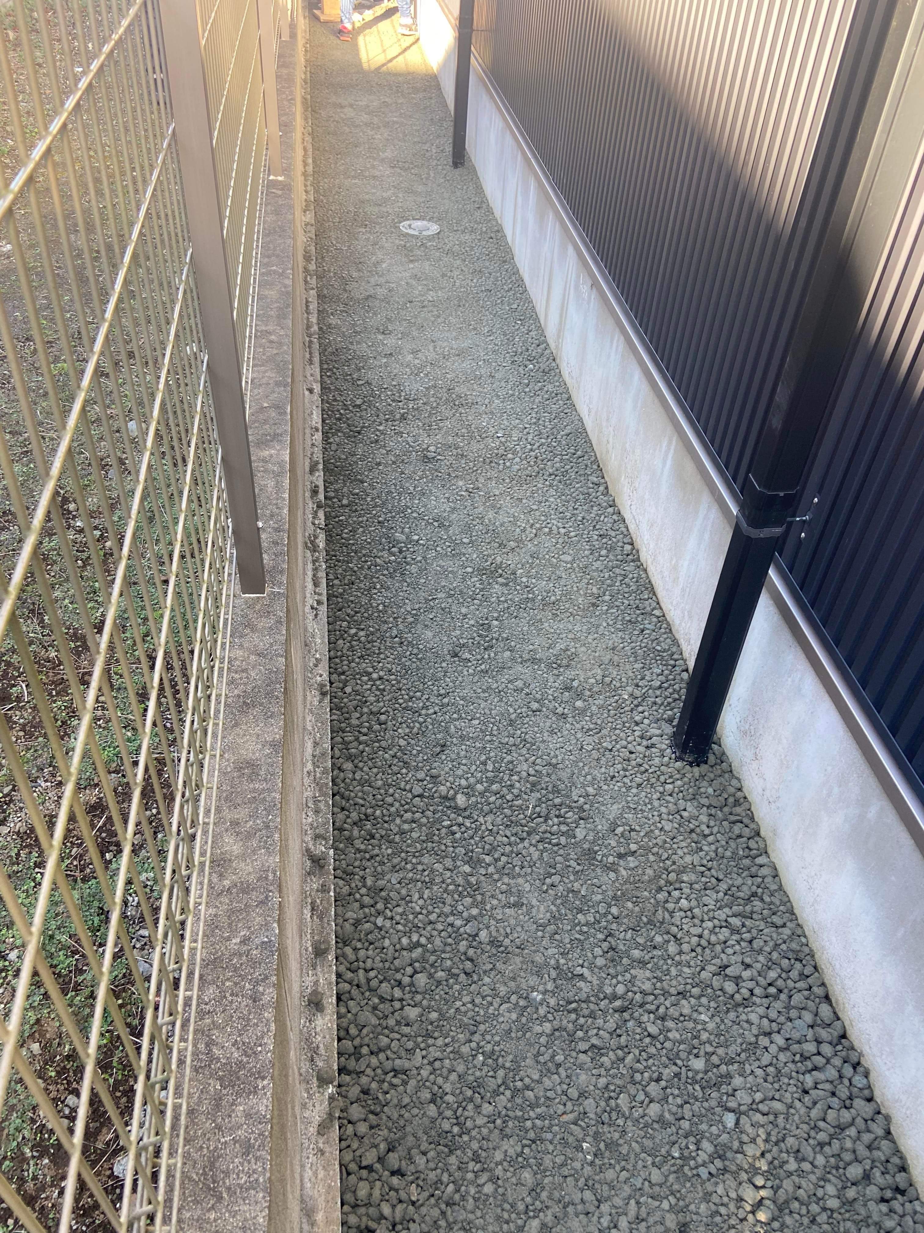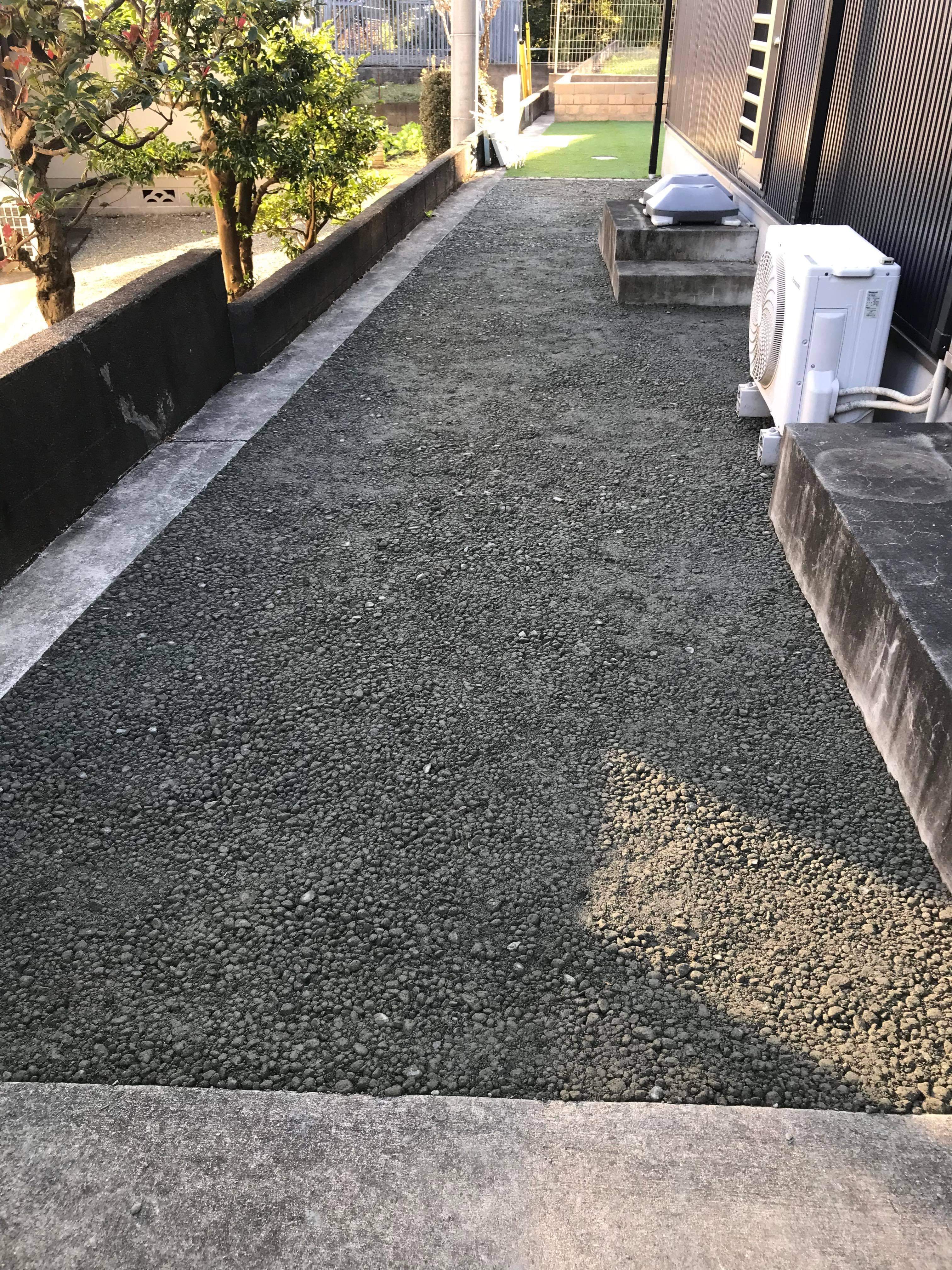 神奈川県小田原市。オワコンDIY施工。庭へのアプローチ部分と犬走の雑草対策に悩んでいろいろ調べていた。真砂土も候補にあがったがコケが生える可能性がある。土間コンは値段が高い。オワコンだと安くできるということで即採用。(透水性夫さん共有)