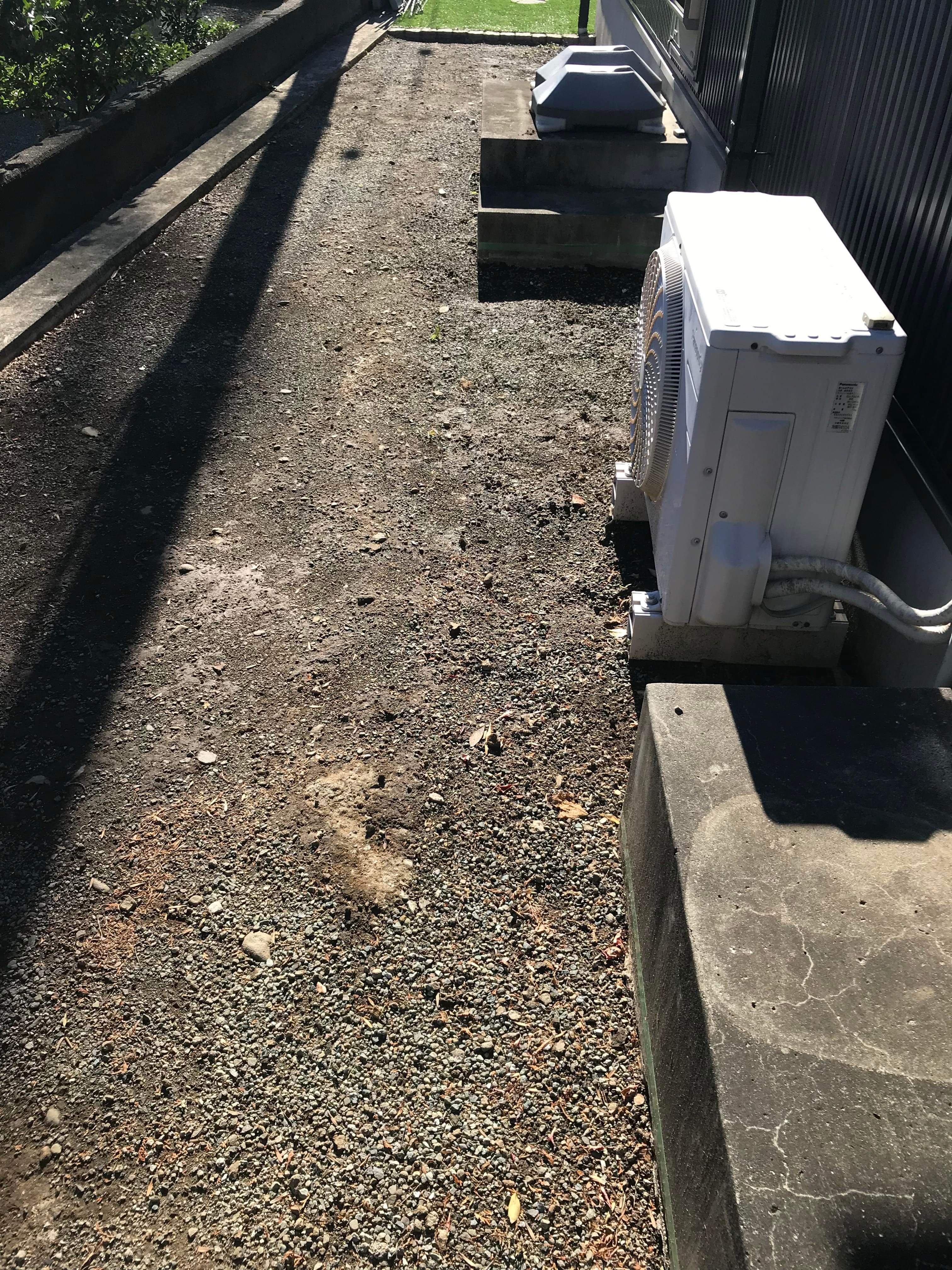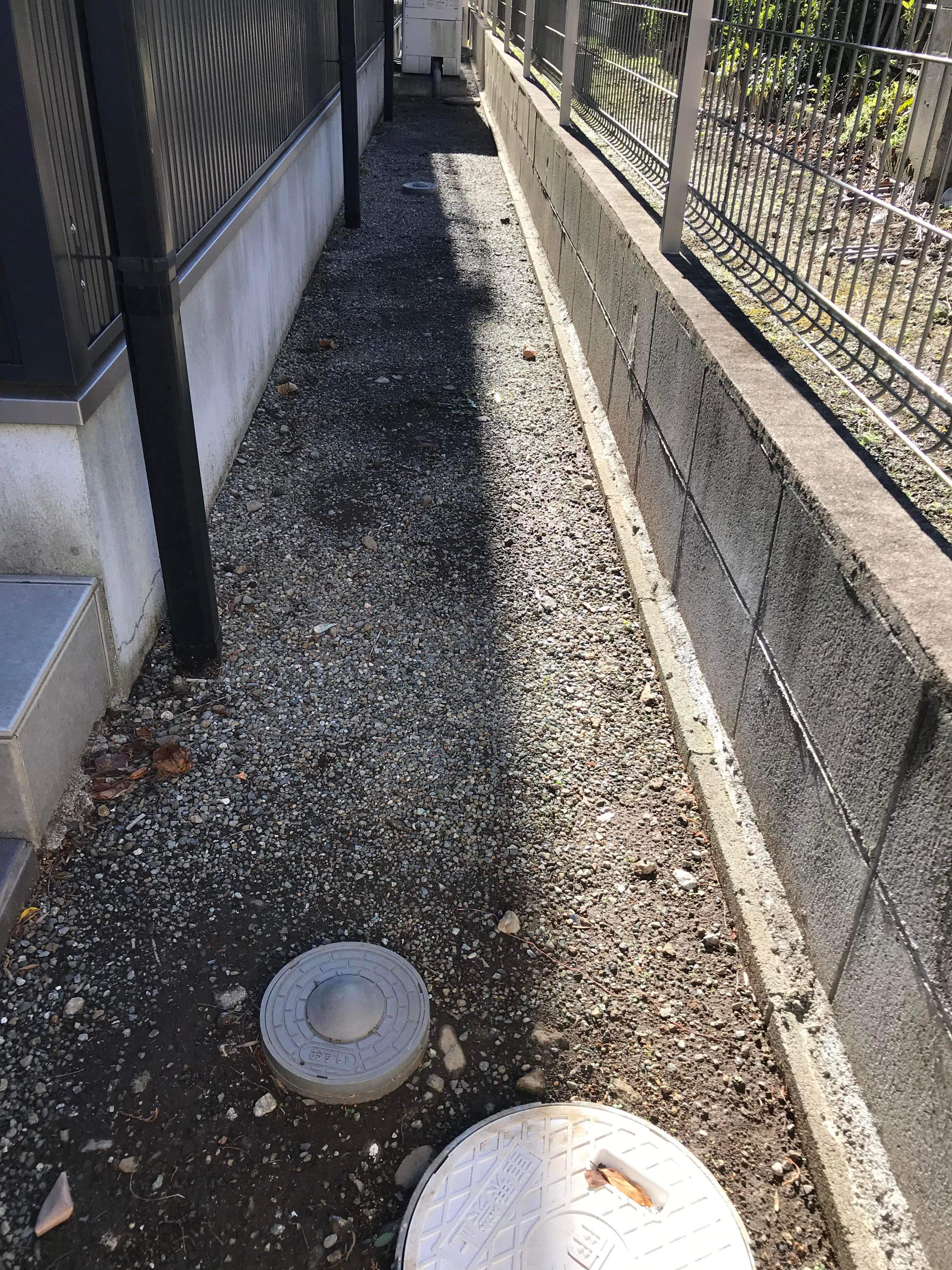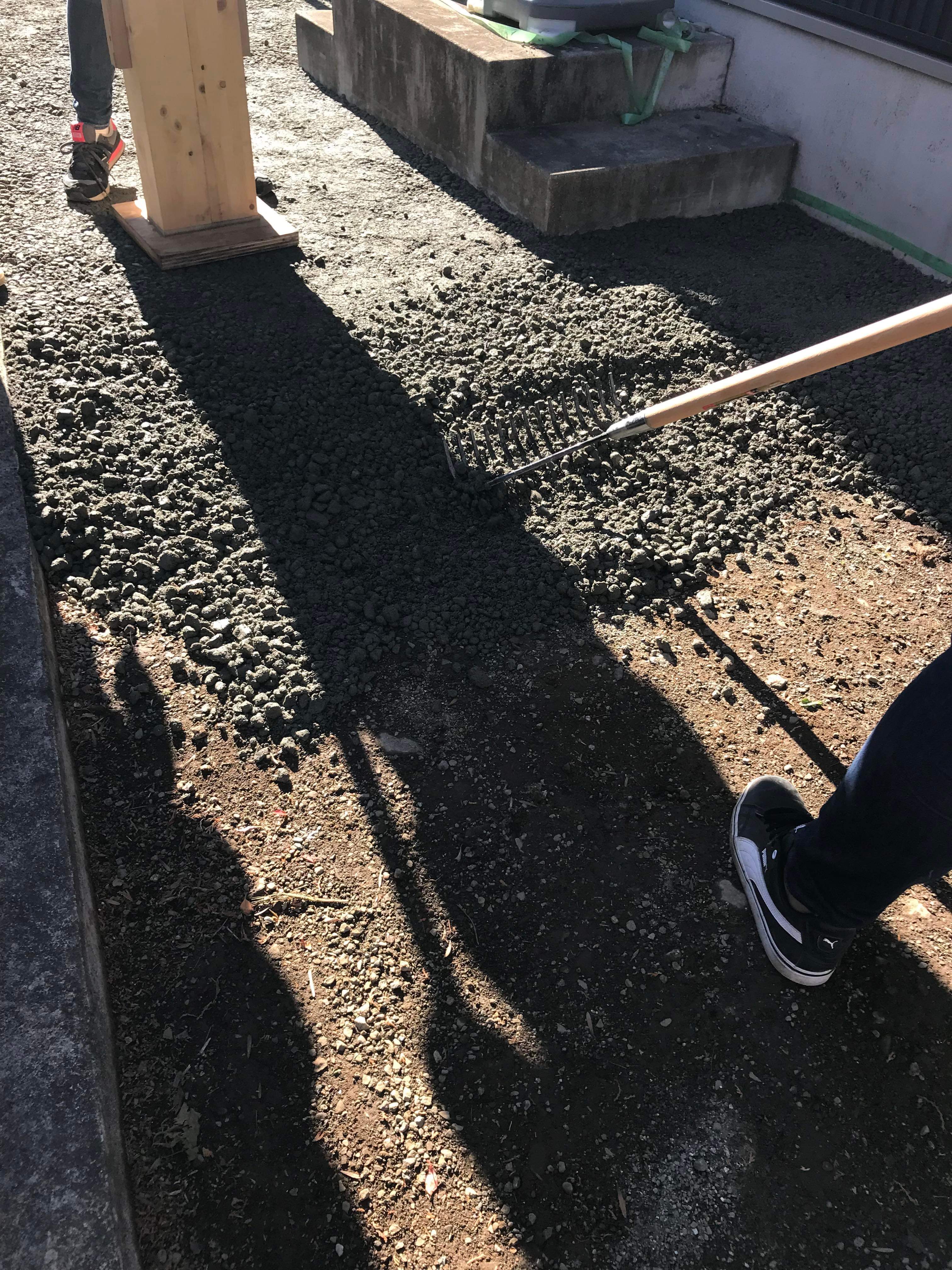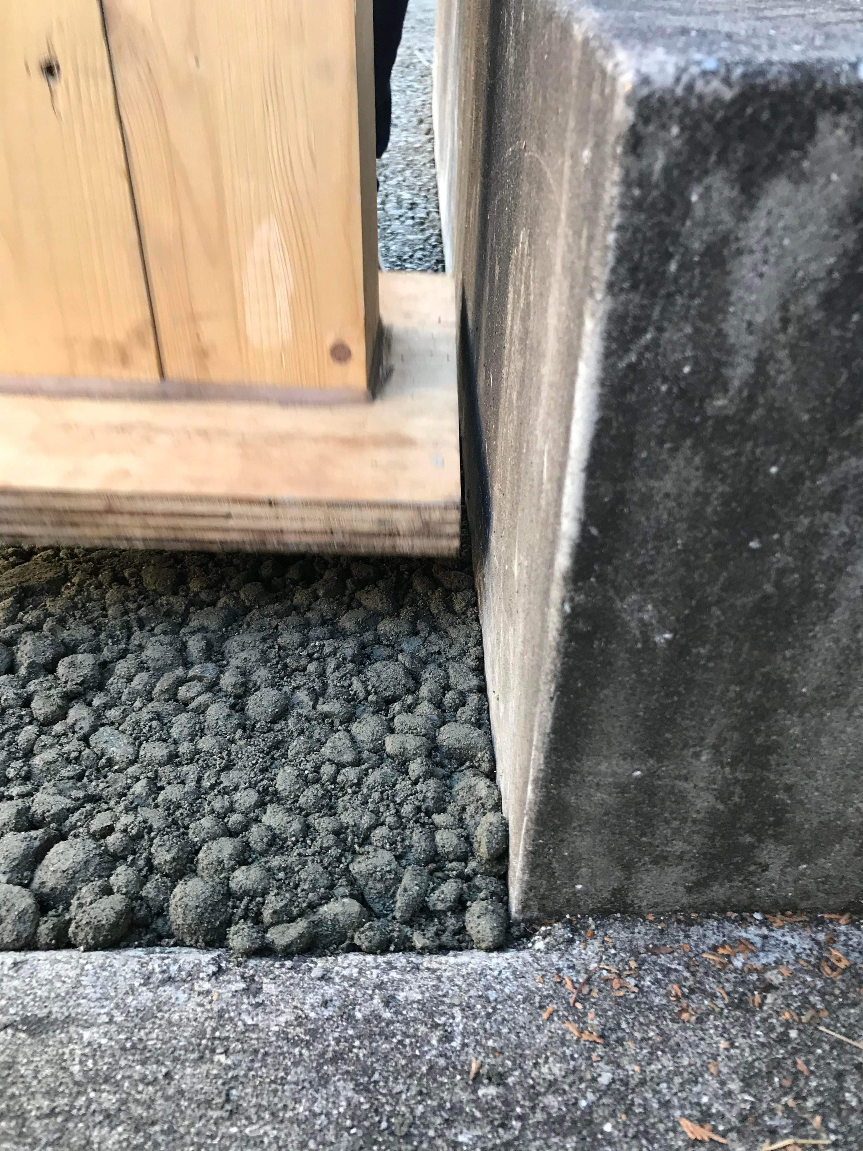 神奈川県小田原市。オワコンDIY施工。庭へのアプローチ部分と犬走の雑草対策に悩んでいろいろ調べていた。真砂土も候補にあがったがコケが生える可能性がある。土間コンは値段が高い。オワコンだと安くできるということで即採用。(透水性夫さん共有)