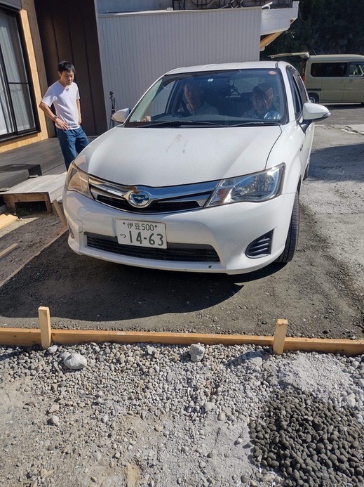 簡易駐車場オワコン(50mm)施工直後に車両が乗り入れている様子