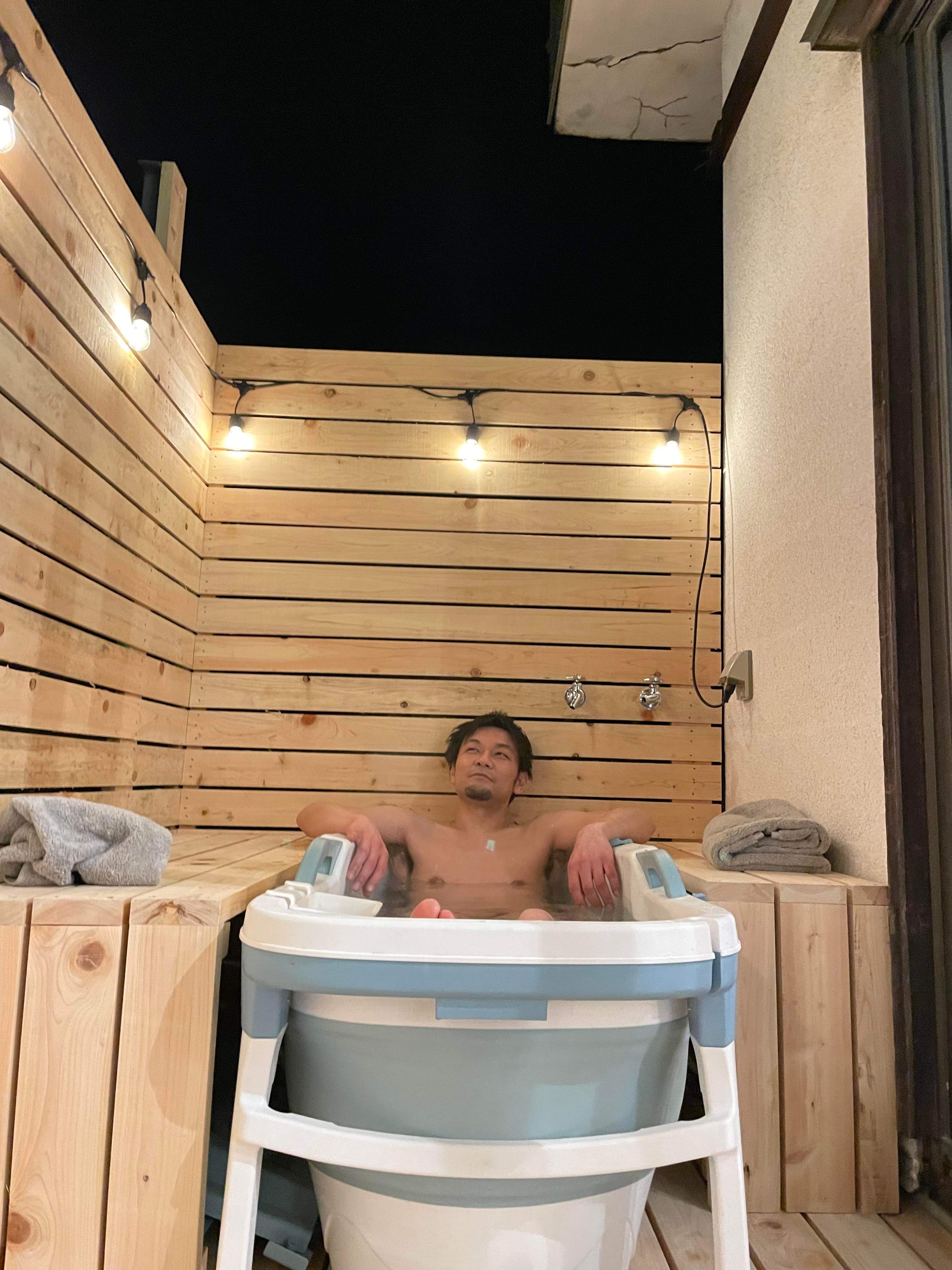 ・屋上 ガーデンスペース(ガーデンバー・キッチン、温泉露天風呂兼プール、焚き火台、庭キャンプグッズ一式、ソメイヨシノの巨木がかかっており、春には絶景)