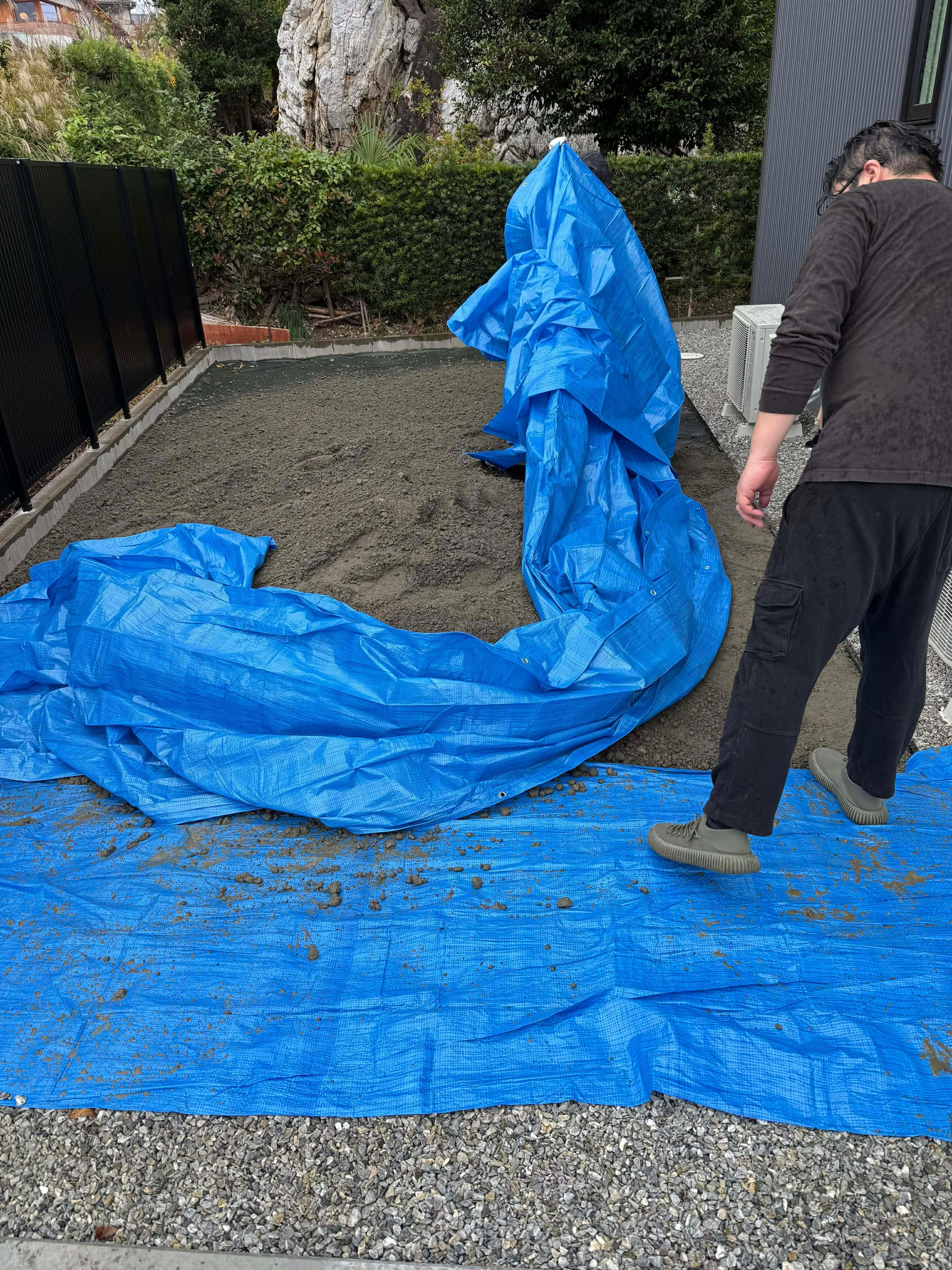 小さいスコップは設計の方が貸していただきなんとか材料はおろしましたが そこから雨が降ってきてとりあえずブルーシートをかけて近くのホームセンターに一輪車等購入されるとの事でした