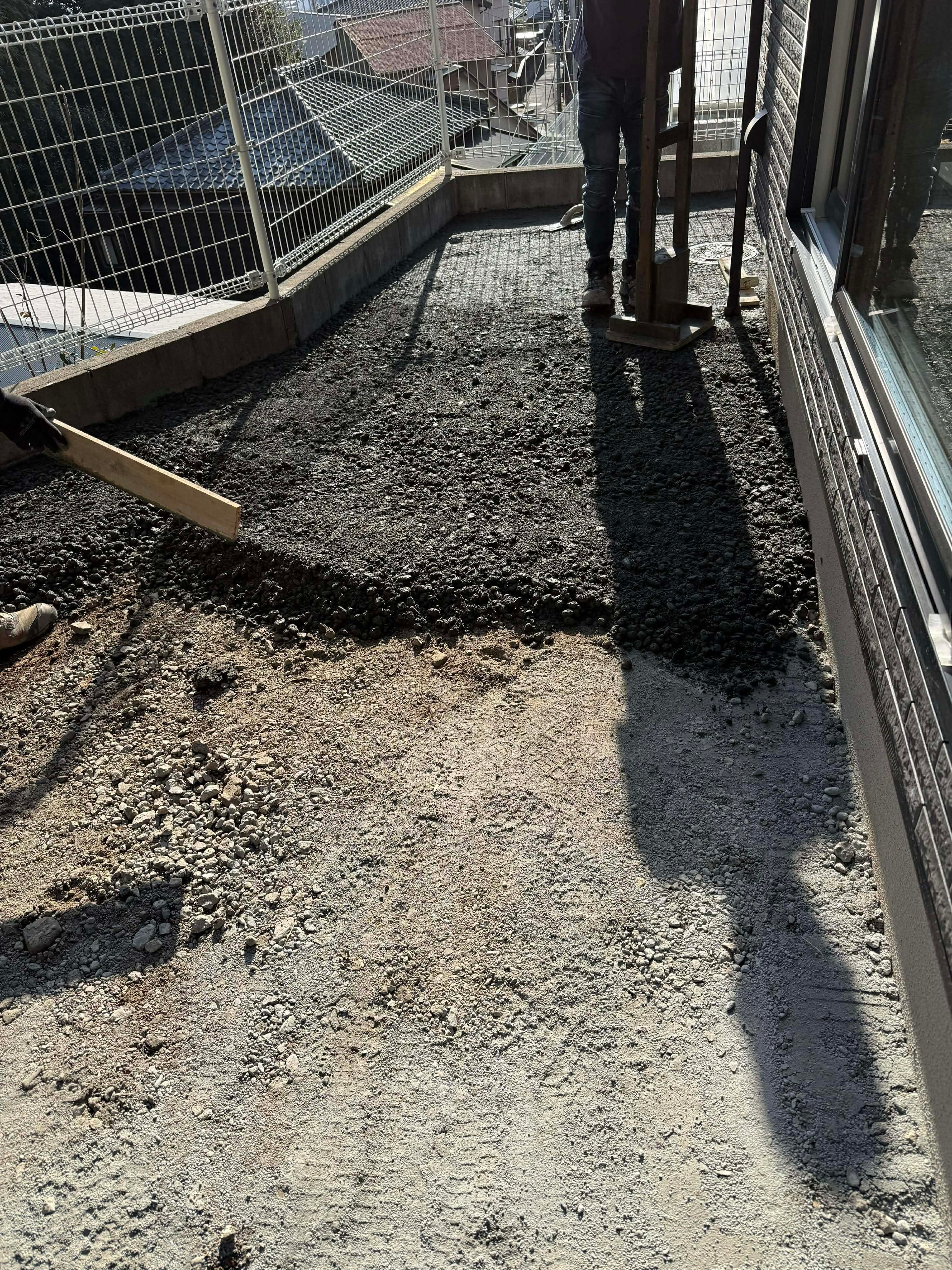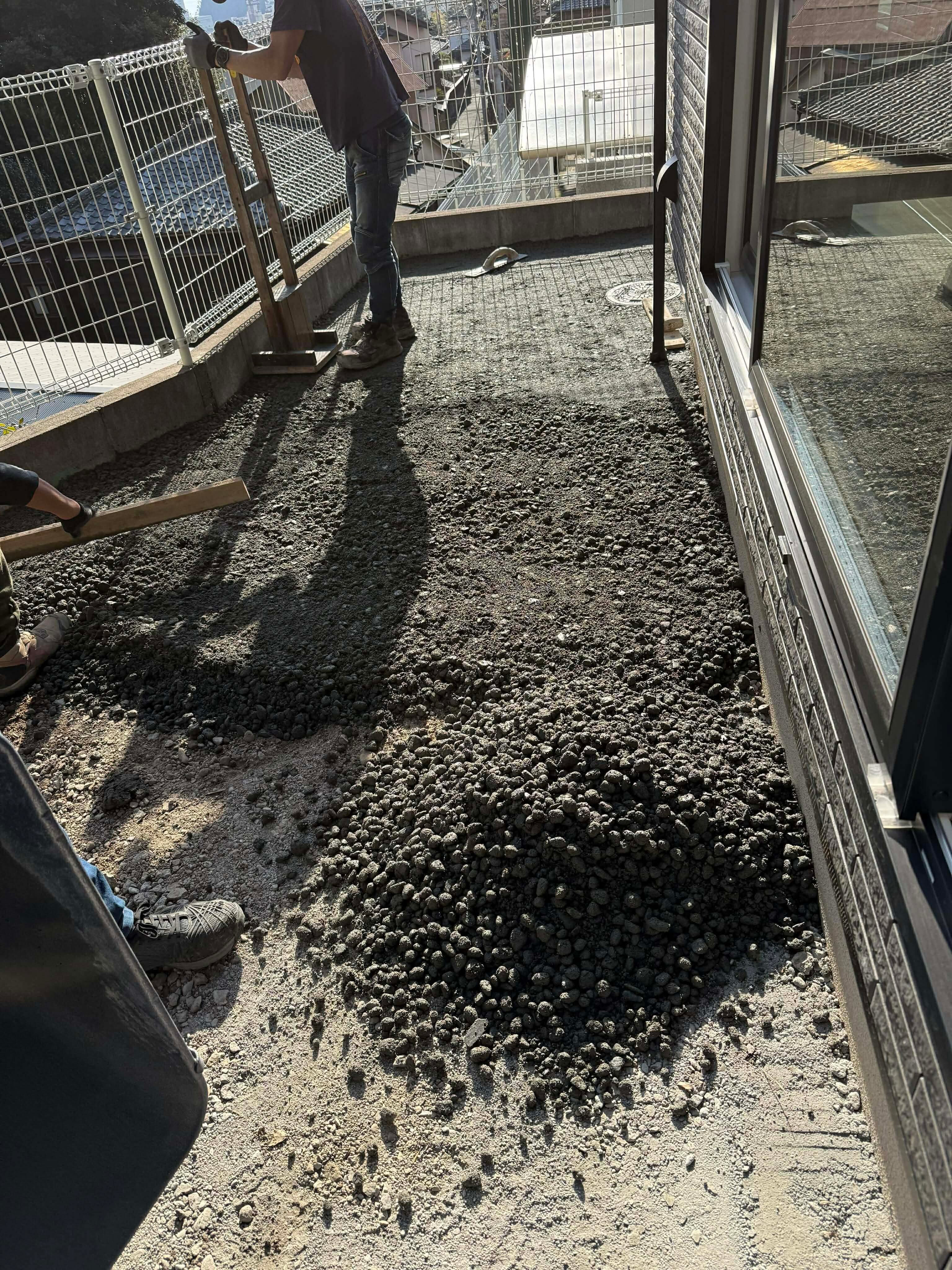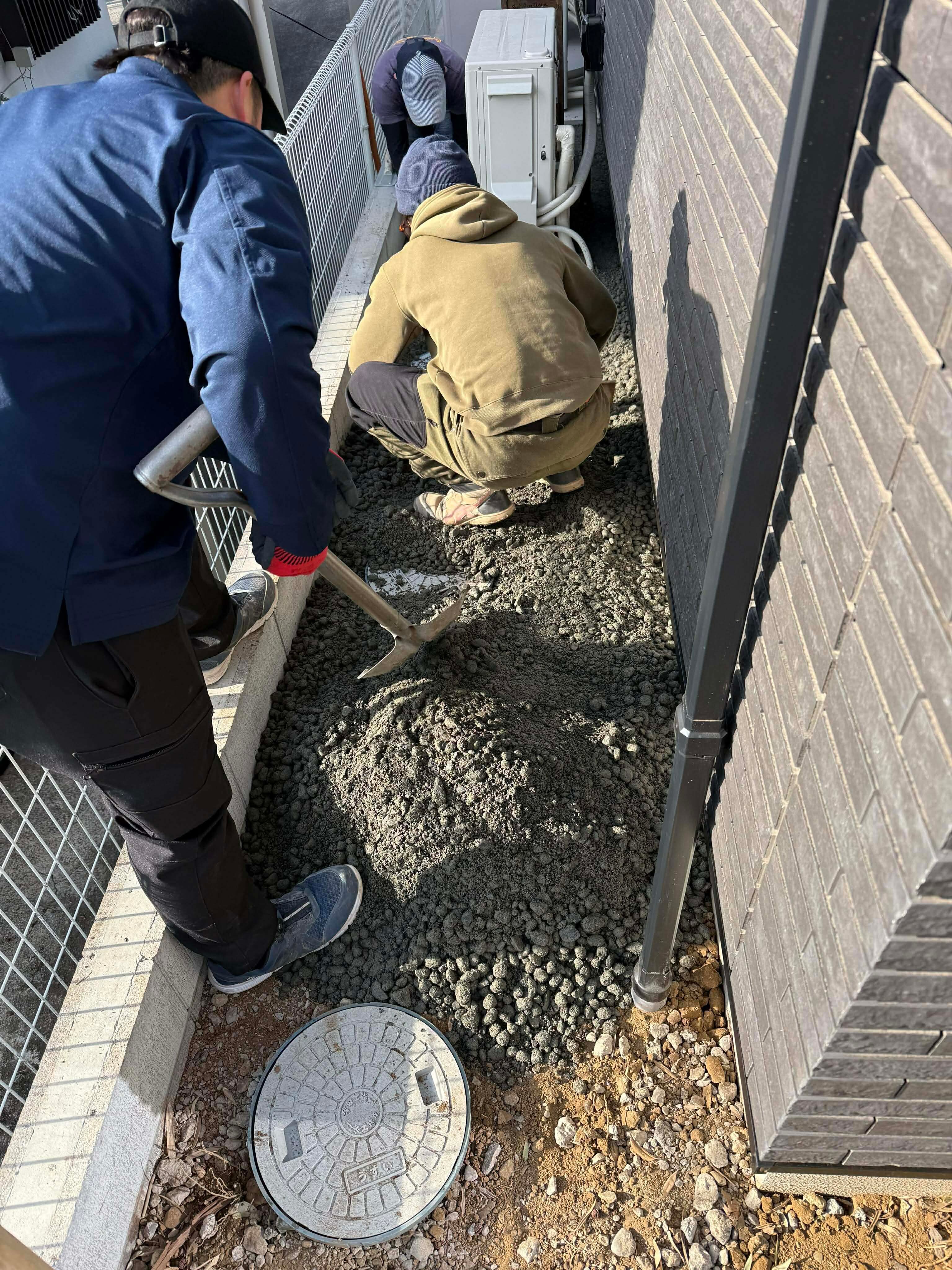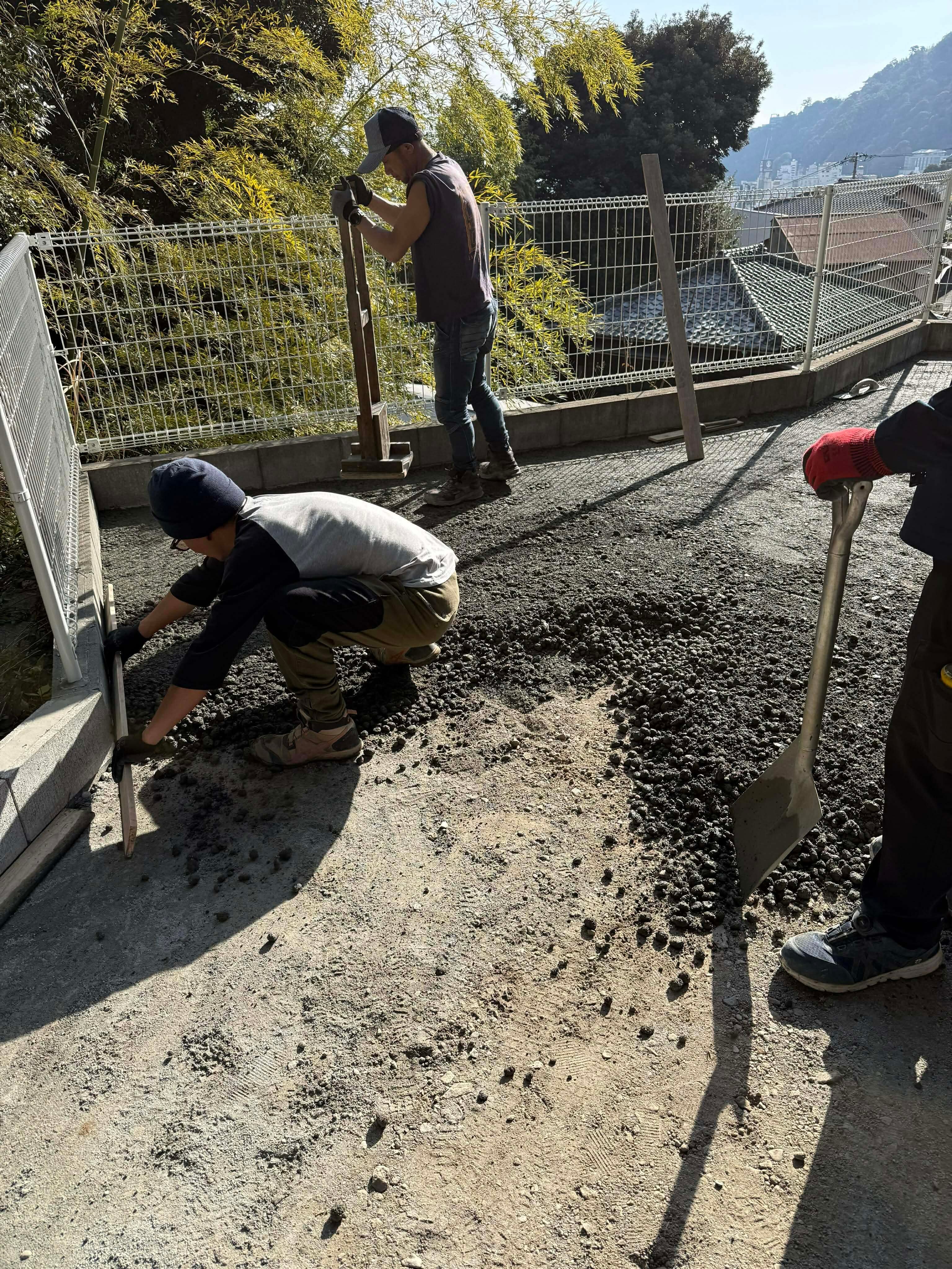 とっても簡単です。か弱き女性が作業に参加しています。だって、「敷き詰めるだけ」で完成してしまう土間コン™︎ が防草や排水にお役立ちの オワコン®︎まさ固®︎ なんです