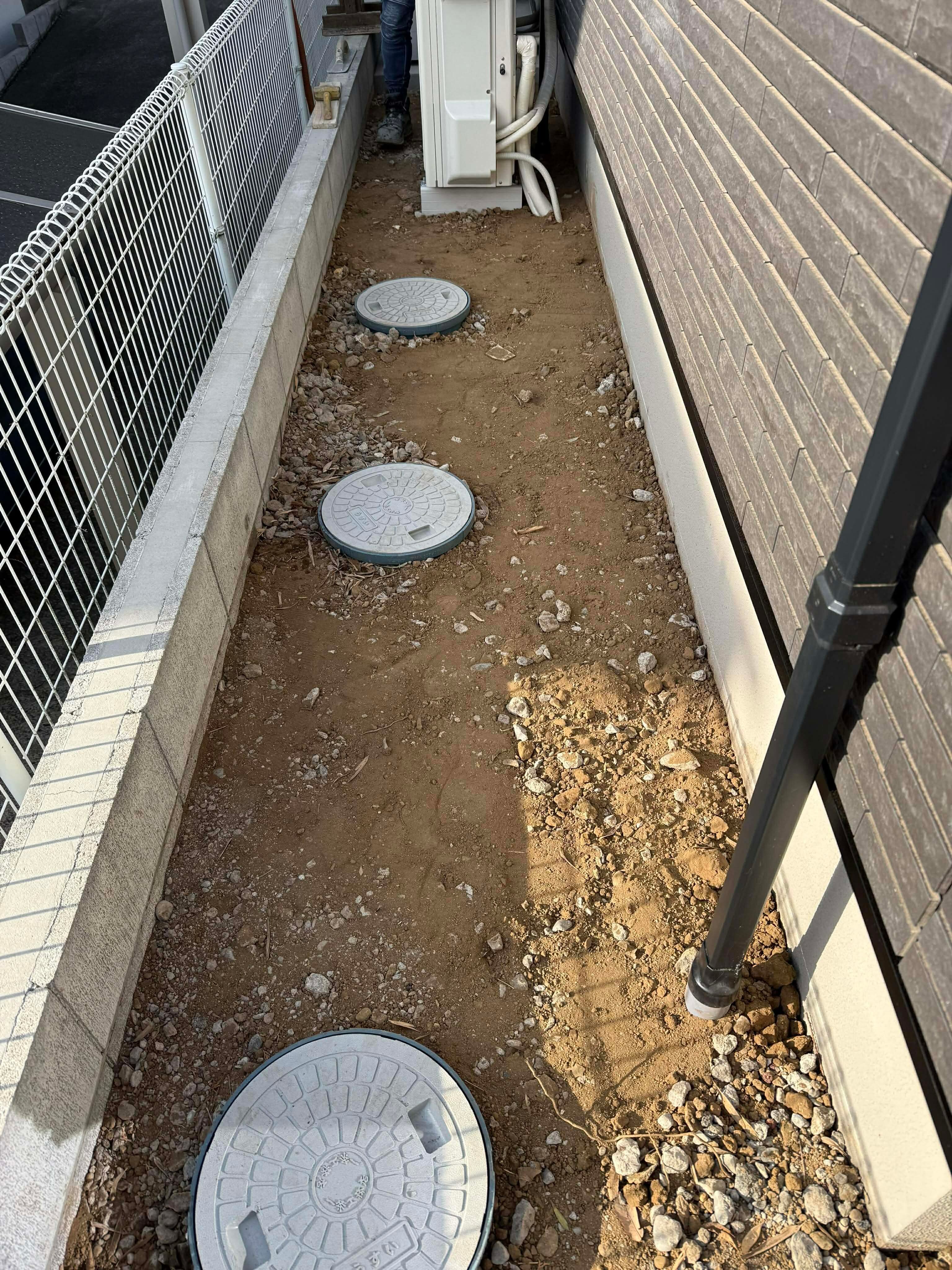 放置しとくと、雑草、害虫、猫の糞害などに見舞われ、コンクリで埋めちゃうと今度は大雨の時の冠水を気にしなくてはならない。家周りのここは全くめんどい場所、犬走りと言います