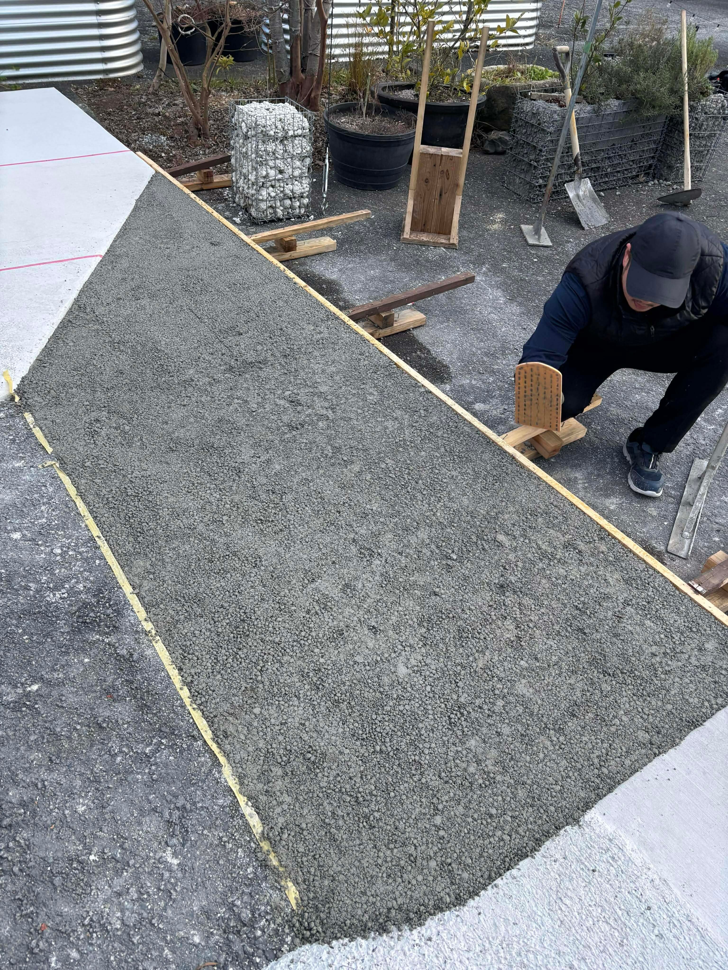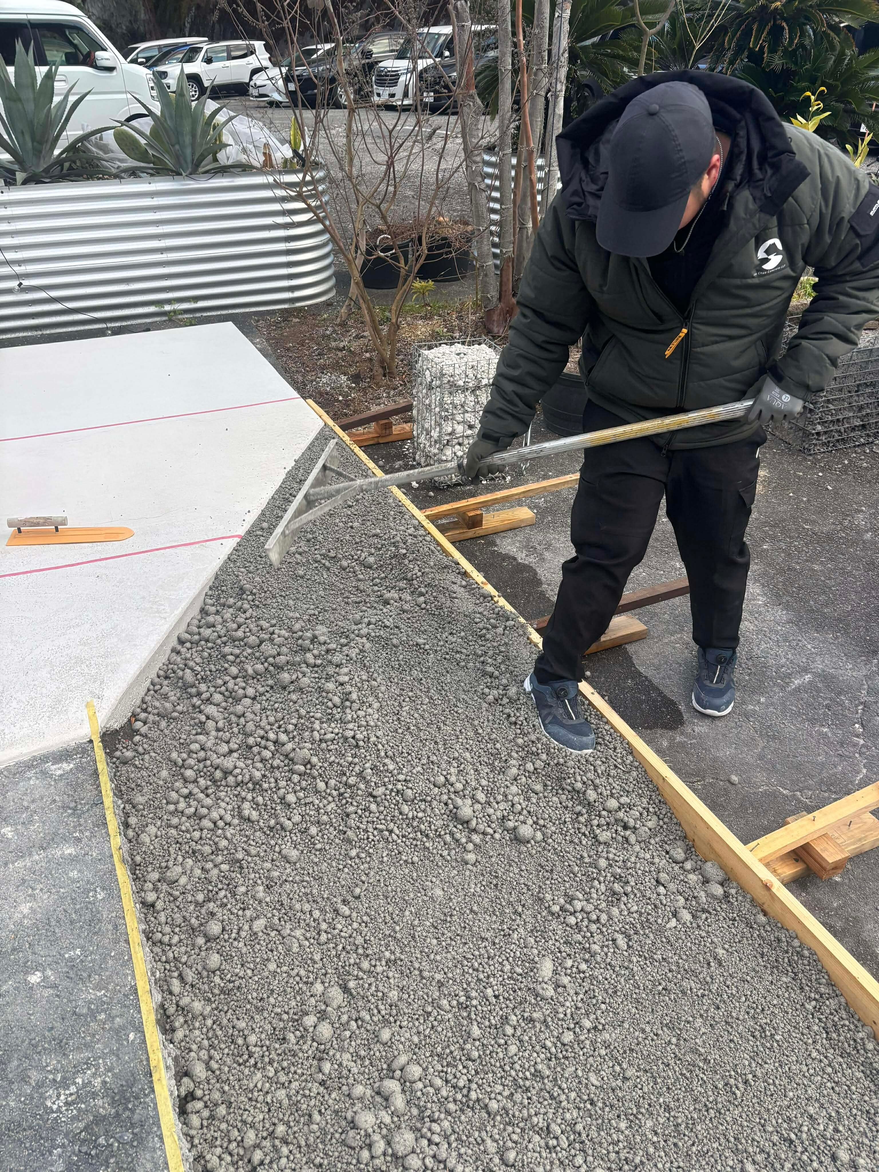 こちら、ナマコンバレーの展示場には 土間コン™︎ が設置されるものの、全て設置してしまうと排水に窮するため部分部分(パッチワーク状)に オワコン®︎まさ固®︎ や オコシコン®︎ を打設してあります。今回は オワコン®︎まさ固®︎ のご紹介