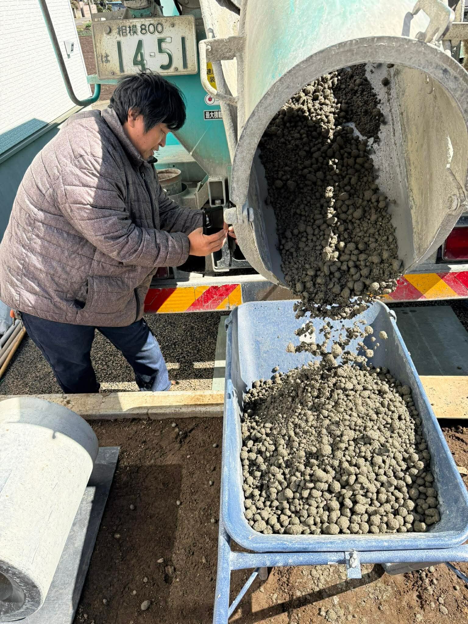 こちらがオワコン®︎まさ固®︎の材料です。生コン車で現場に届きます
