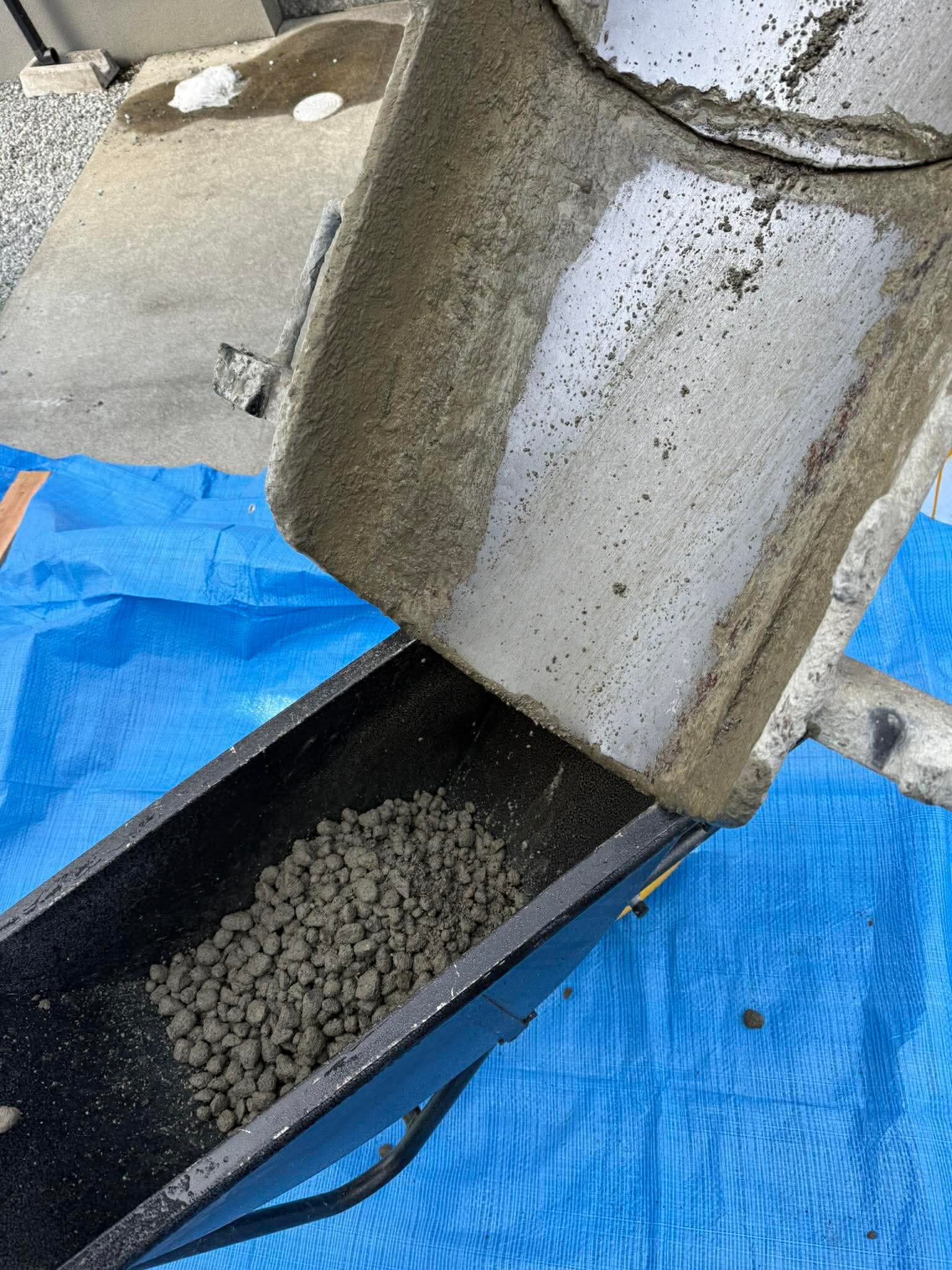 生コン車に乗って送料込みで届く材料(オワコン®︎まさ固®︎)で土間コン™︎が施工されます
