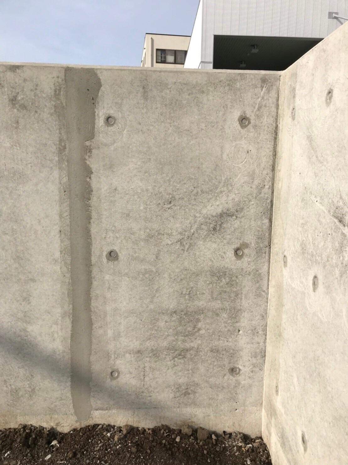 商用施設の外構で色合わせが採用。現場のミスで打ち放し予定の打ち肌に「塗装用の下地」の左官をしてしまった(打放しはそのまま裸で仕上げ、 塗装仕上げは塗装のために左官で凹凸をすべて消す)ため復元。約15平米で10万円。