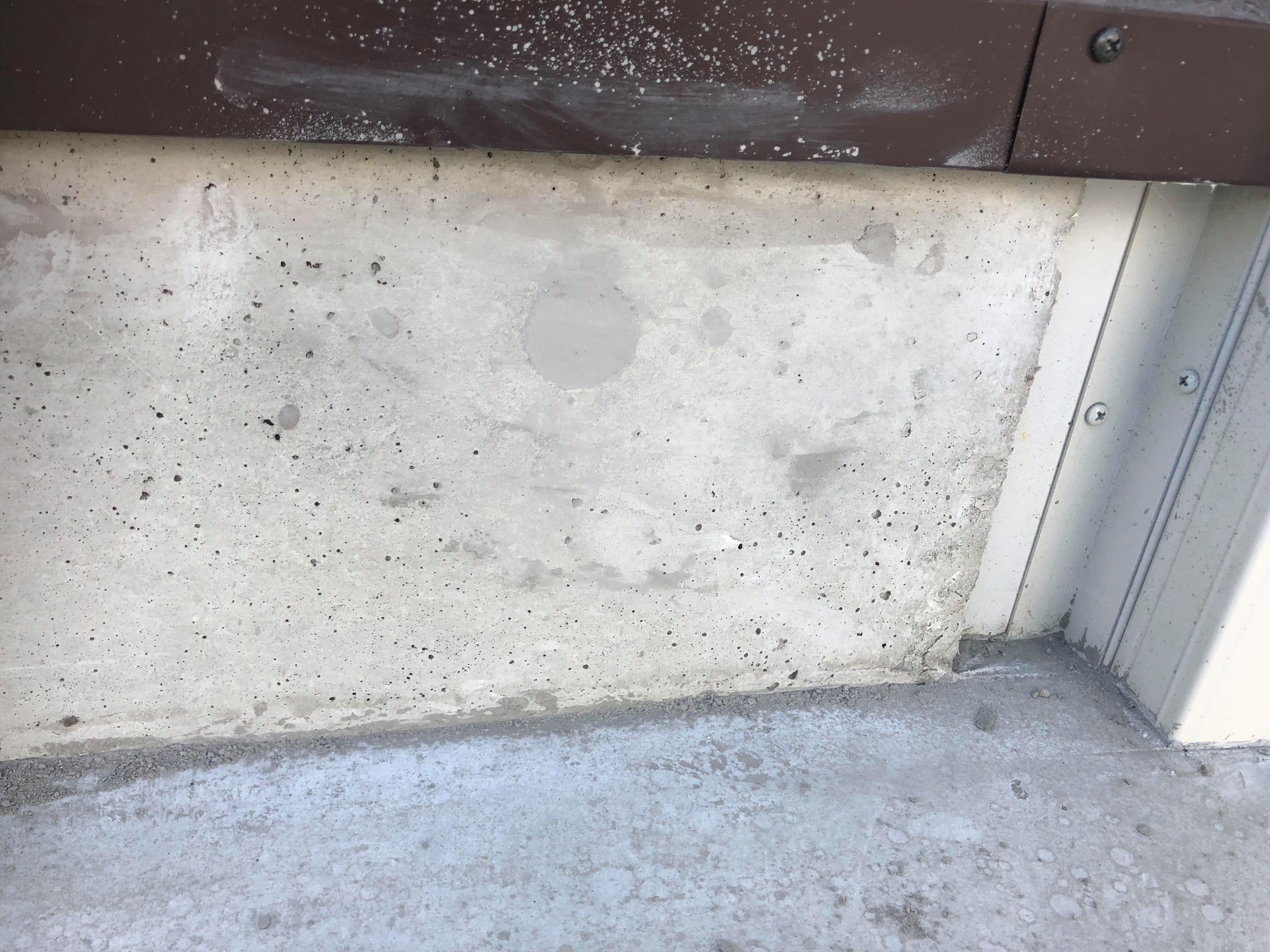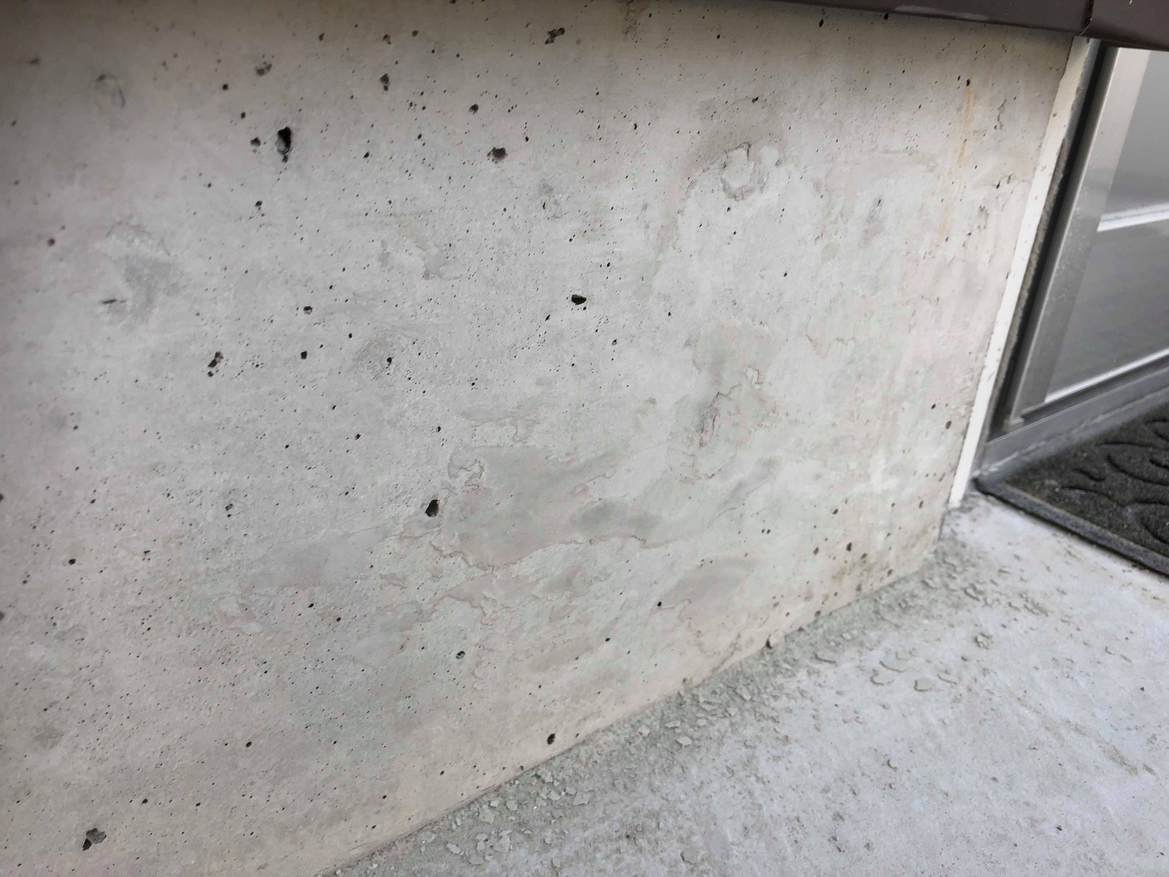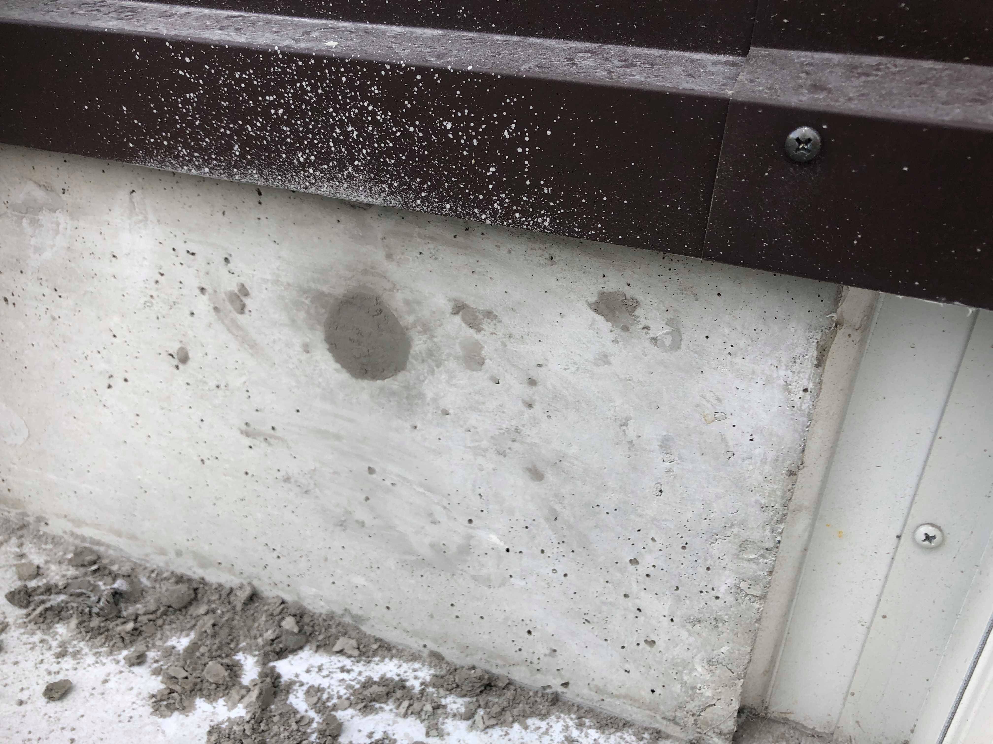 写真手前側(左手)に無数に開いている穴はピンホールと呼ばれる打放しコンクリートで度々問題視される補修対象。