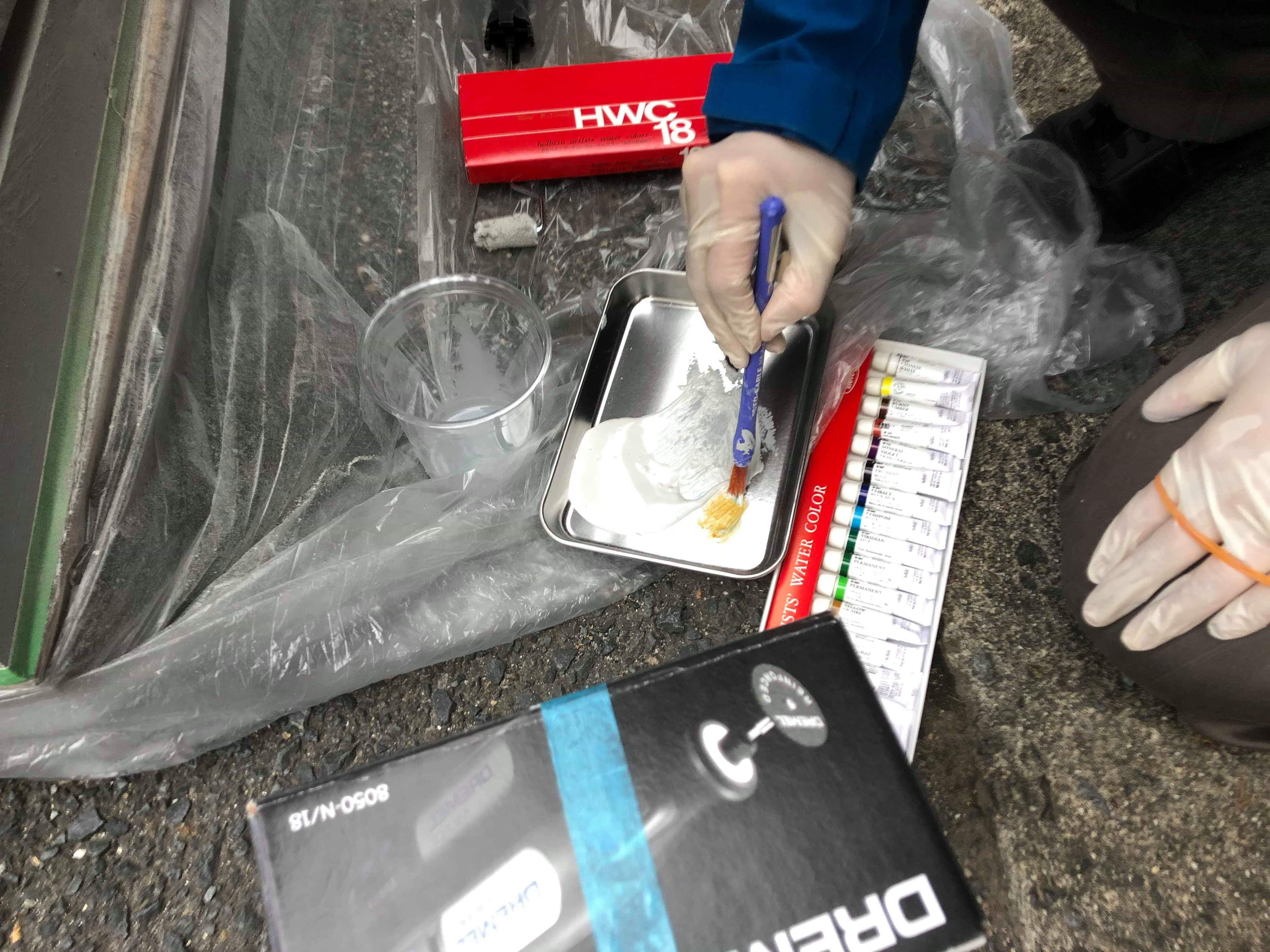 基調色に顔料を混ぜることでなるべくコンクリート色に近い色を探求する。