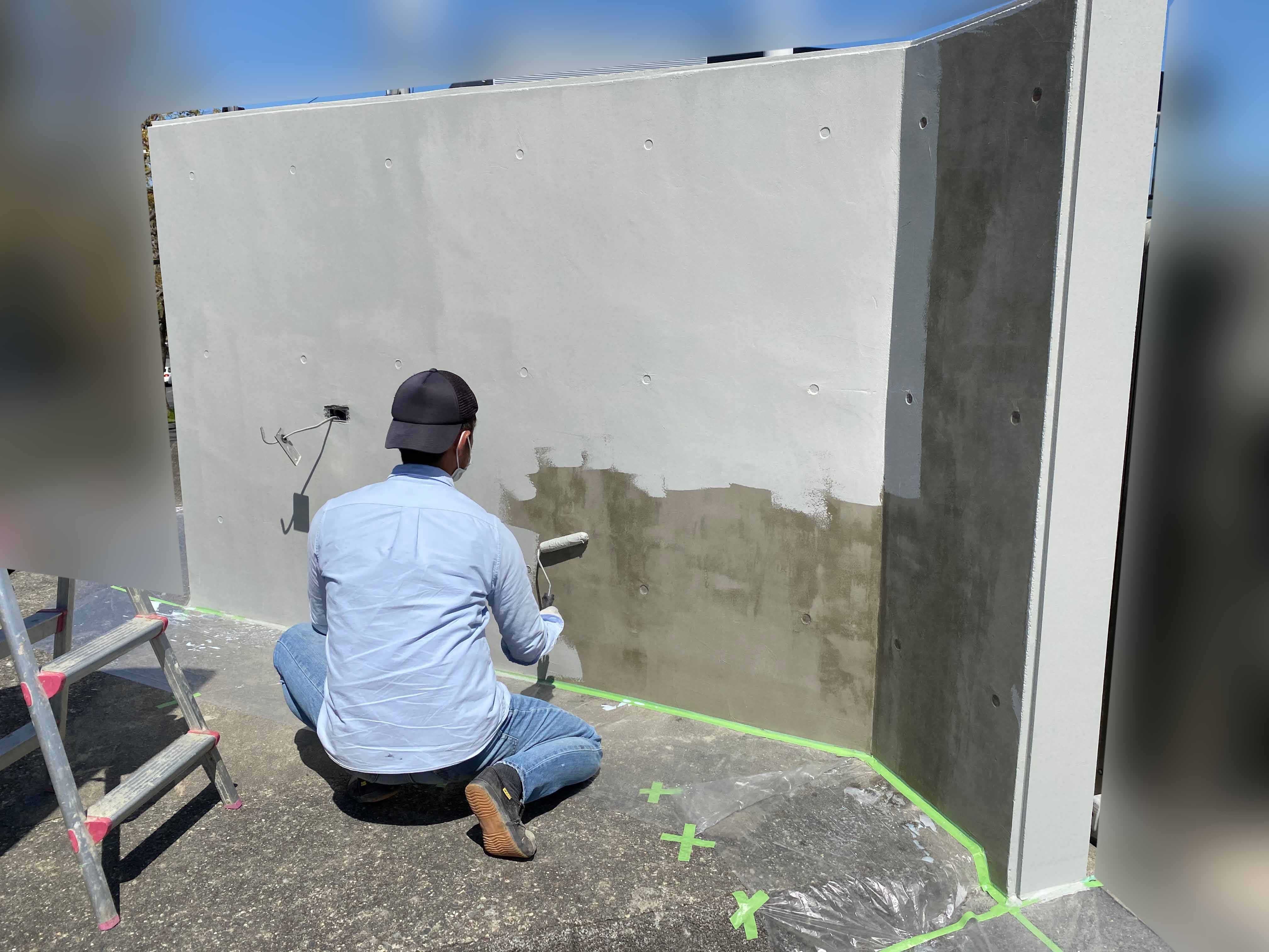 大阪府。打ち放し塗装(全面)の施工。今回は2度目の施工のアイテック(庭コン)による施工。「今回の施工どうでしたか!?」と聞くと代表井上さんから、「下地処理が肝となりますが、下地さえしっかりつくれれば天気次第で少ない人工で完了できます。非常に綺麗に仕上げることができましたし、久しぶりにやっていて『楽しい!』と思える仕事でした」。