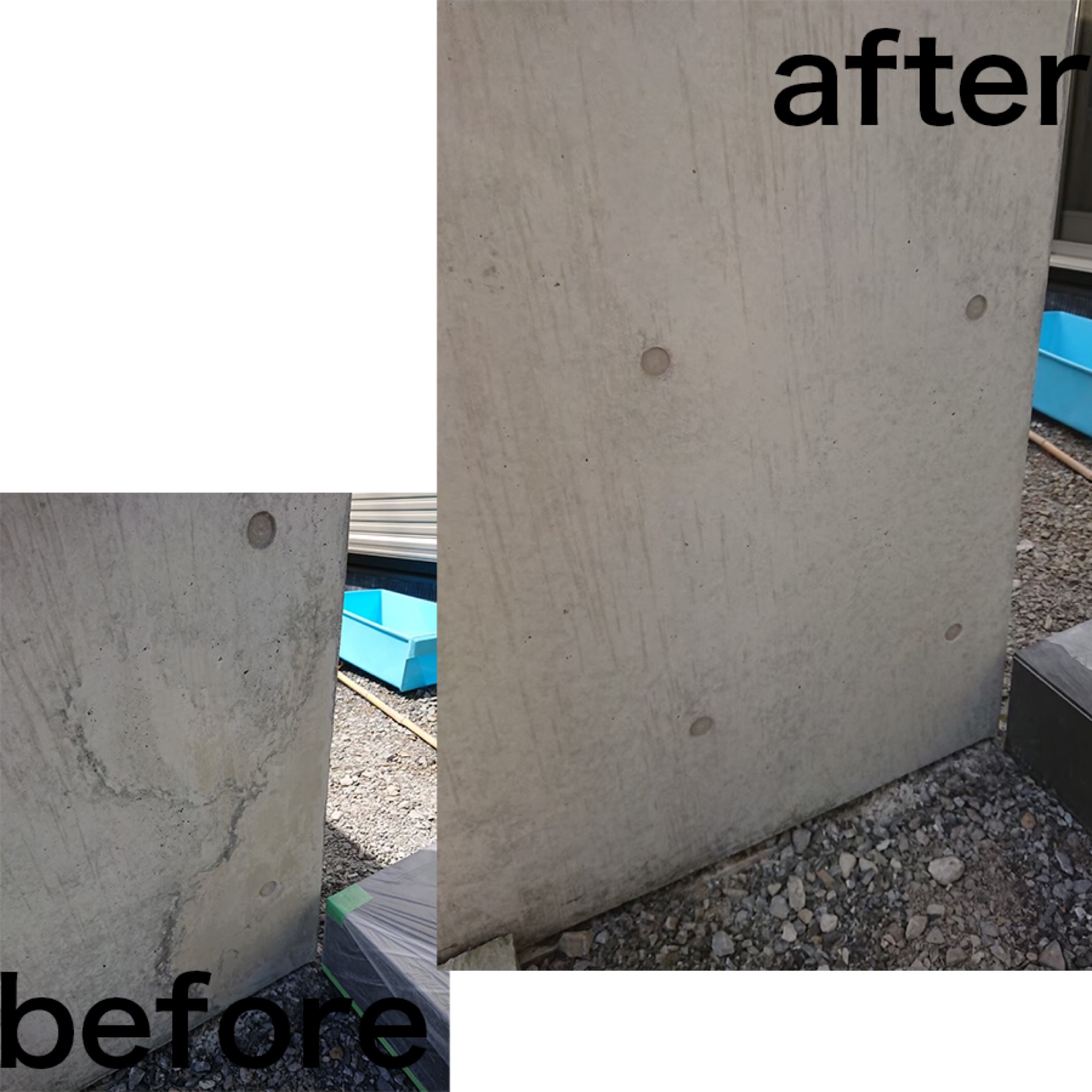愛知県の現場。GL(グランドレベル)付近に打ち継ぎに近いムラが発生したため色合わせ補修しました。外構擁壁。「エクステリアのコンクリートで厄介なのは土間コンだけ?」。そんなことはない。仕上げをしないコンクリート「打ち放しコンクリート」はあらゆる場所で見た目の問題を引き起こす。