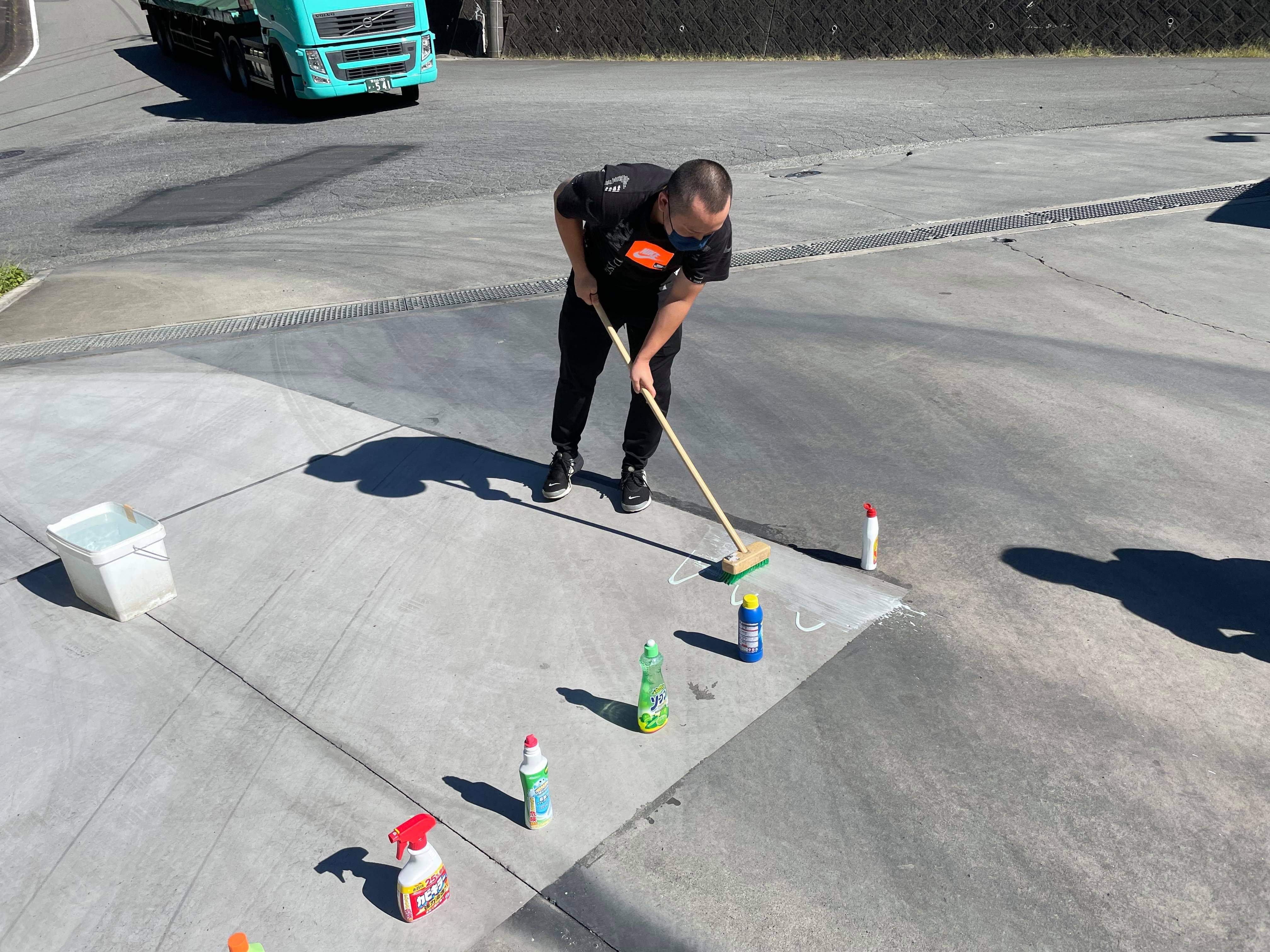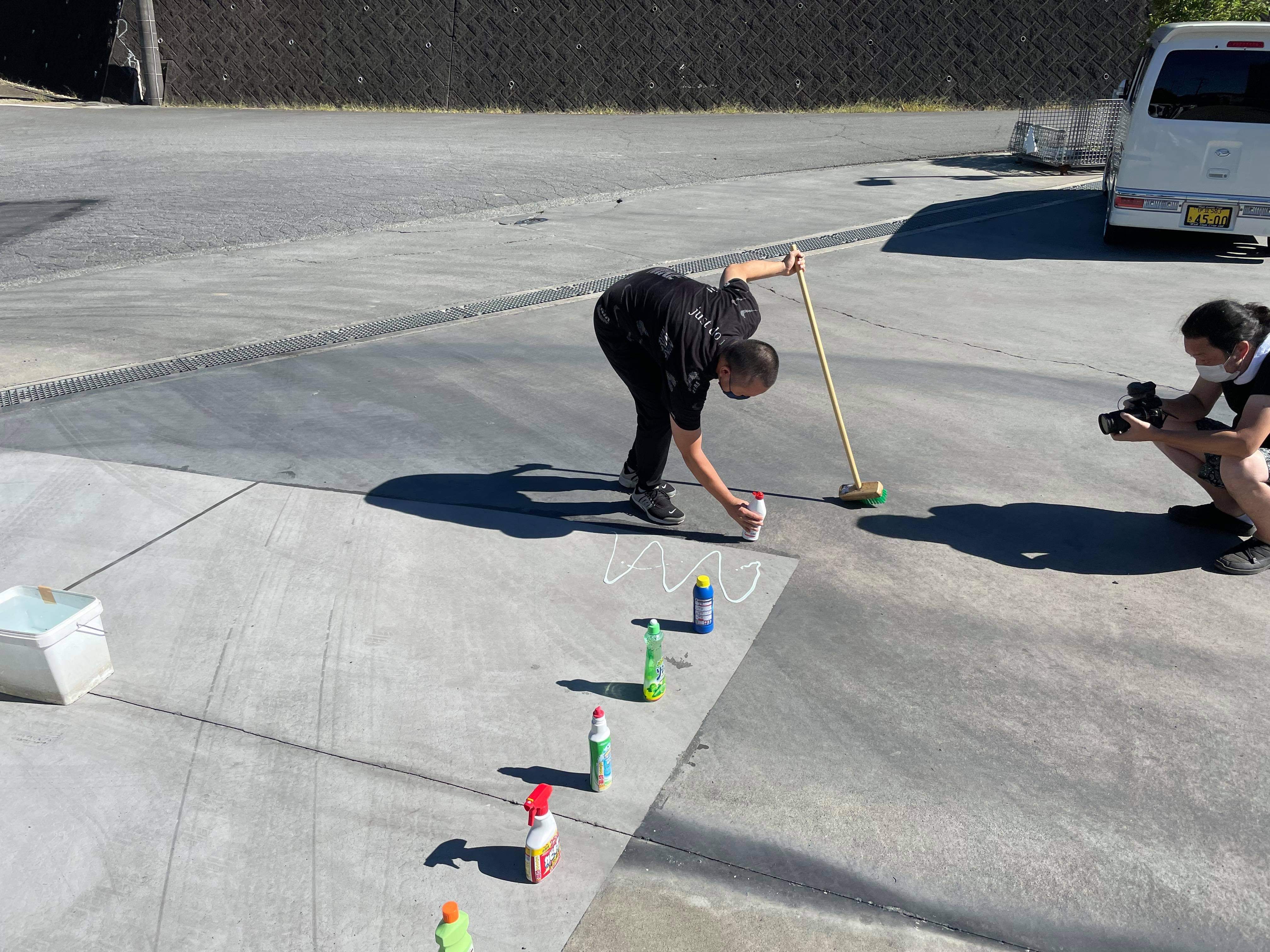 灼熱地獄の中で8種類の洗剤を用いてデッキブラシでゴシゴシ。